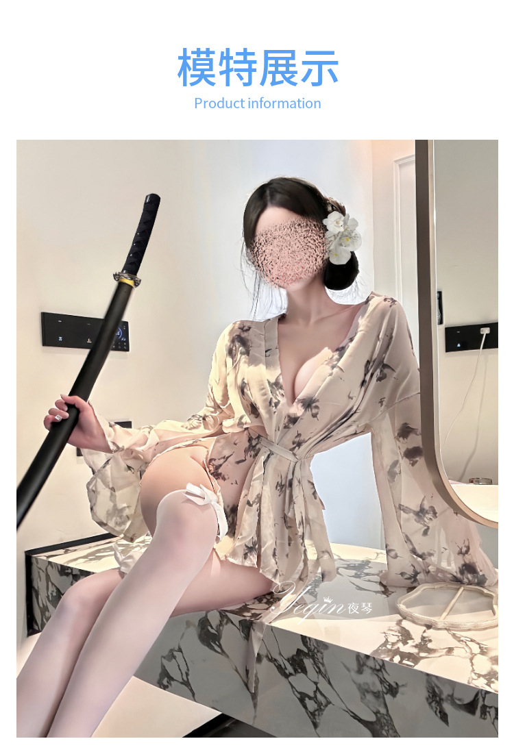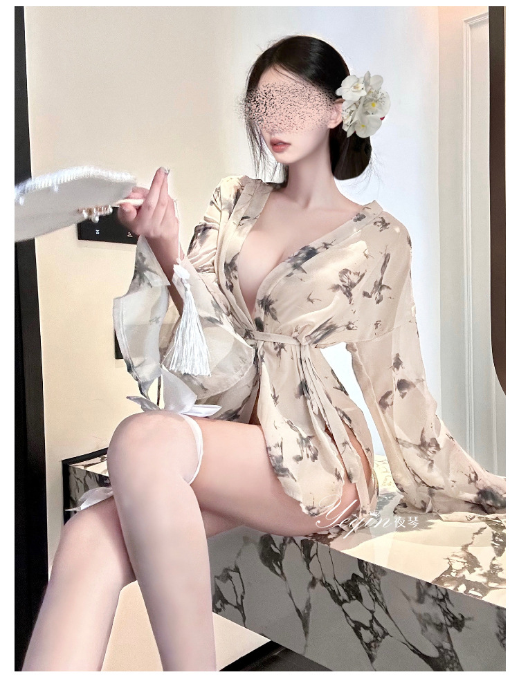 야기 섹시 속옷 작은 가슴 매력적인 여성 섹시한 나비 프린트 시스루 딥 V 기모노 잠옷 잠옷 7559