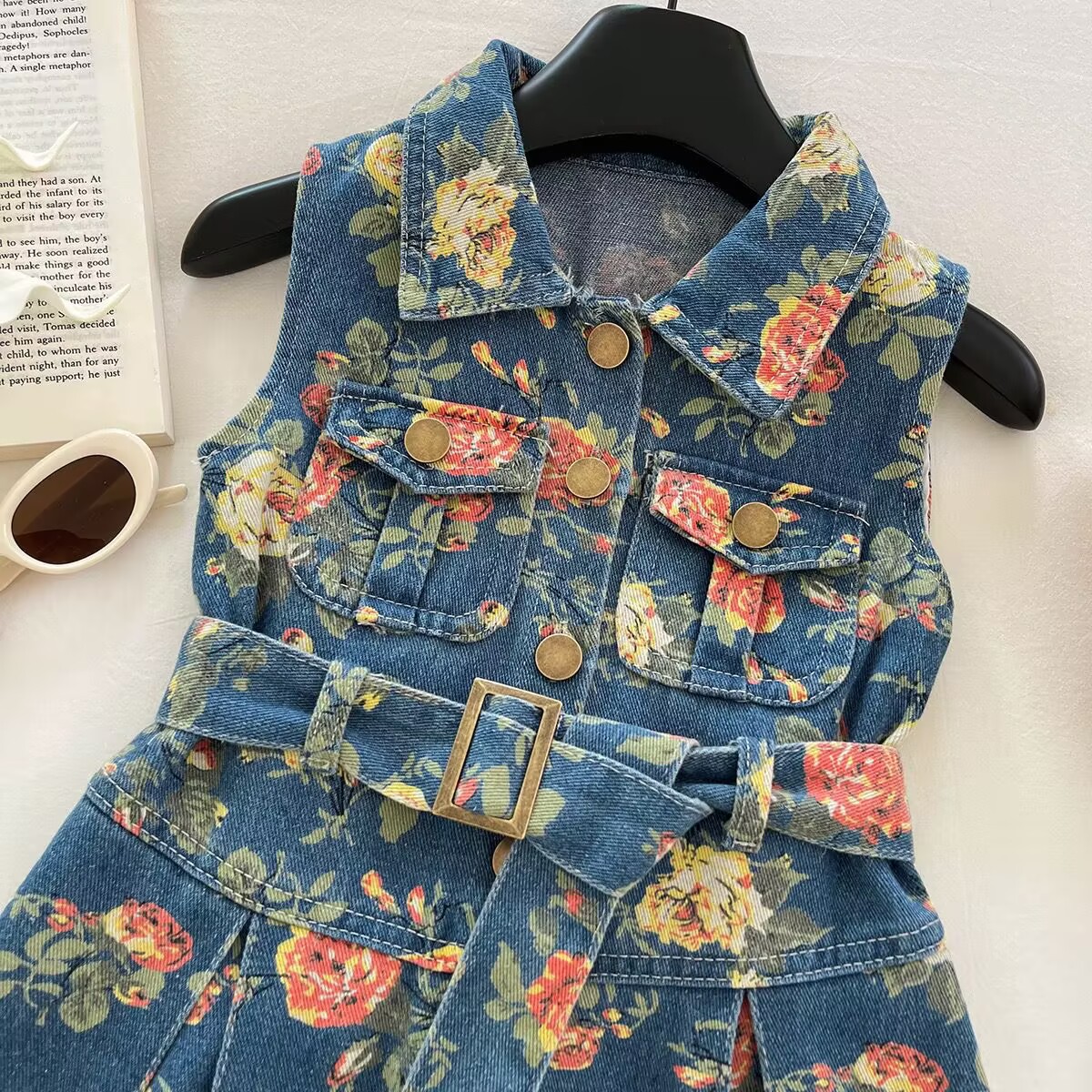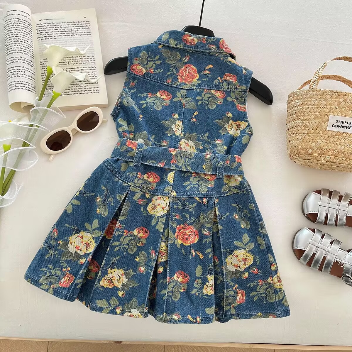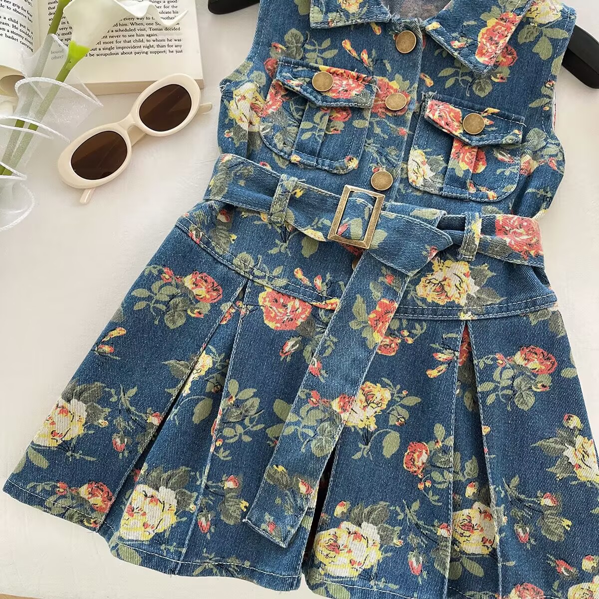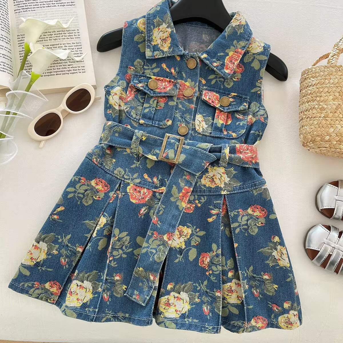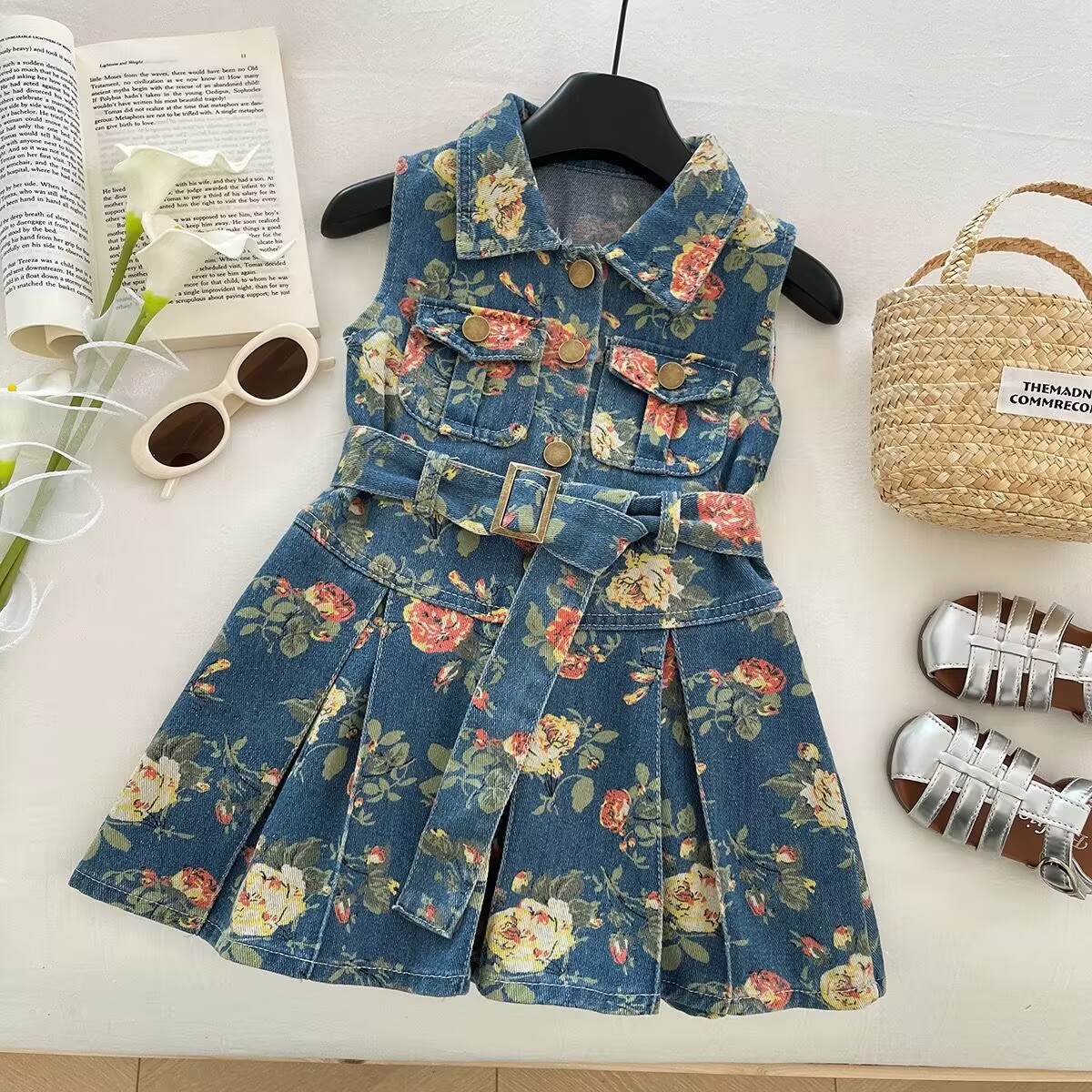 2025 여름 새로운 소녀 데님 원피스 소녀 인쇄 조끼 캐주얼 어린이 치마 국경 머리스토어 가기