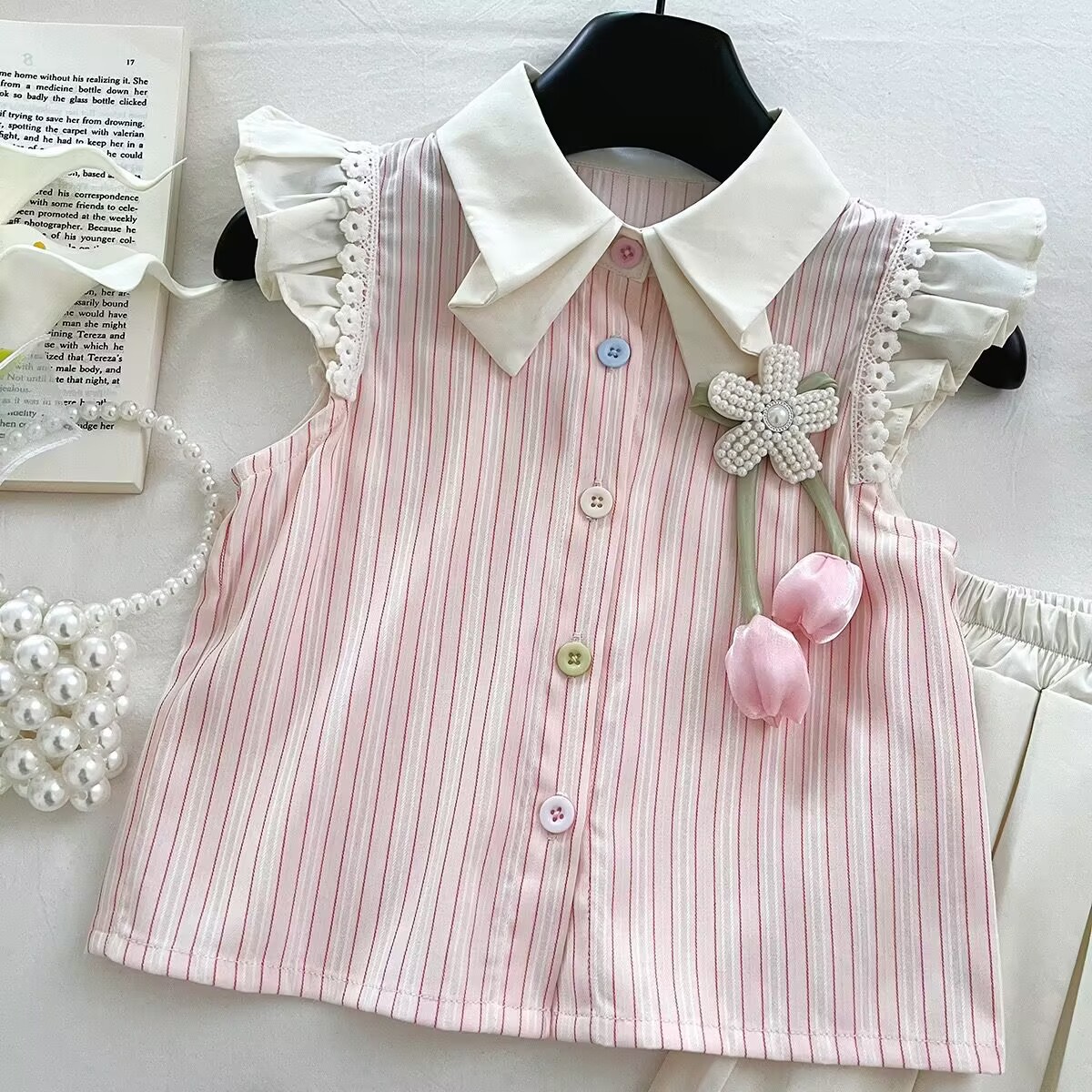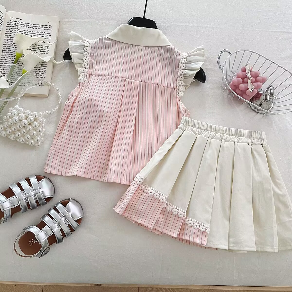 여자 세트 여름 2025 새로운 스타일 플라잉 슬리브 스트라이프 셔츠 레이스 스커트 한국 2 피스 세트