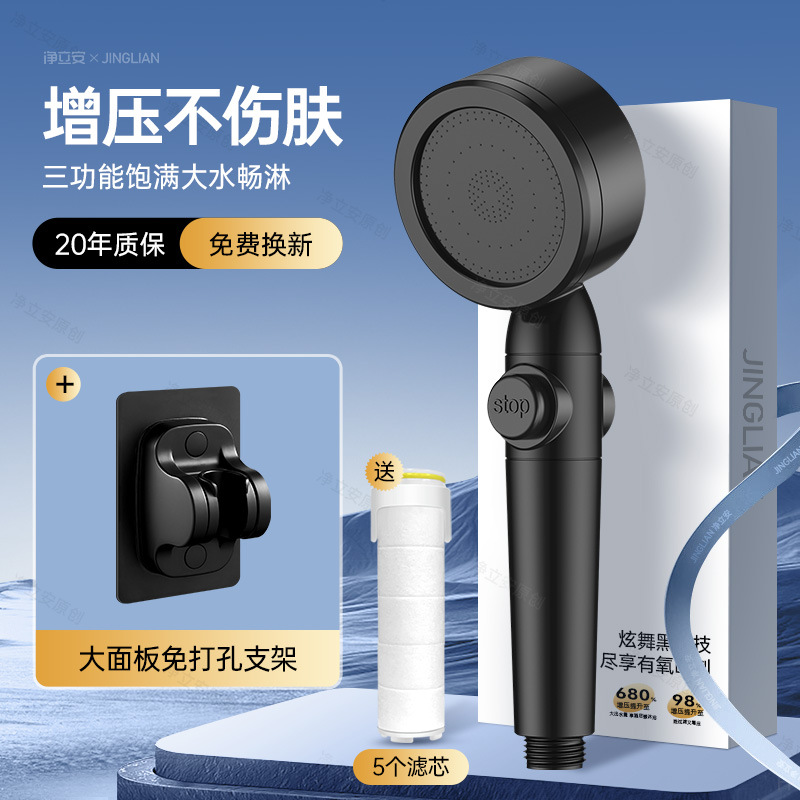 • [우아한 블랙 세트 1] 가압식 샤워기 + 펀치 프리 브라켓 (필터 엘리먼트 5개 포함)