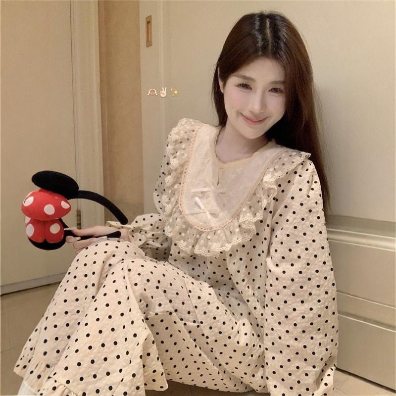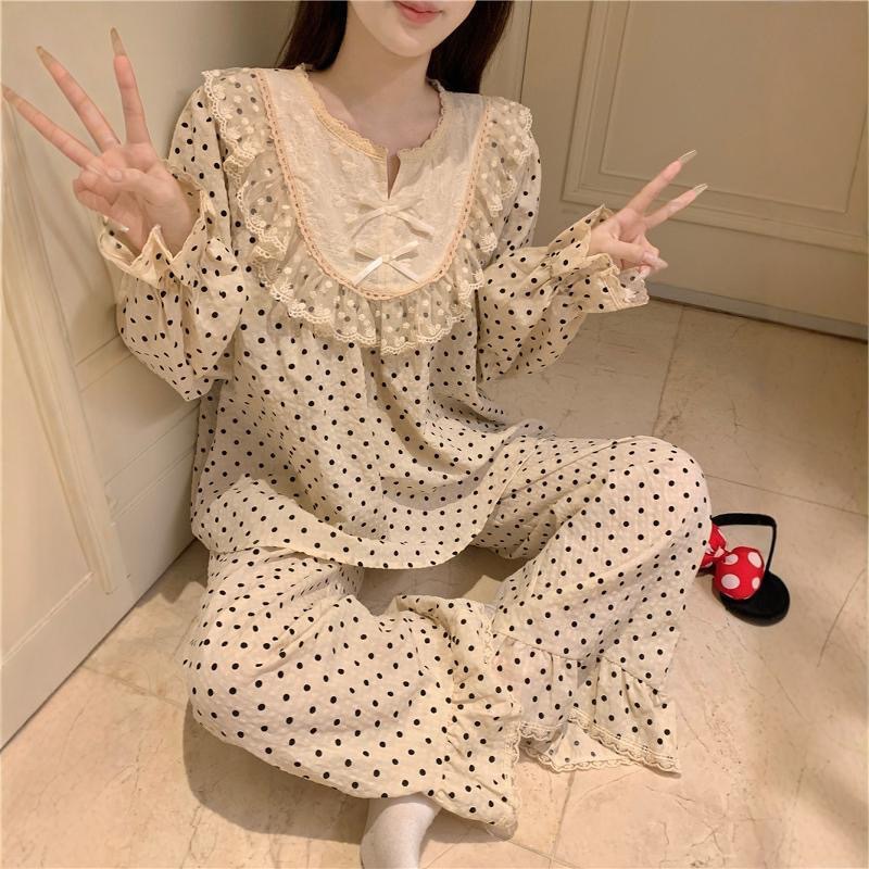 여성을위한 잠옷 봄과 가을 새로운 달콤한 레이스 도트 긴팔 바지 느슨한 캐주얼 홈웨어 세트 124스토어 가기