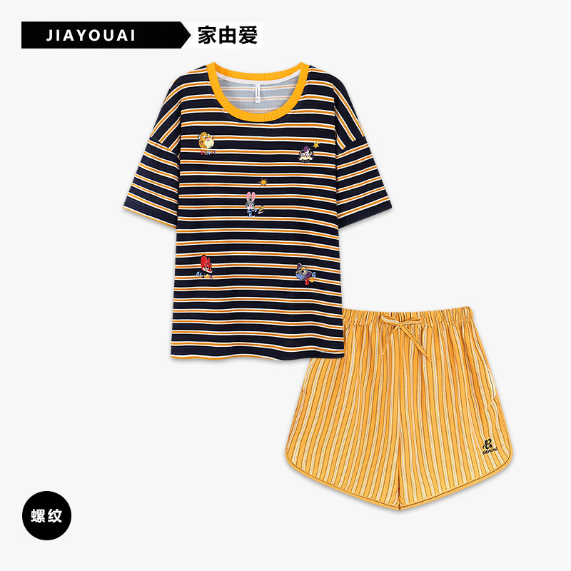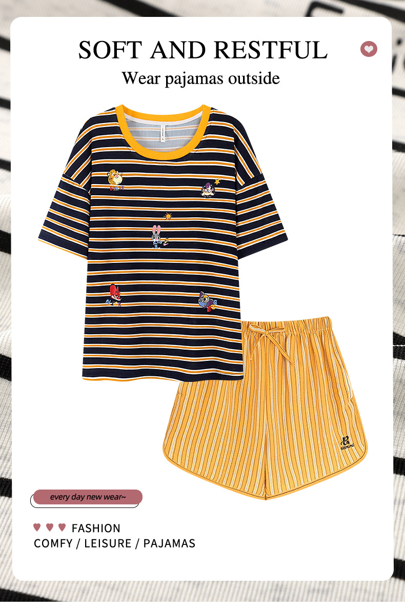 여성용 스트라이프 잠옷 여름 만화 프린트 반팔 대학 스타일 플러스 사이즈 반바지 세트는 얇은 가정복 외부에 착용 가능스토어 가기