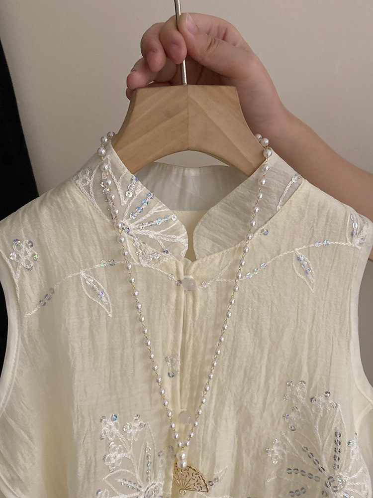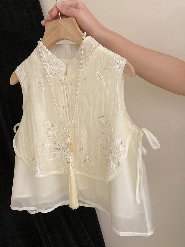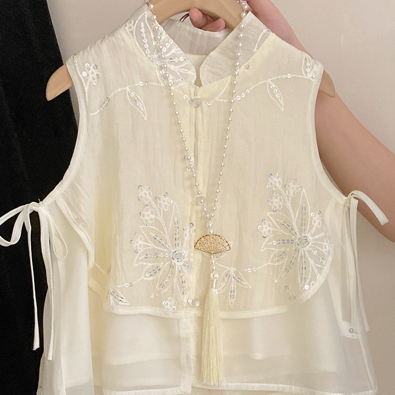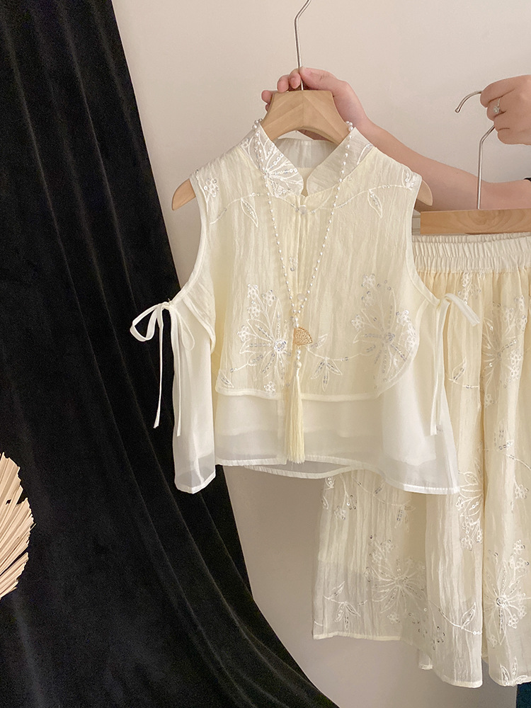 소녀 국가 스타일 새로운 중국 스타일 꽃 바지 조끼 민소매 톱 2025 여름 Sequin Culottes 패션 투피스 세트스토어 가기
