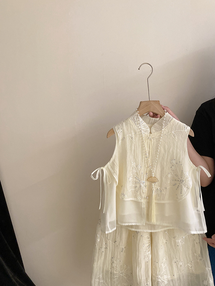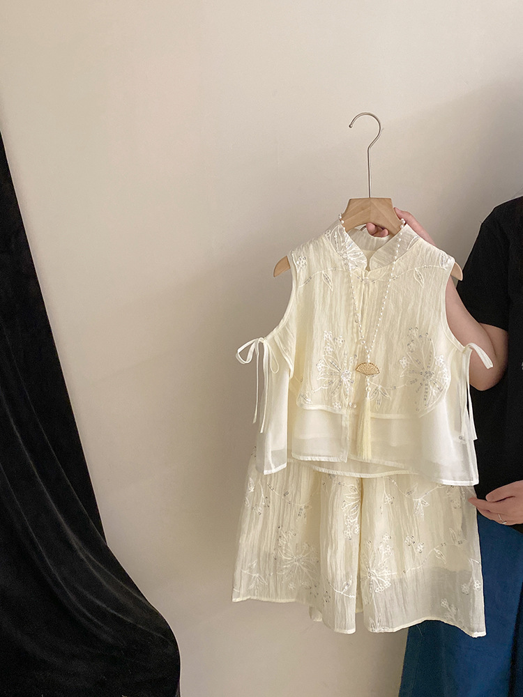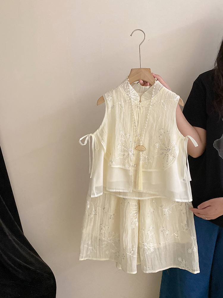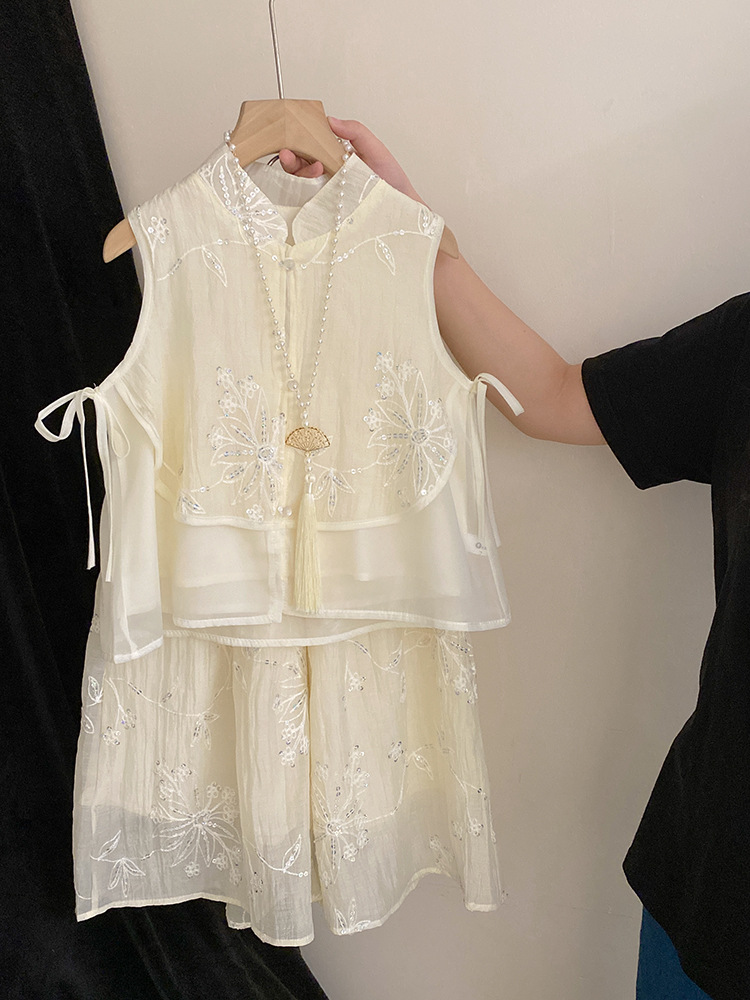 소녀 국가 스타일 새로운 중국 스타일 꽃 바지 조끼 민소매 톱 2025 여름 Sequin Culottes 패션 투피스 세트