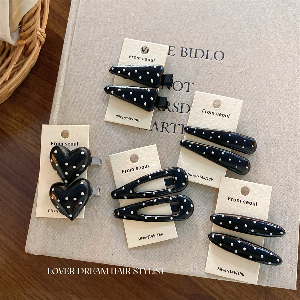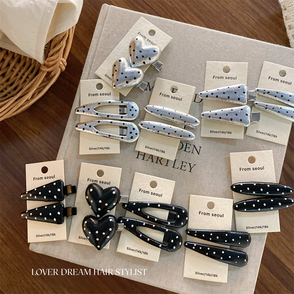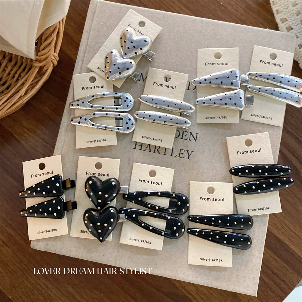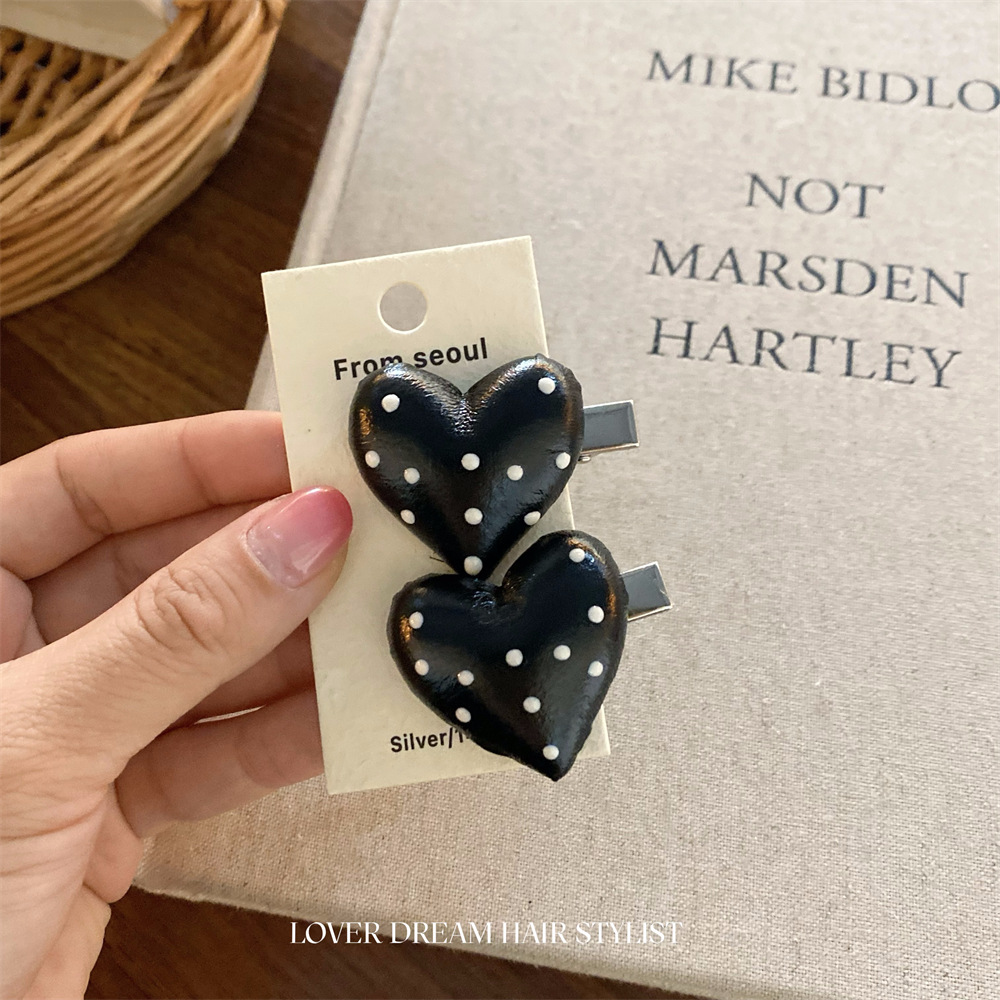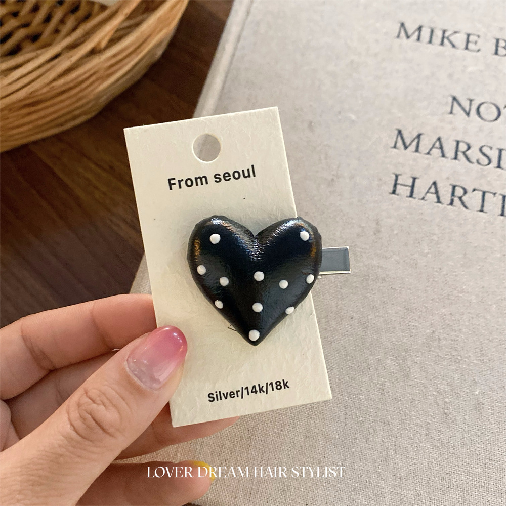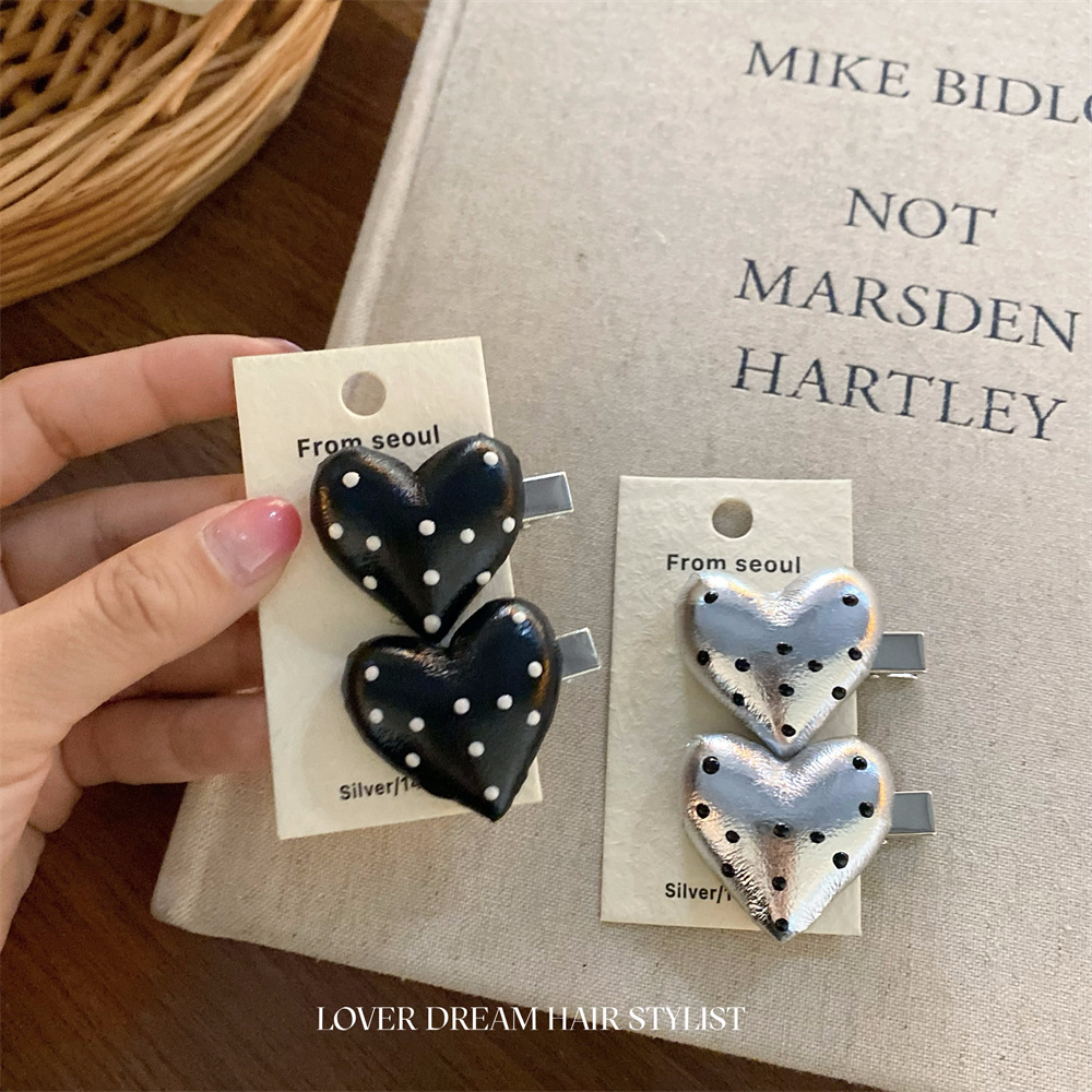 한국 ins 새로운 검은색과 은색 폴카 도트 사랑 모조 가죽 머리핀 세련된 질감 앞머리 클립 머리 장식 여성용 헤어 액세서리