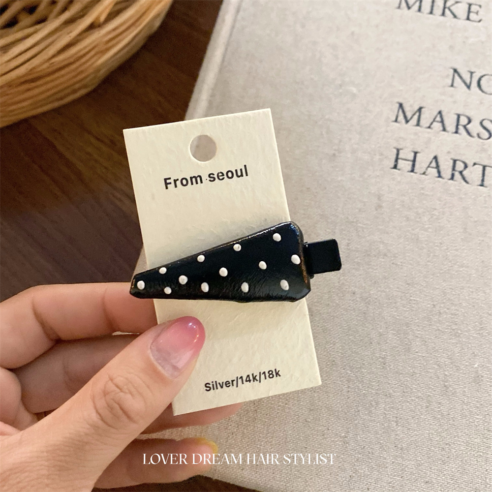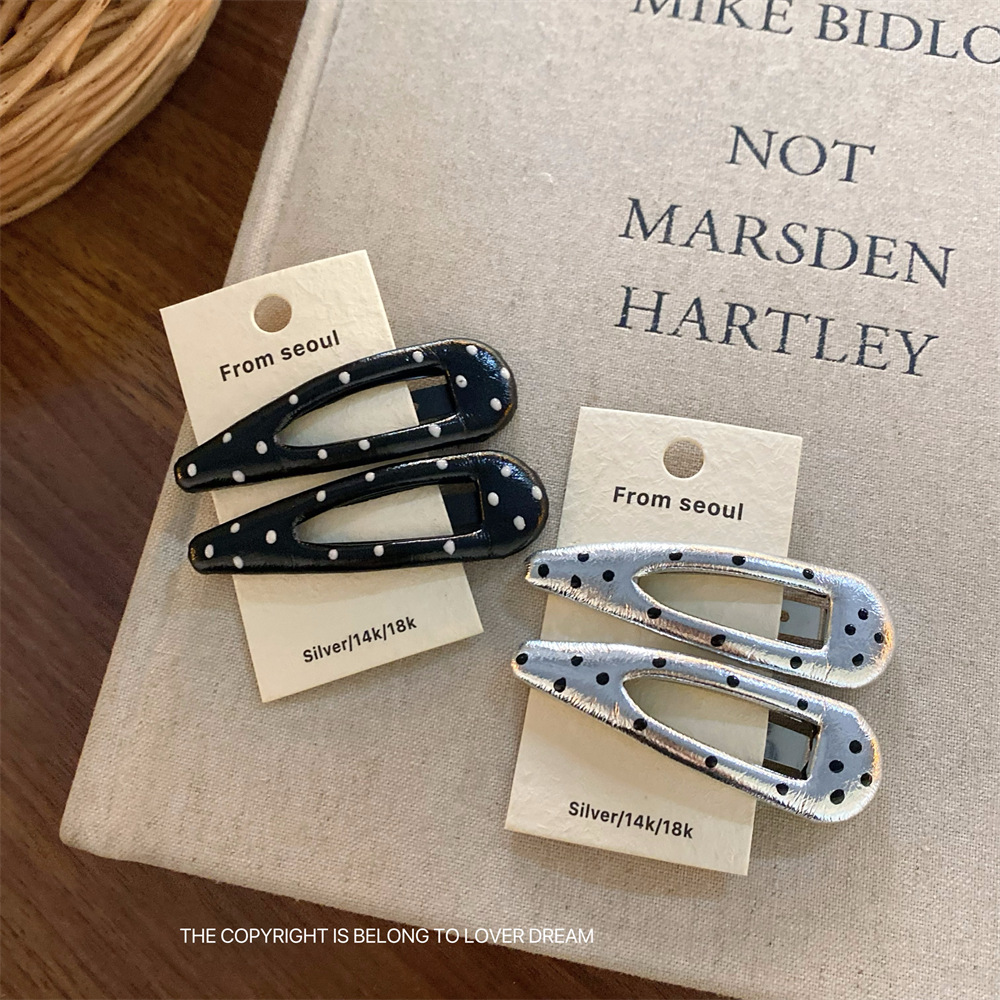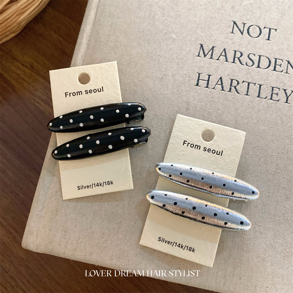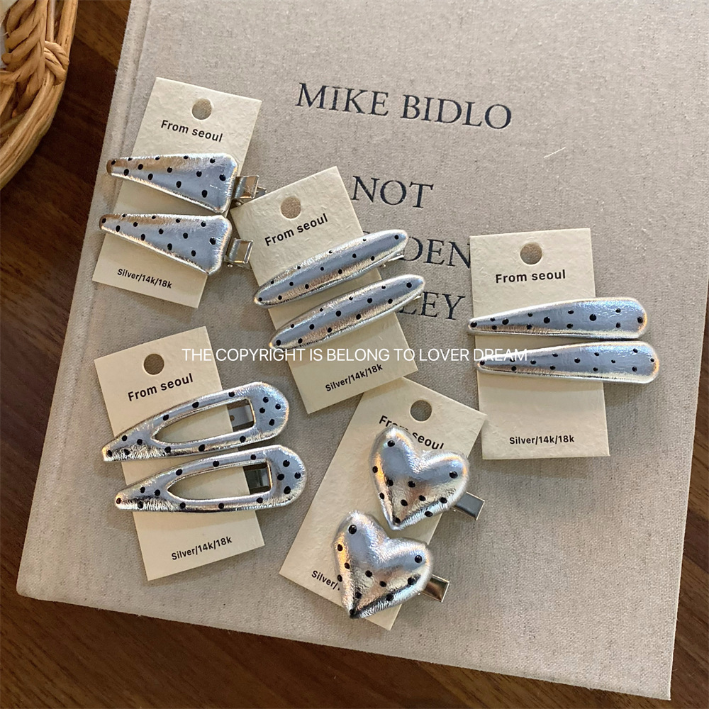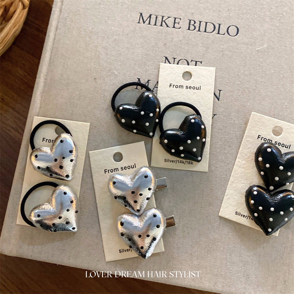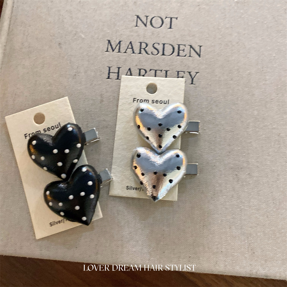 한국 ins 새로운 검은색과 은색 폴카 도트 사랑 모조 가죽 머리핀 세련된 질감 앞머리 클립 머리 장식 여성용 헤어 액세서리