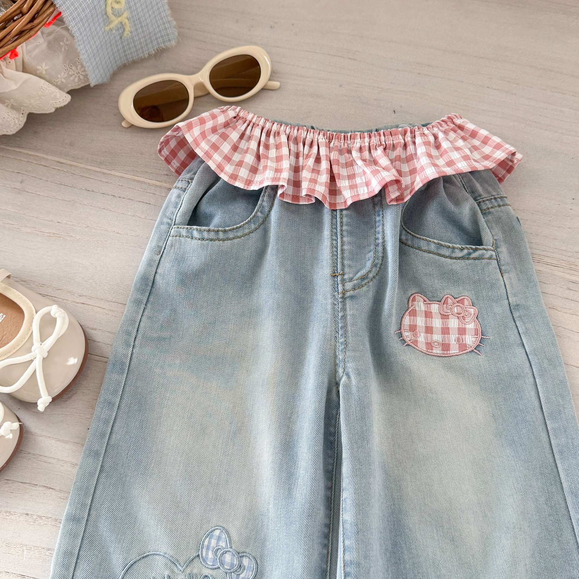 달콤한 소녀풍 레이스 데님 팬츠, 새로운 스타일의 아기 외출복 캐주얼 팬츠, 아동용 9부 스트레이트 팬츠 여름스토어 가기