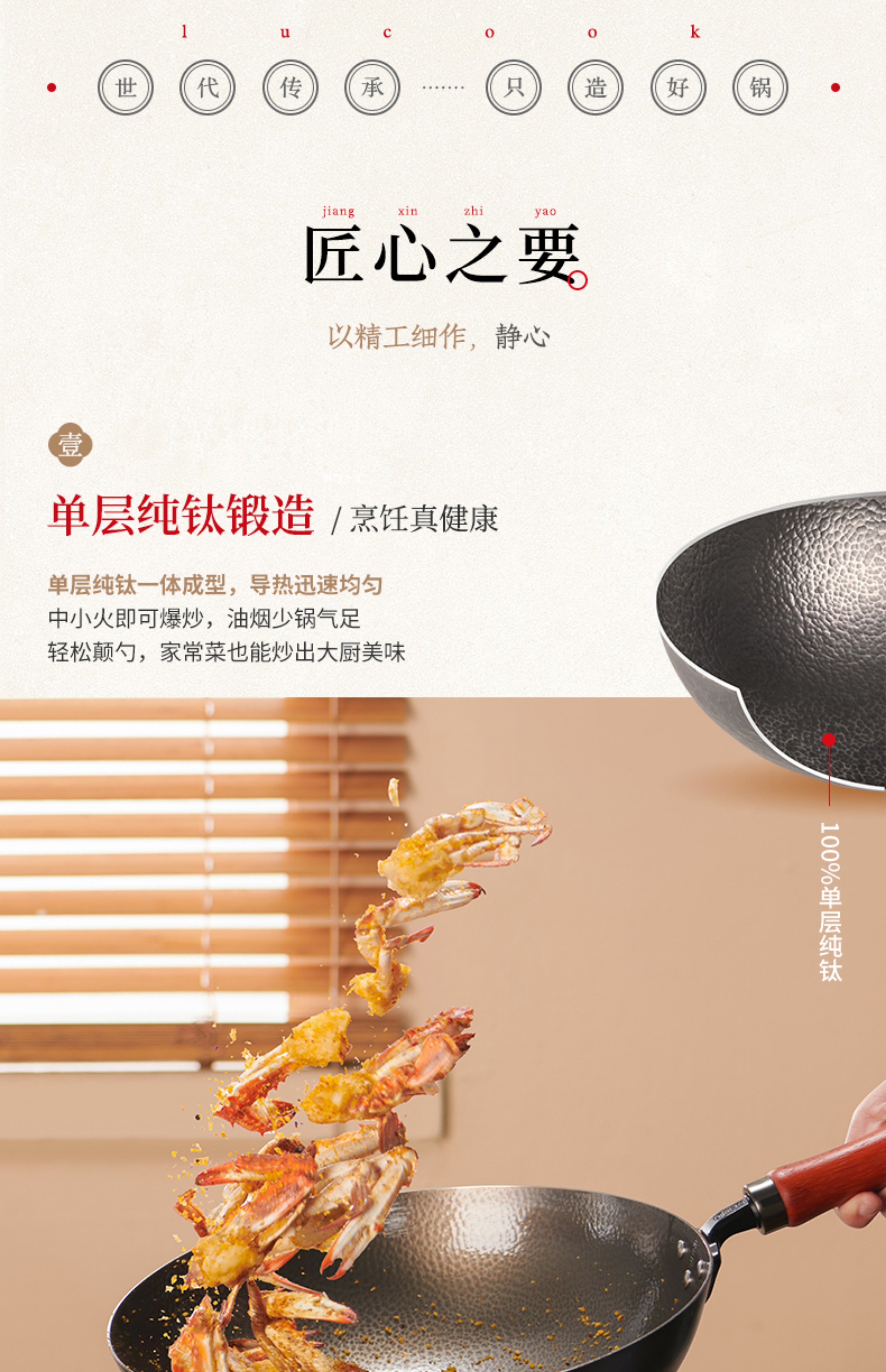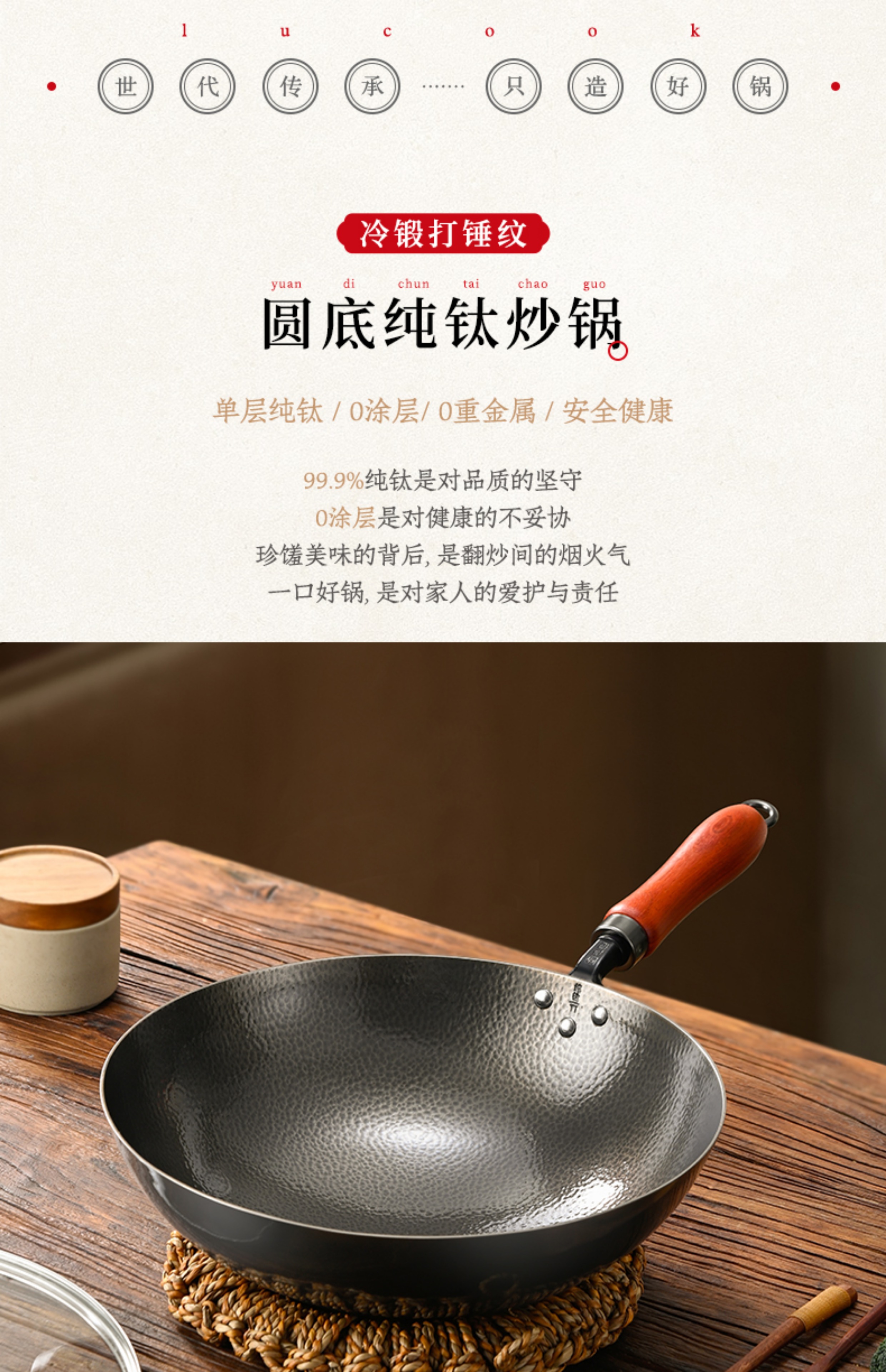 티타늄 가정용 Luji Wok 비 코팅 스틱 Wok 가스 스토브 모든 티타늄 특수 워크 망치 패턴 모든 티타늄 라운드 바닥