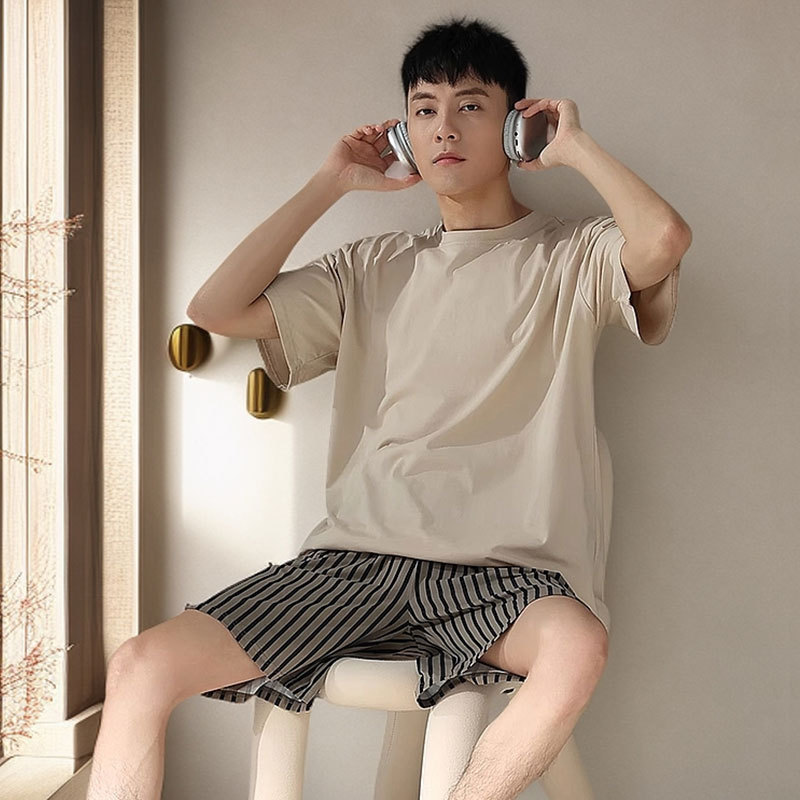 여름 남성 잠옷 새로운 얇은 라운드 넥 느슨한 솔리드 컬러 캐주얼 간단한 반팔 반바지 홈웨어 세트스토어 가기