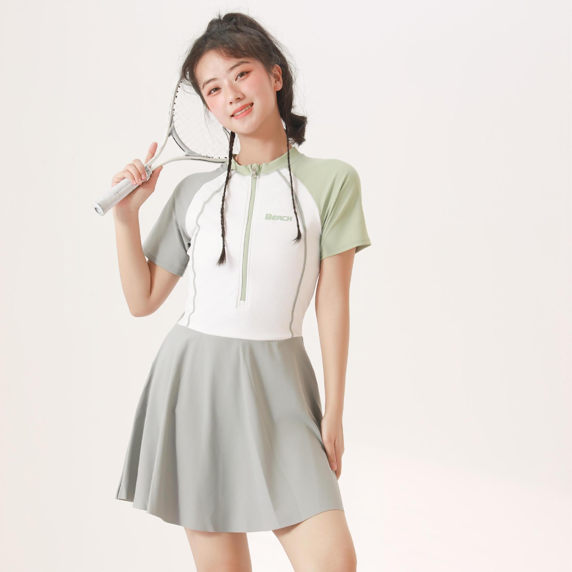 큰 어린이와 소녀를 위한 새로운 아동 수영복, 원피스 스커트 수영복, 달콤하고 귀여운 소녀의 컬러 블록 온천 수영복스토어 가기