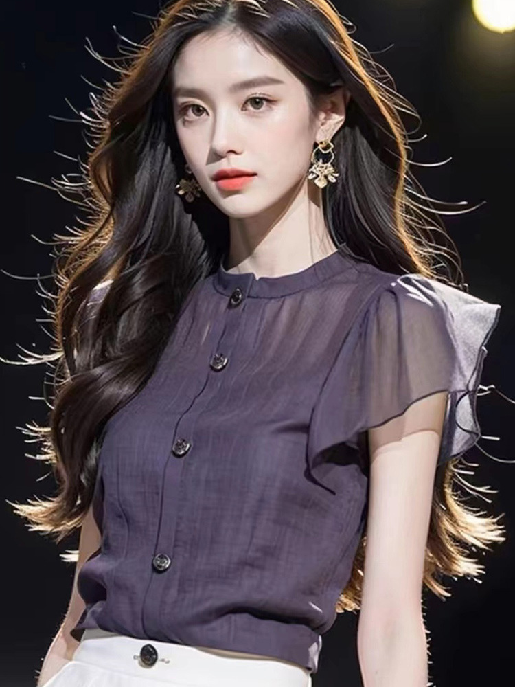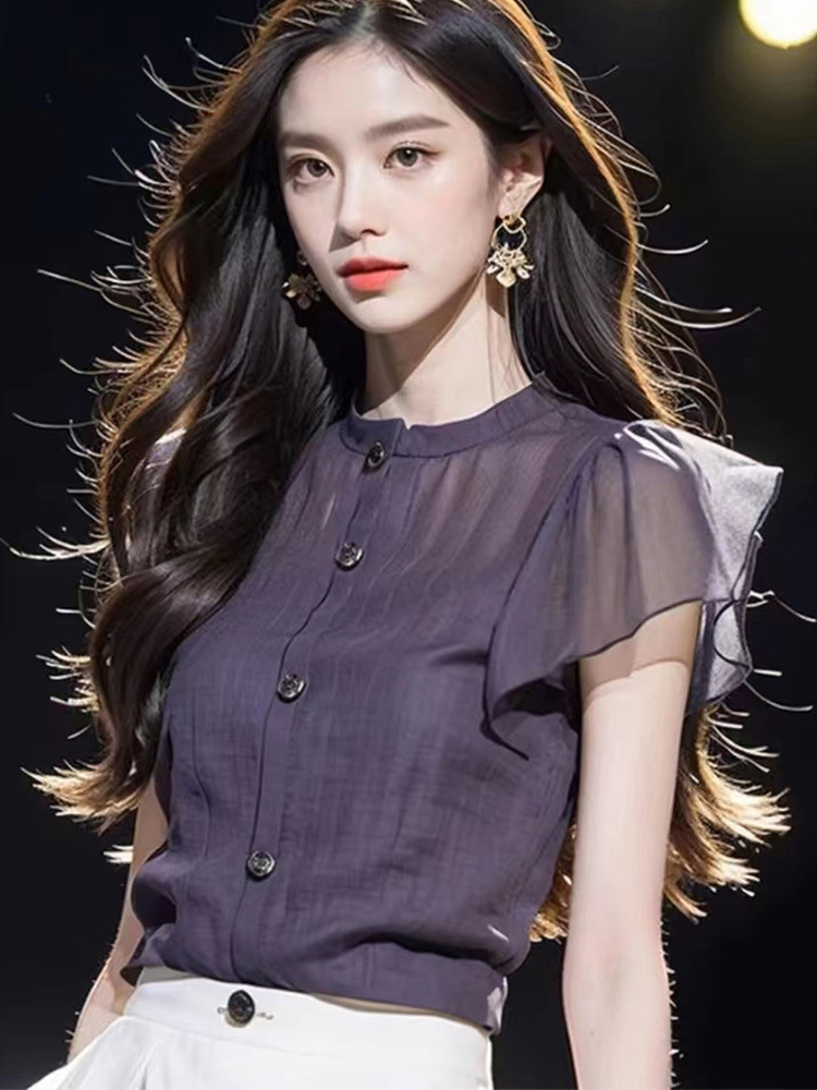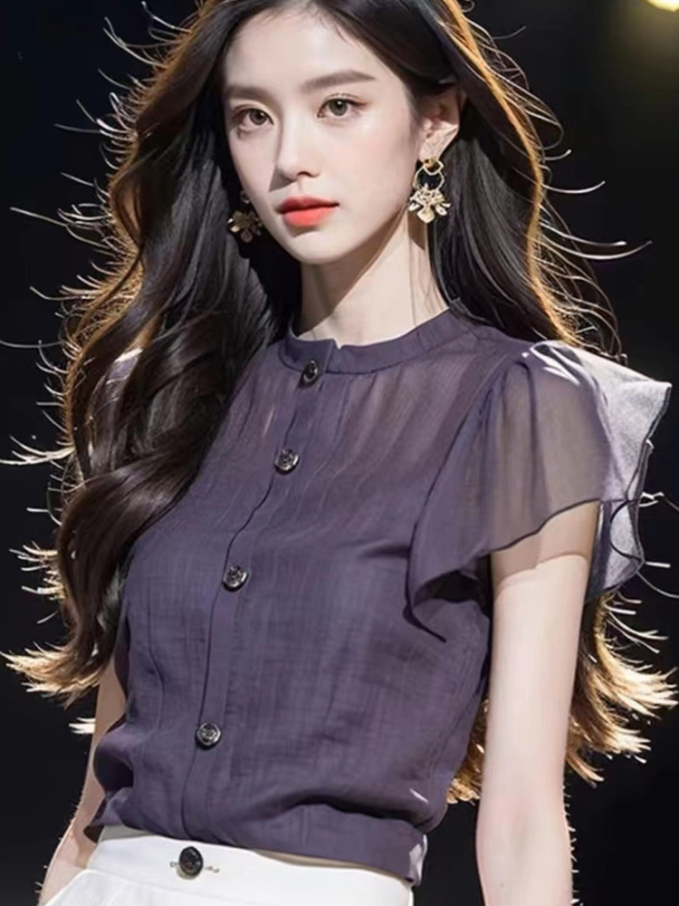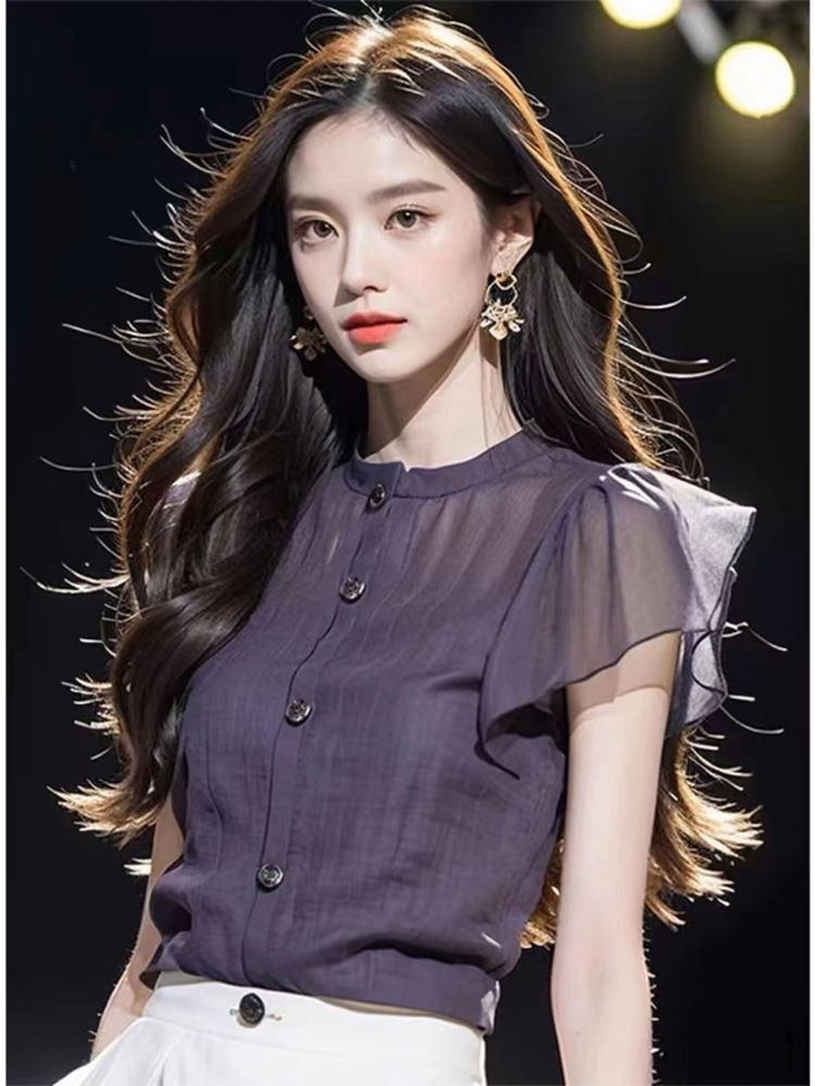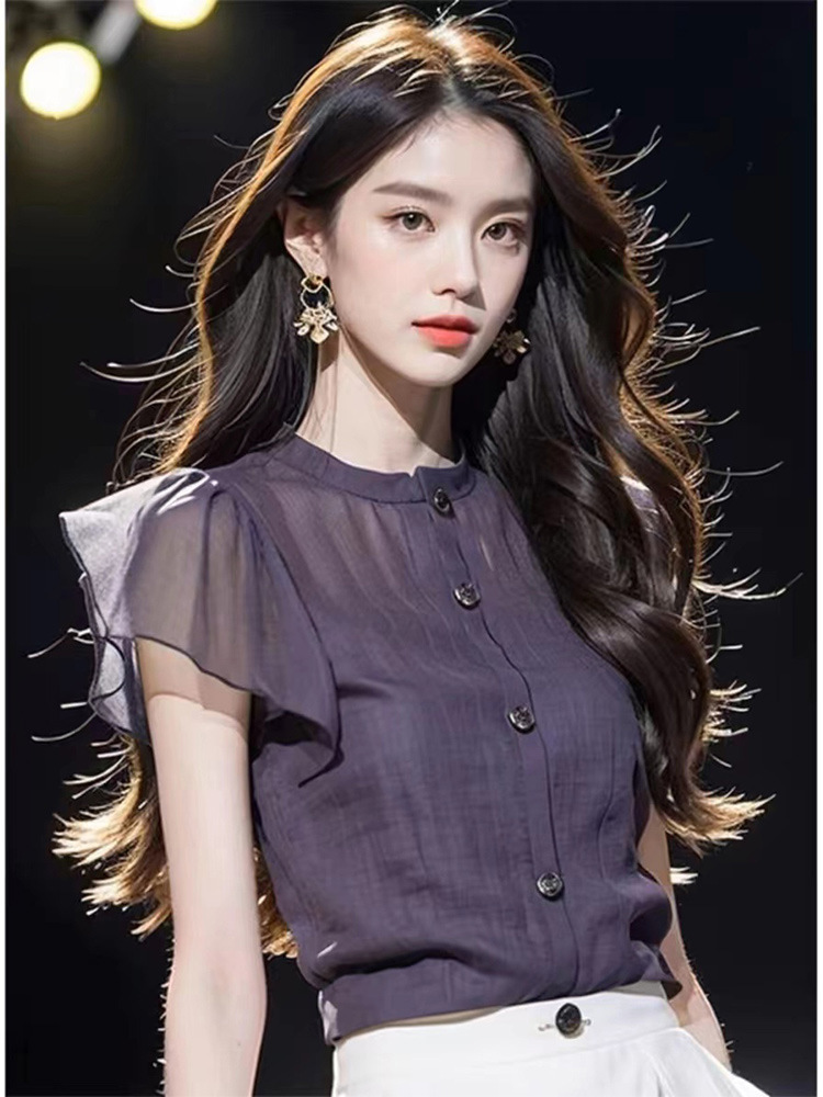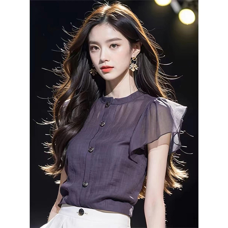 보라색 반팔 셔츠 여성의 2025 새로운 여름 우아한 작은 셔츠 독특한 쉬폰 셔츠 고급 작은 비행 슬리브 탑