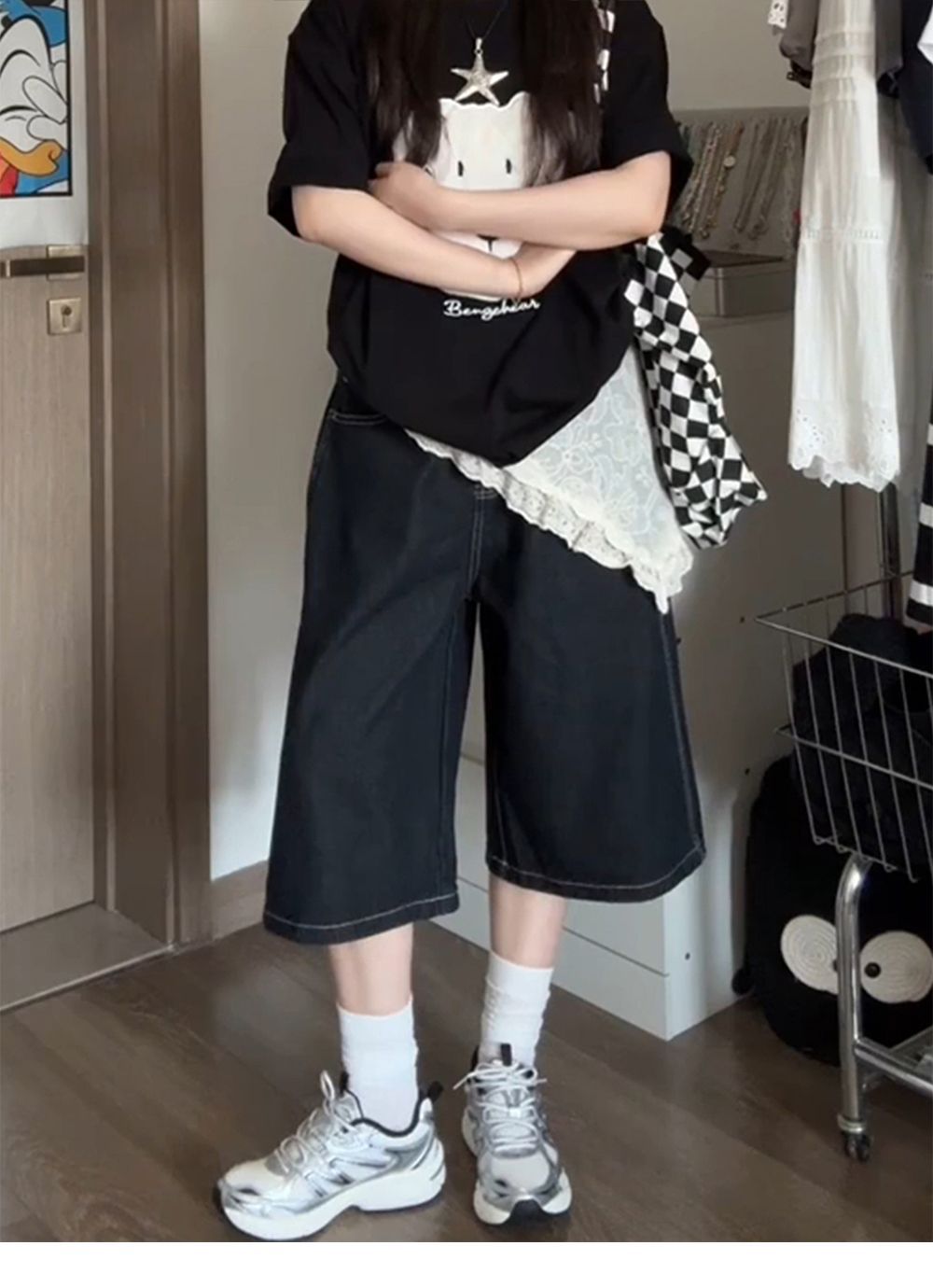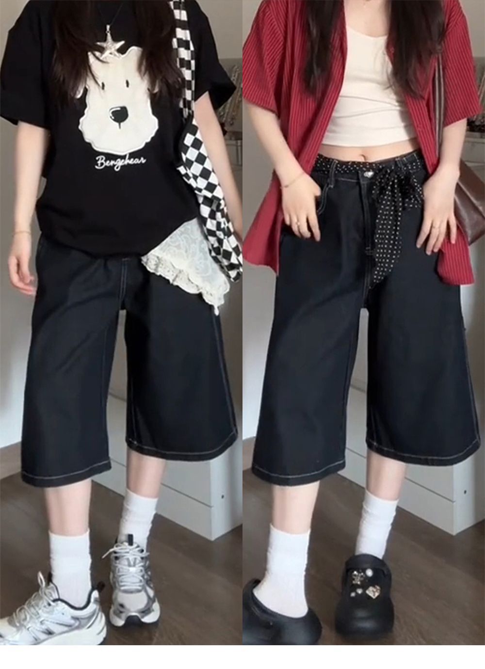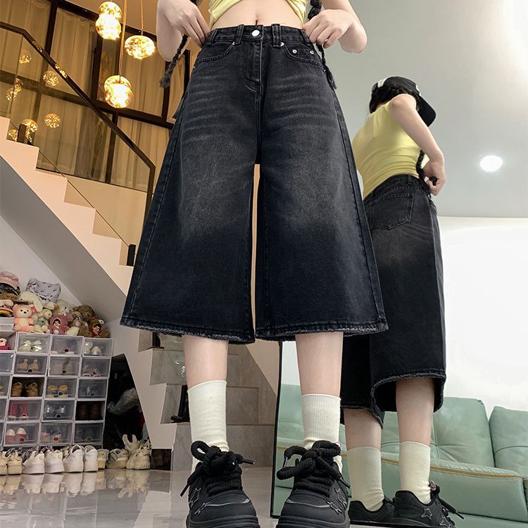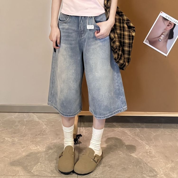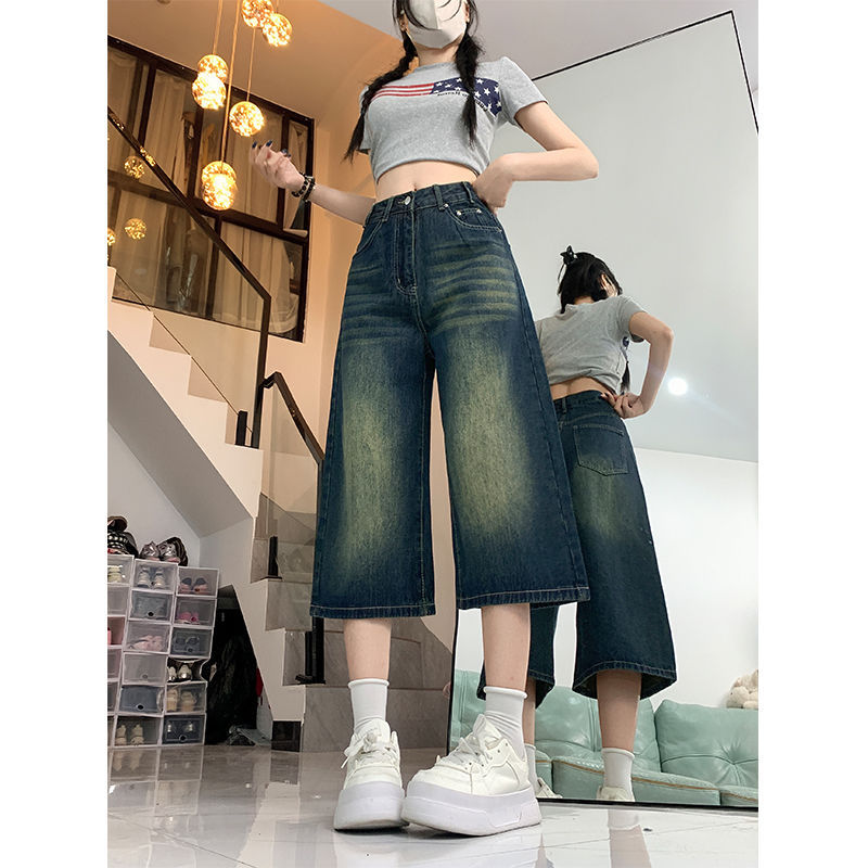 여성용 크롭 팬츠 여름 얇은 2025 신상 다크 블루 청바지 플러스 사이즈 뚱뚱한 mm 슬리밍 루즈 스트레이트 5부 중간 길이 바지스토어 가기