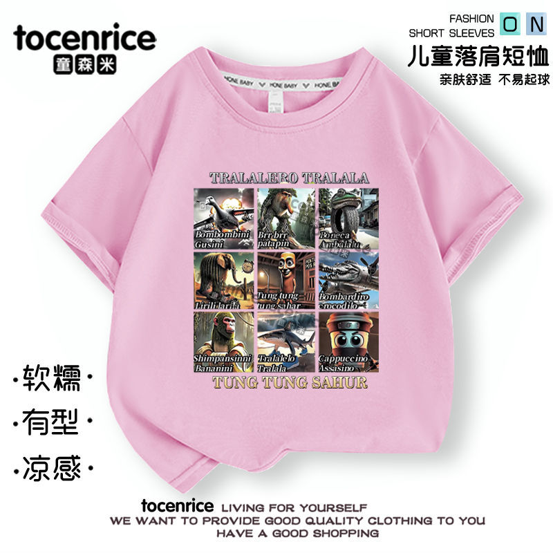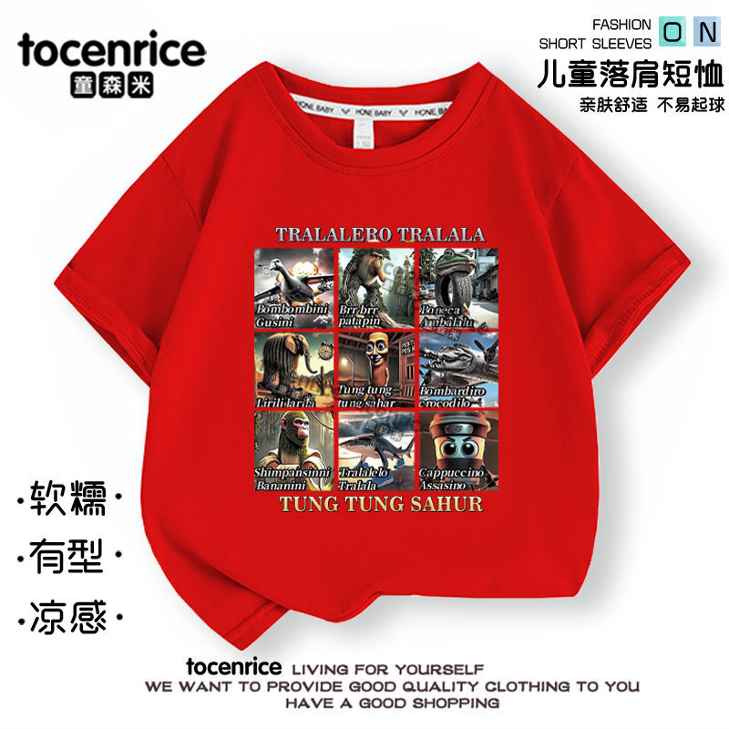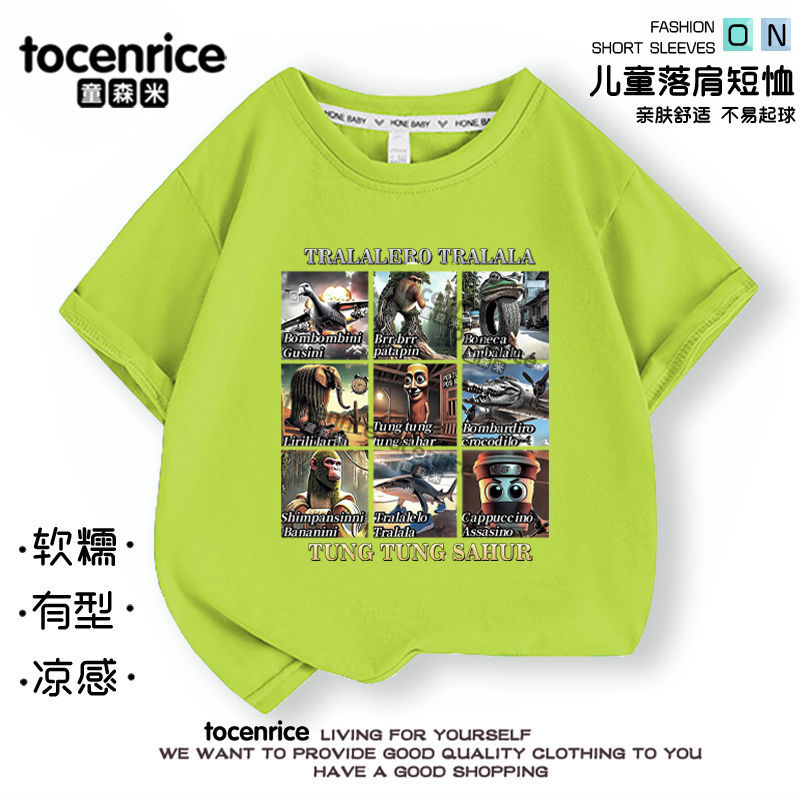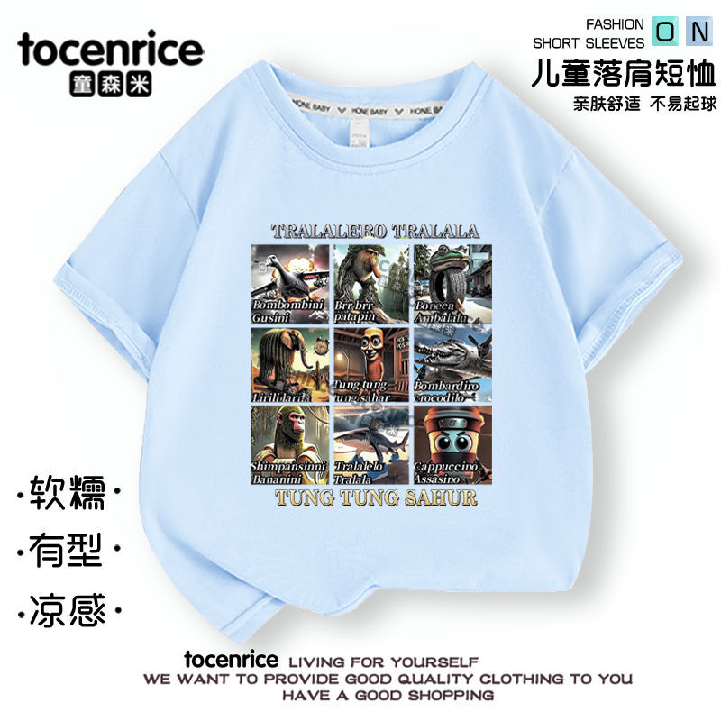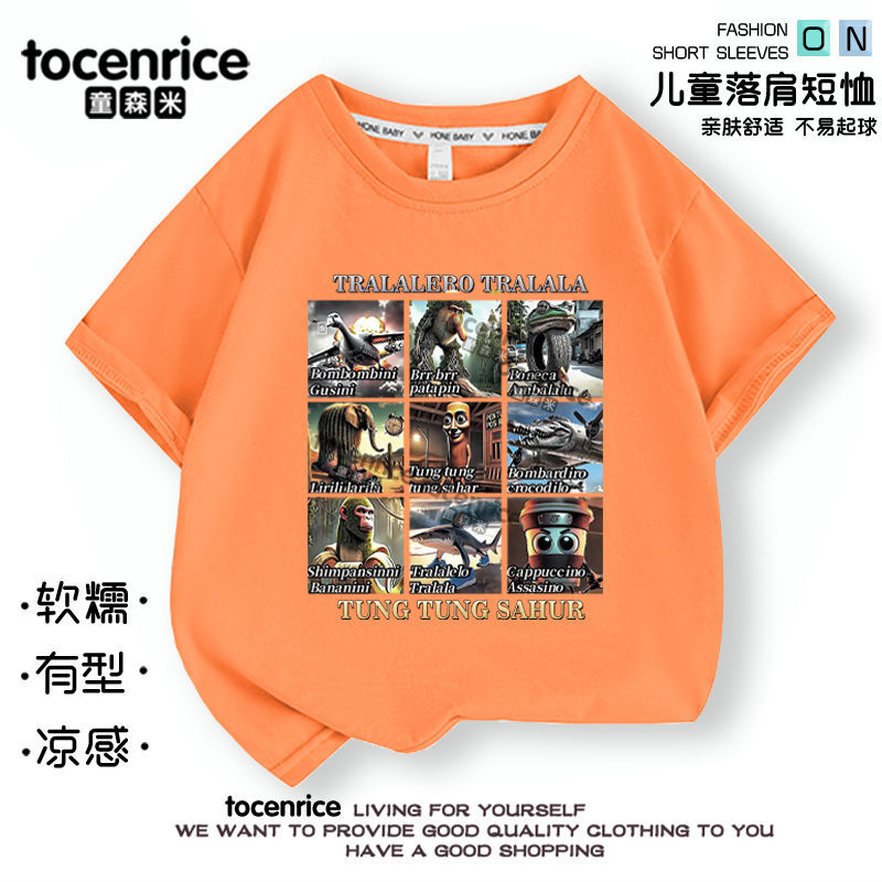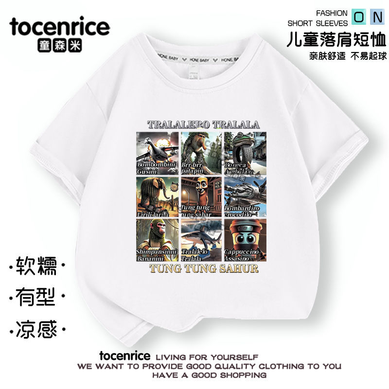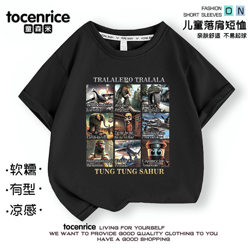 Tungtungsahur Tongtong 형 스틱 사람 추상 외국 산 바다 순면 반소매 티셔츠 어린이 여름스토어 가기