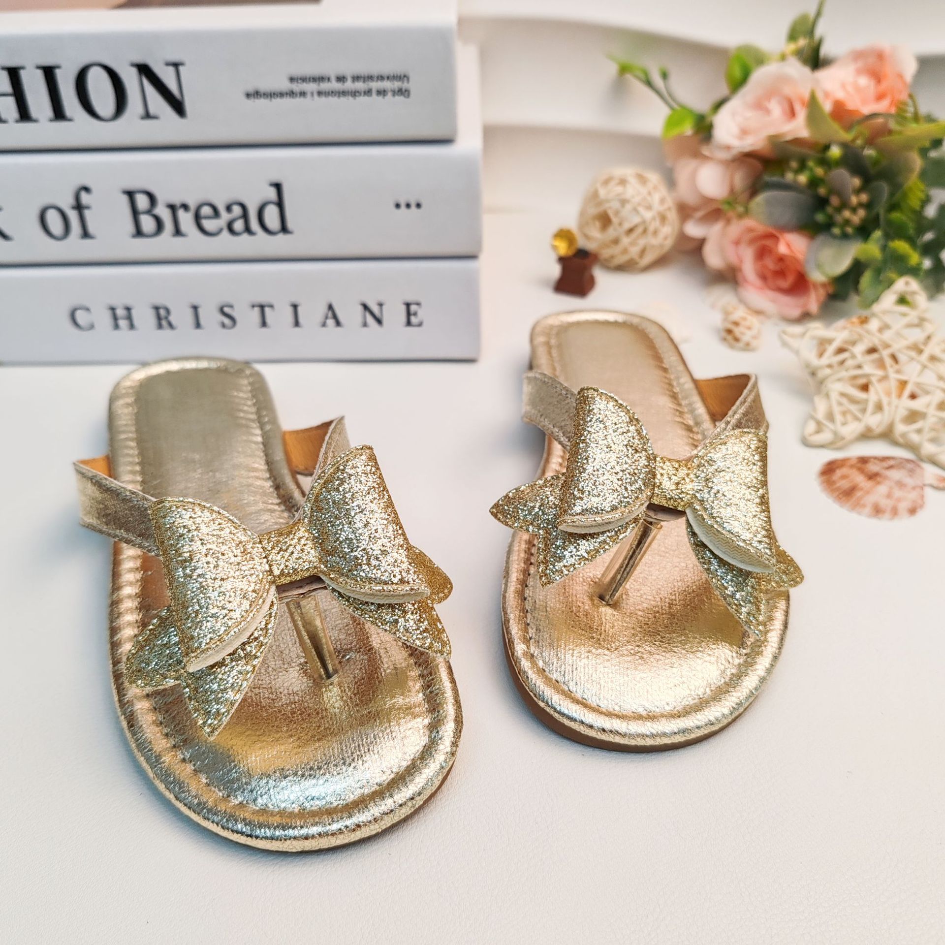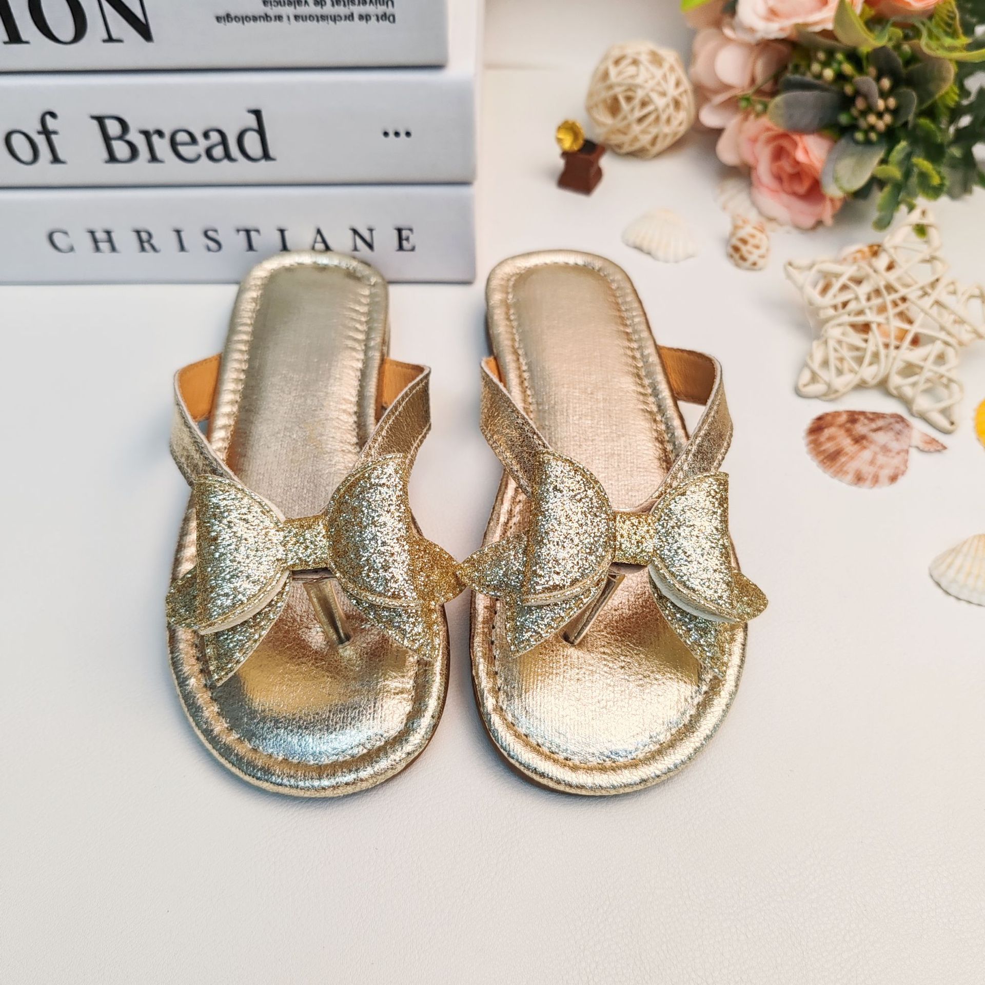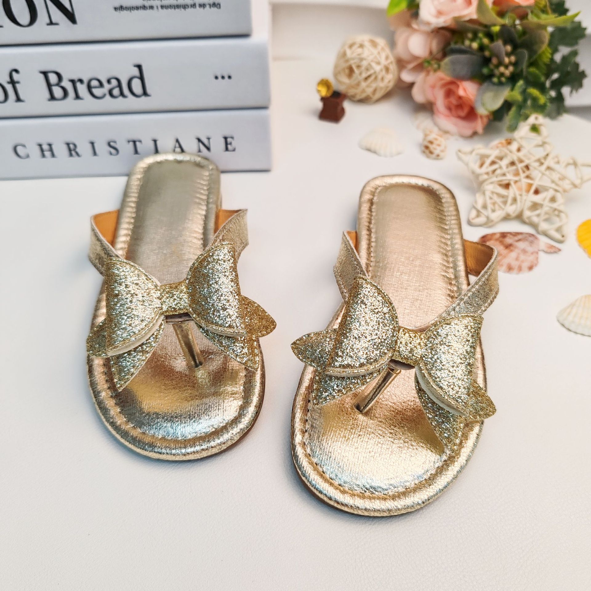 국경 간 여름 슬리퍼 2025 새로운 황금 소녀 공주 스타일 플랫 미끄럼 방지 비치 샌들 외부