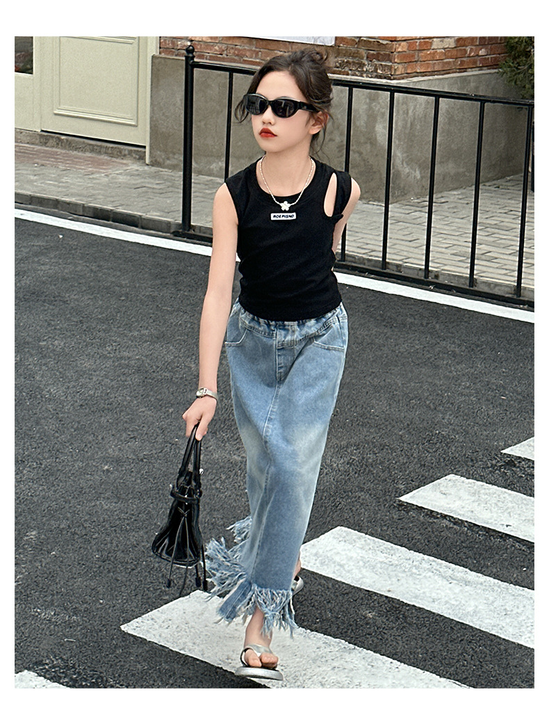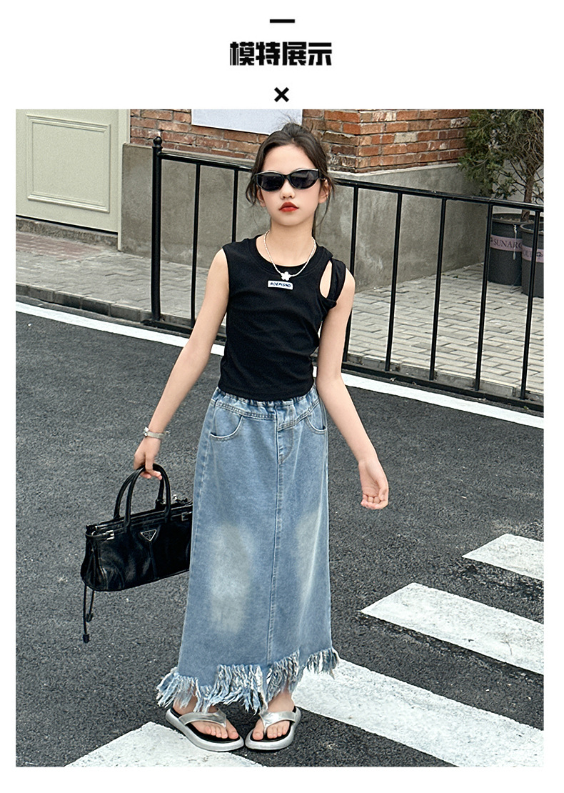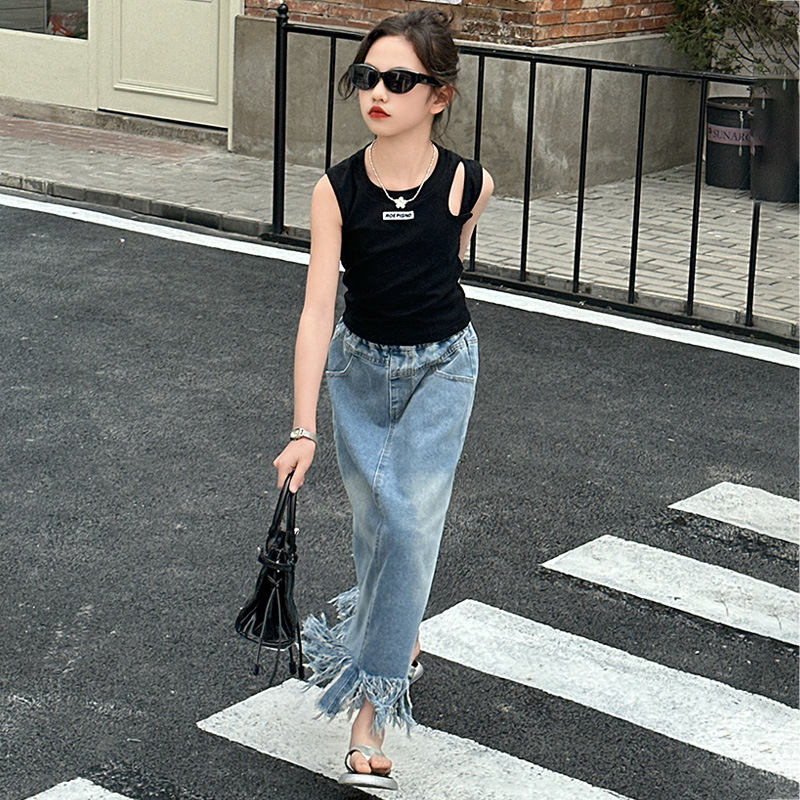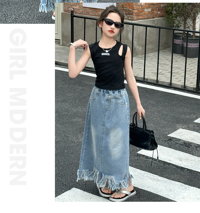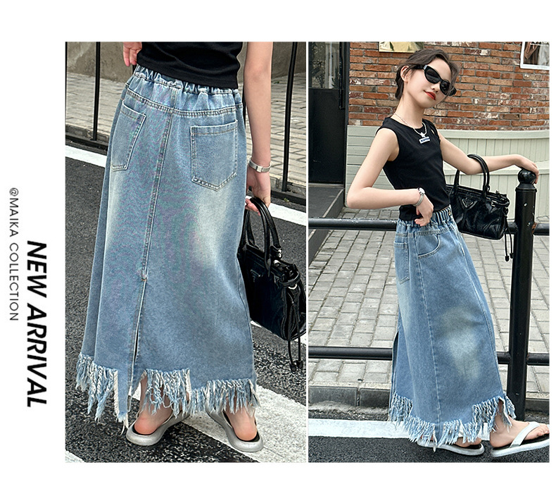 여자 여름 데님 스커트 2025 새로운 패션 여자 한국 스타일 중대형 어린이 스타일 프린지 데님 롱 스커트 크로스보더