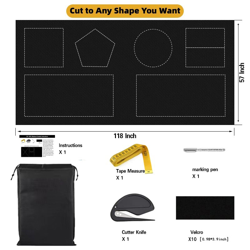 • 210D 실버 및 블랙(암막천 1개 + 수납가방 + 벨크로 + 마커 + 커터 + 3미터 자 + 사용설명서)