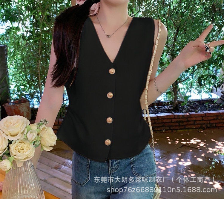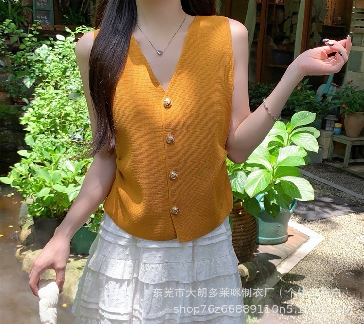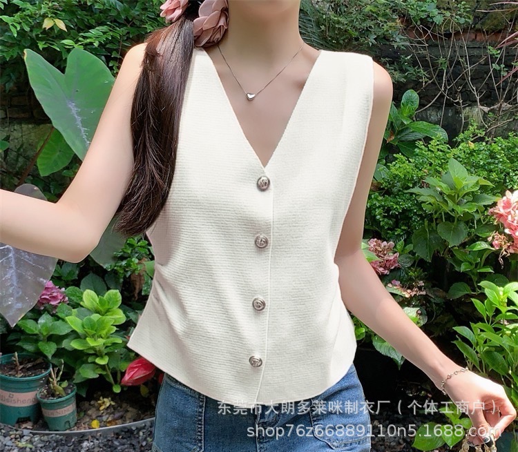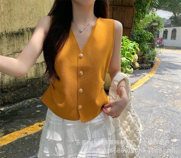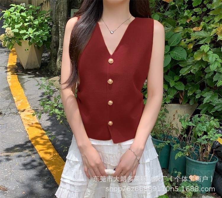 여성을위한 프렌치 싱글 브레스트 v 넥 민소매 니트 조끼 2025 여름 새로운 슬림 피트 외부 탑스토어 가기