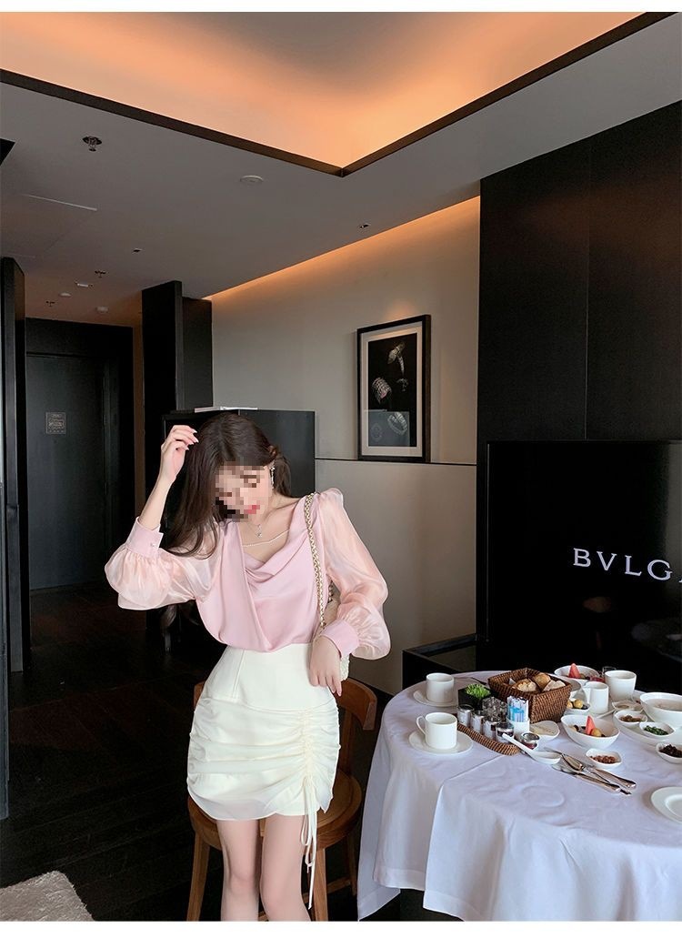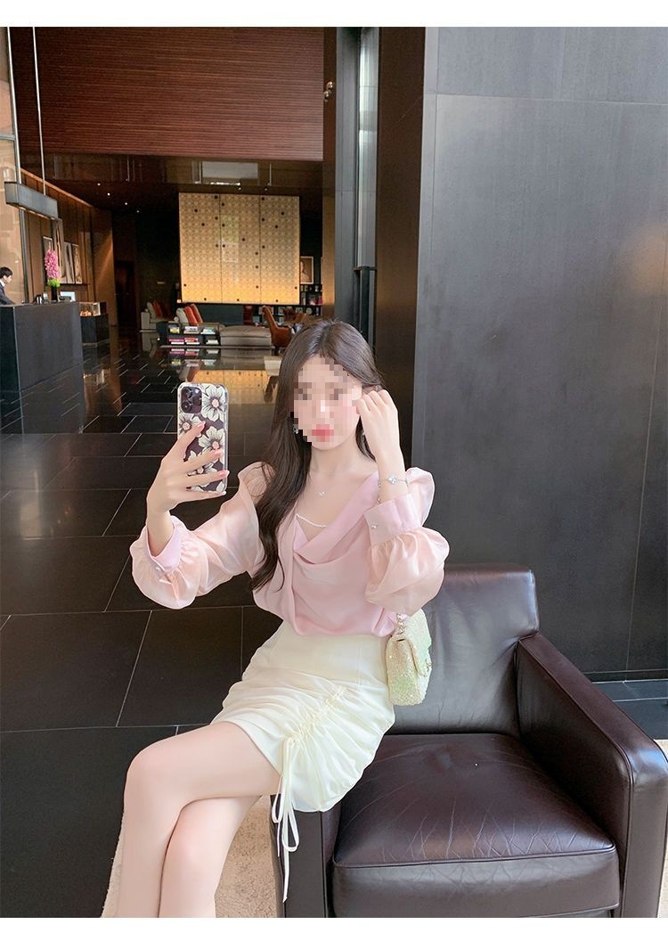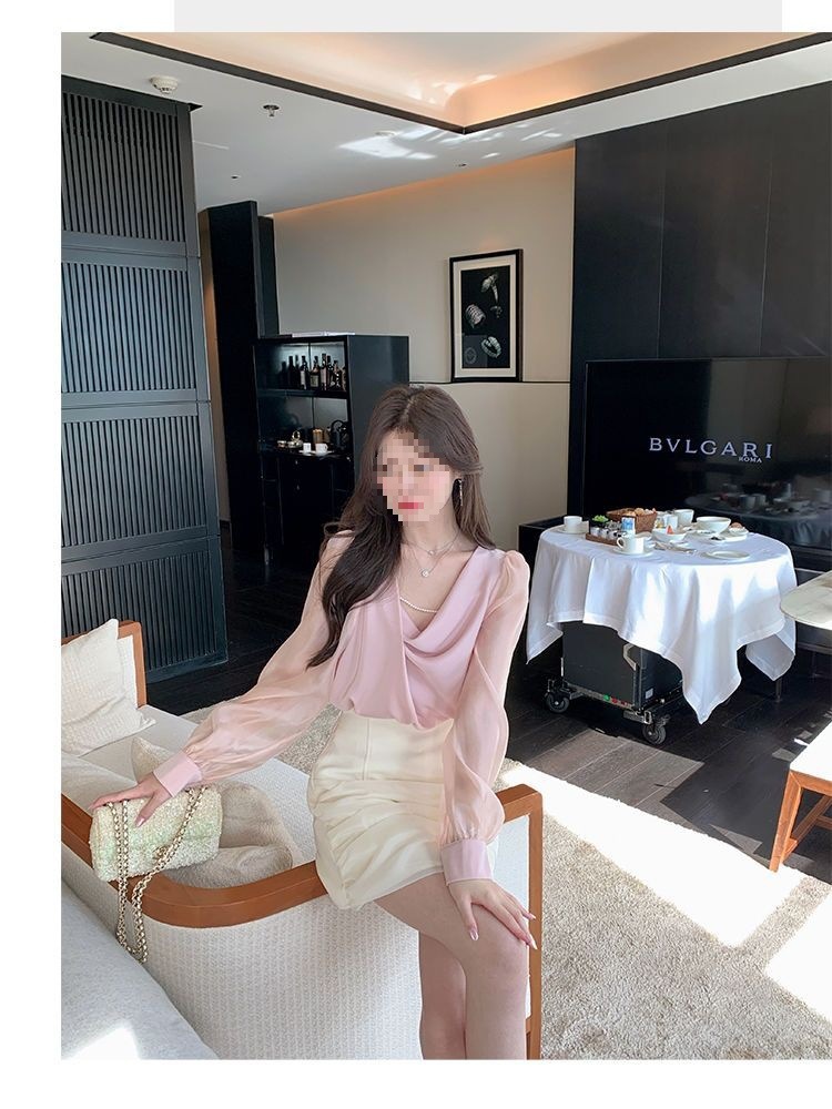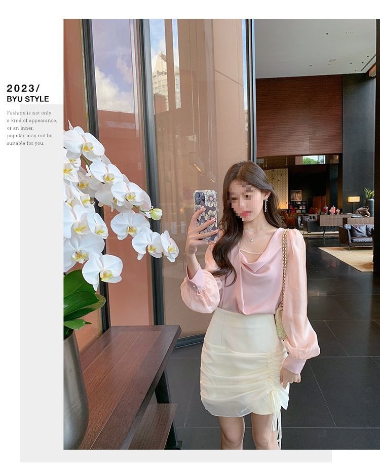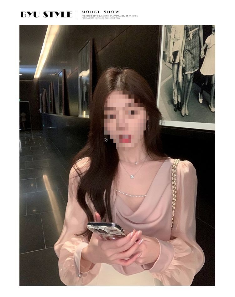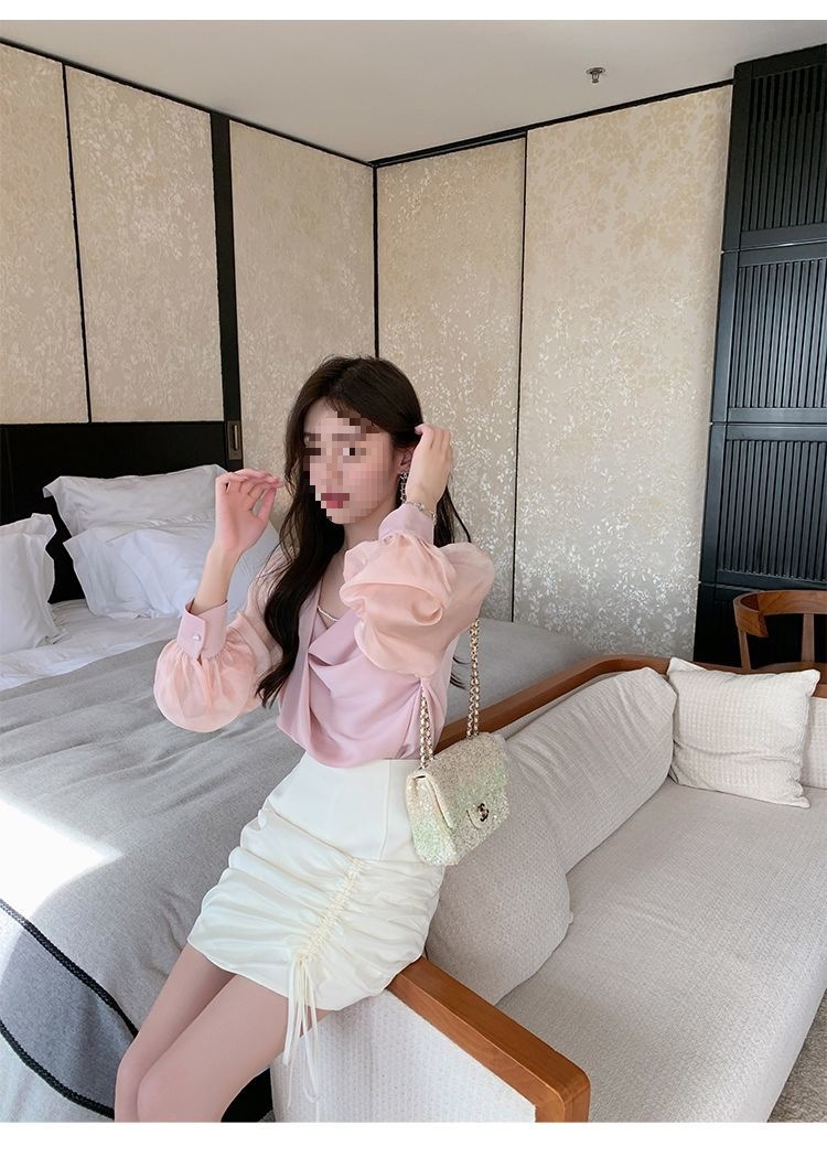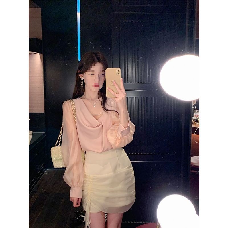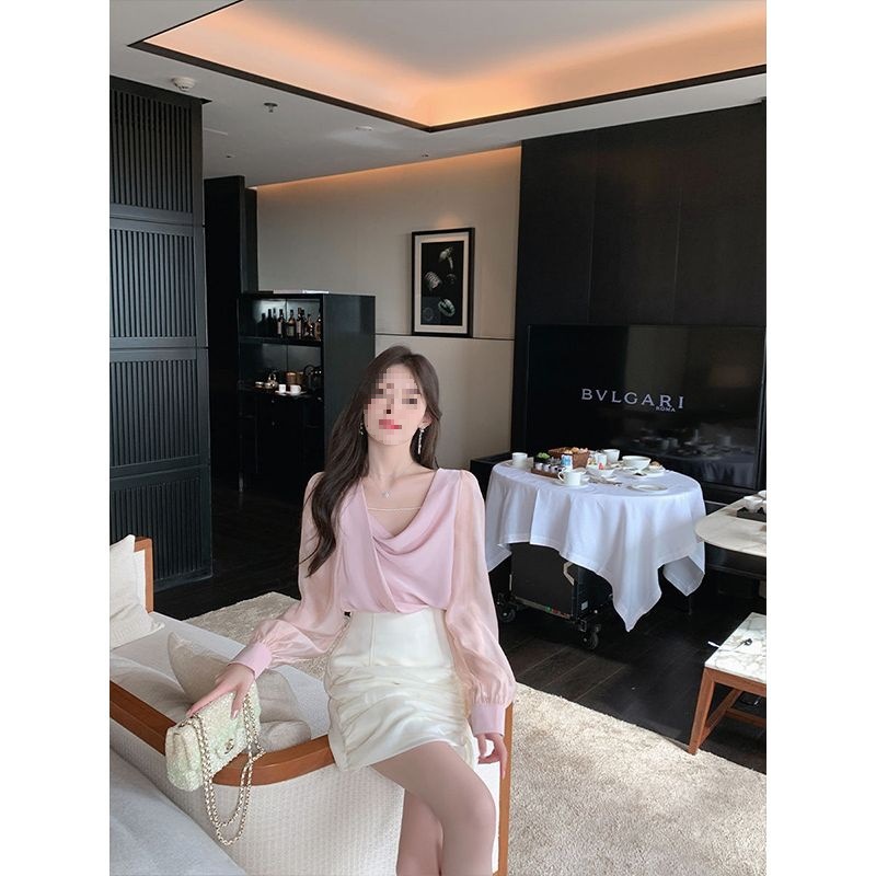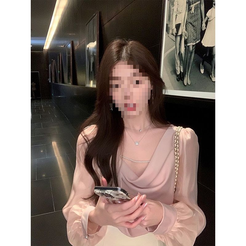 2025 여름 패션 퍼프 슬리브 새틴 핑크 쉬폰 셔츠 여성 디자인 느슨한 긴 소매 셔츠 탑