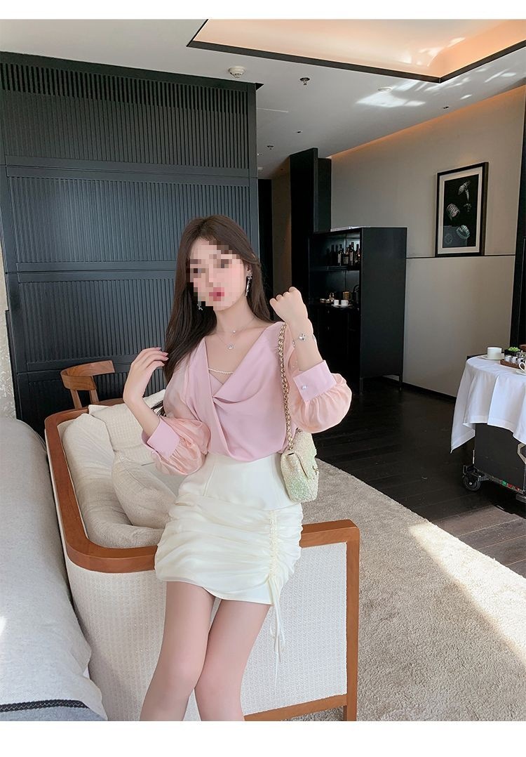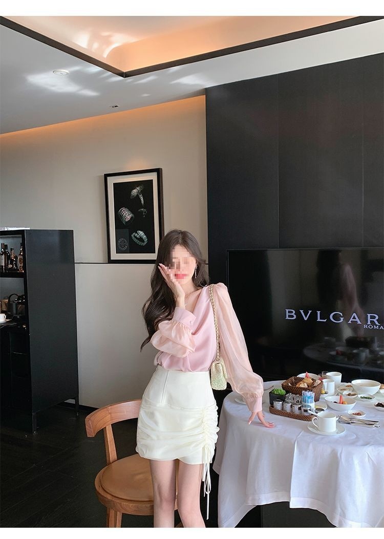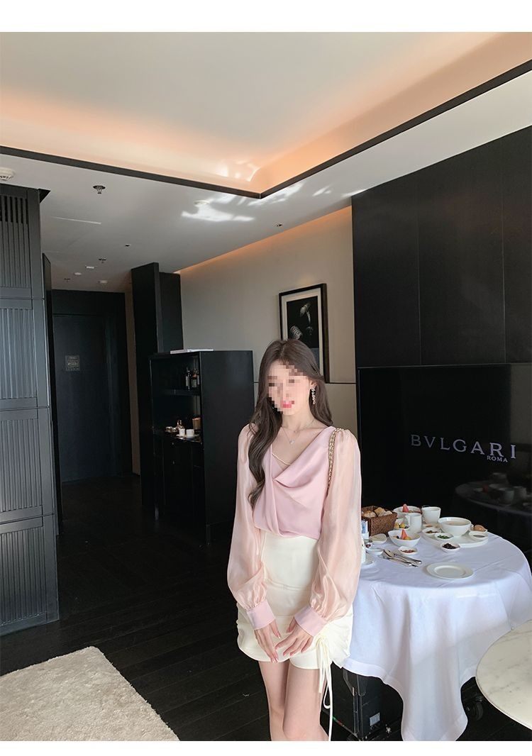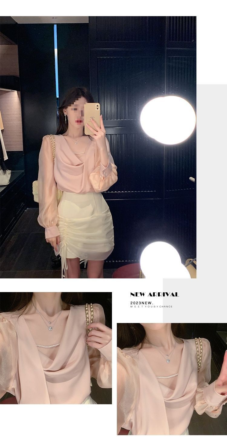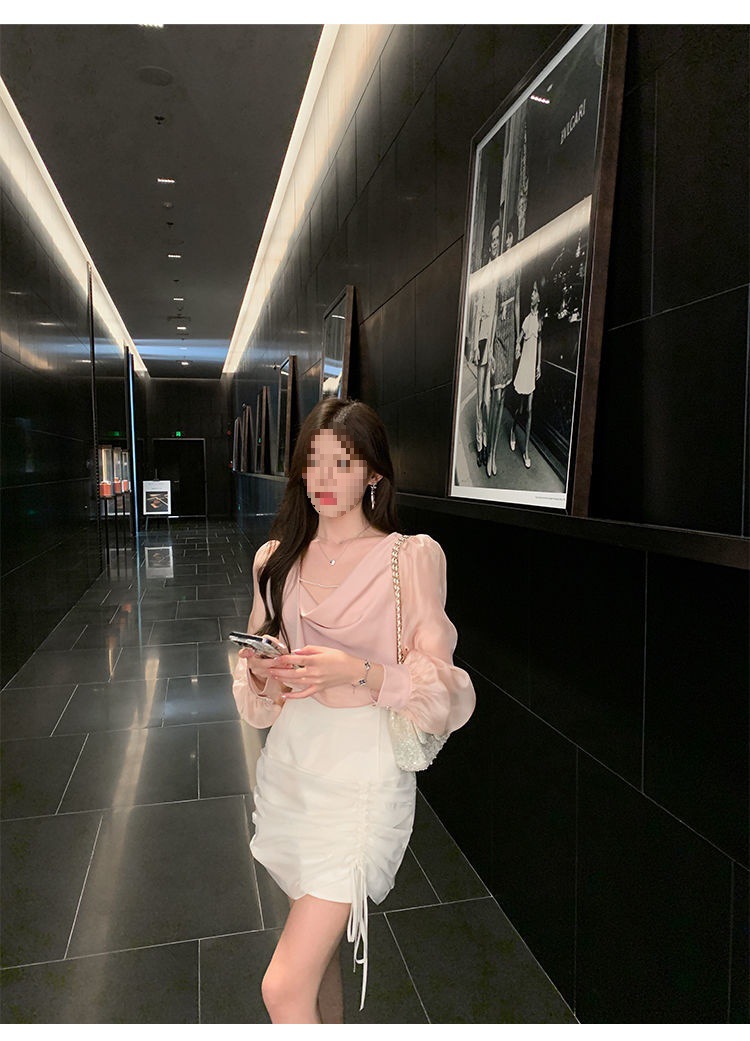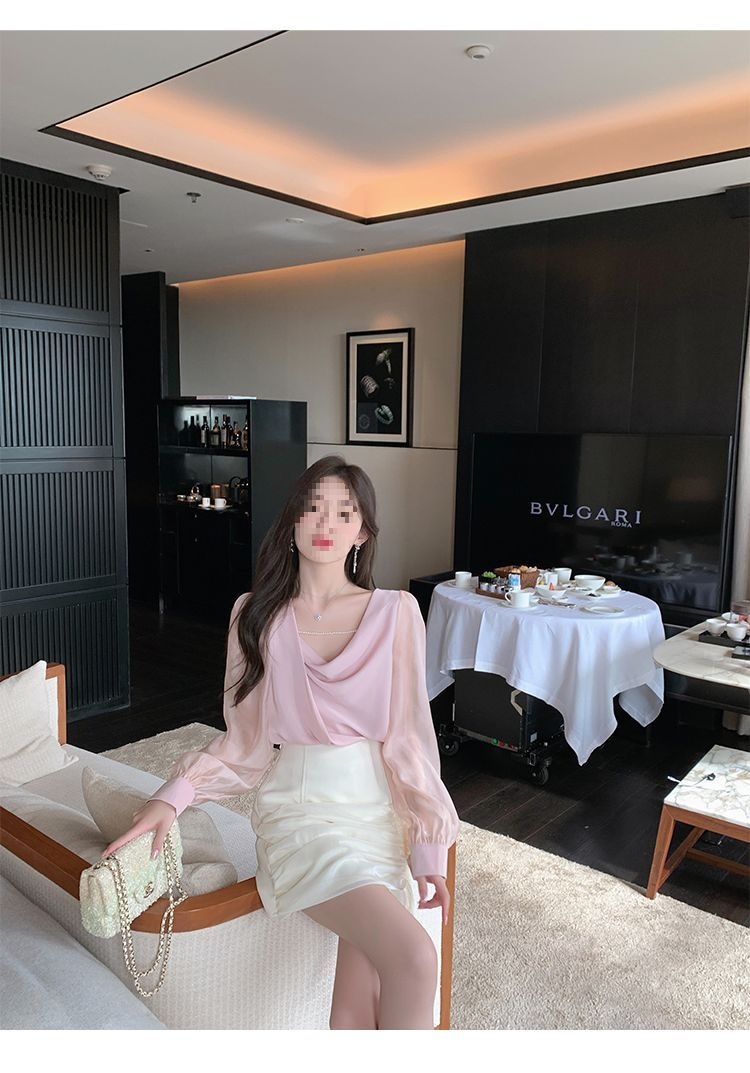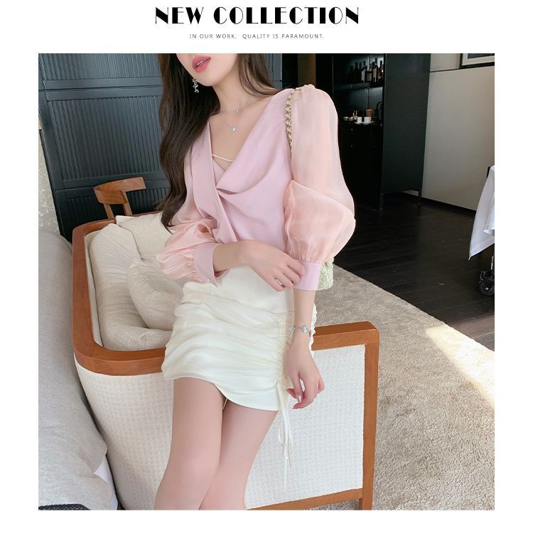 2025 여름 패션 퍼프 슬리브 새틴 핑크 쉬폰 셔츠 여성 디자인 느슨한 긴 소매 셔츠 탑