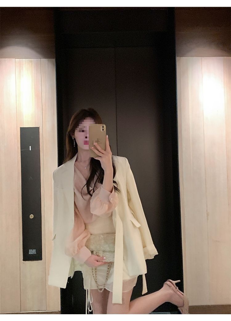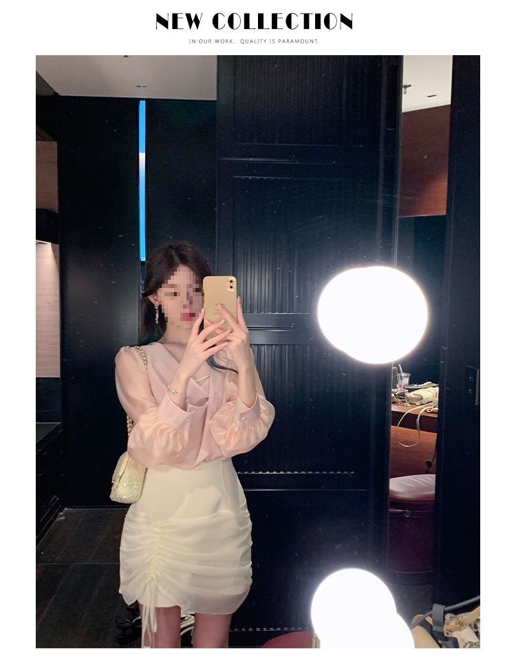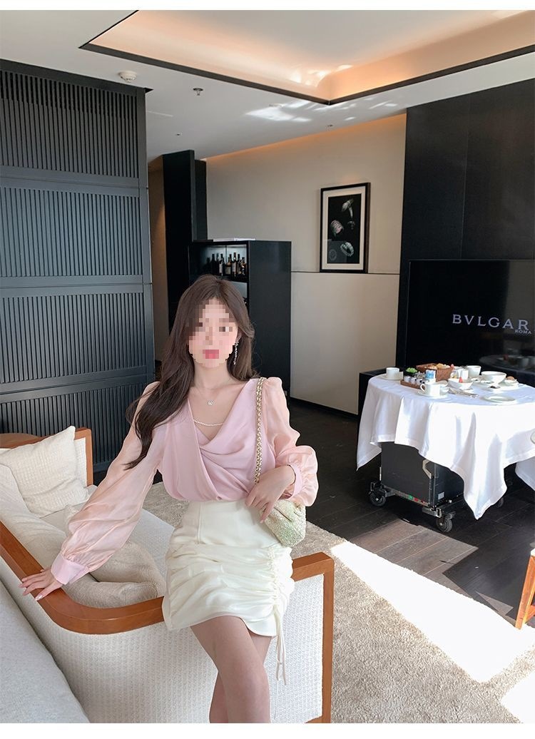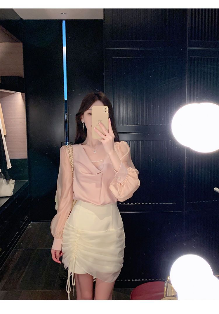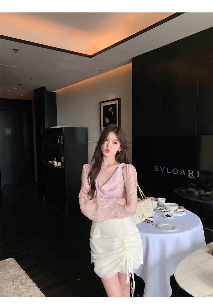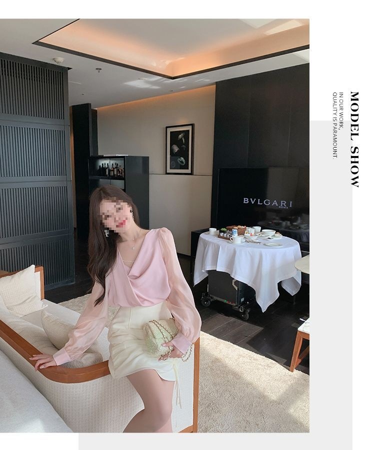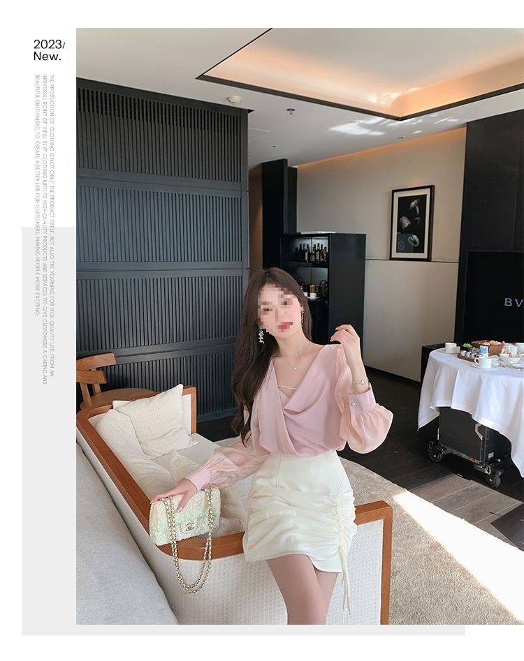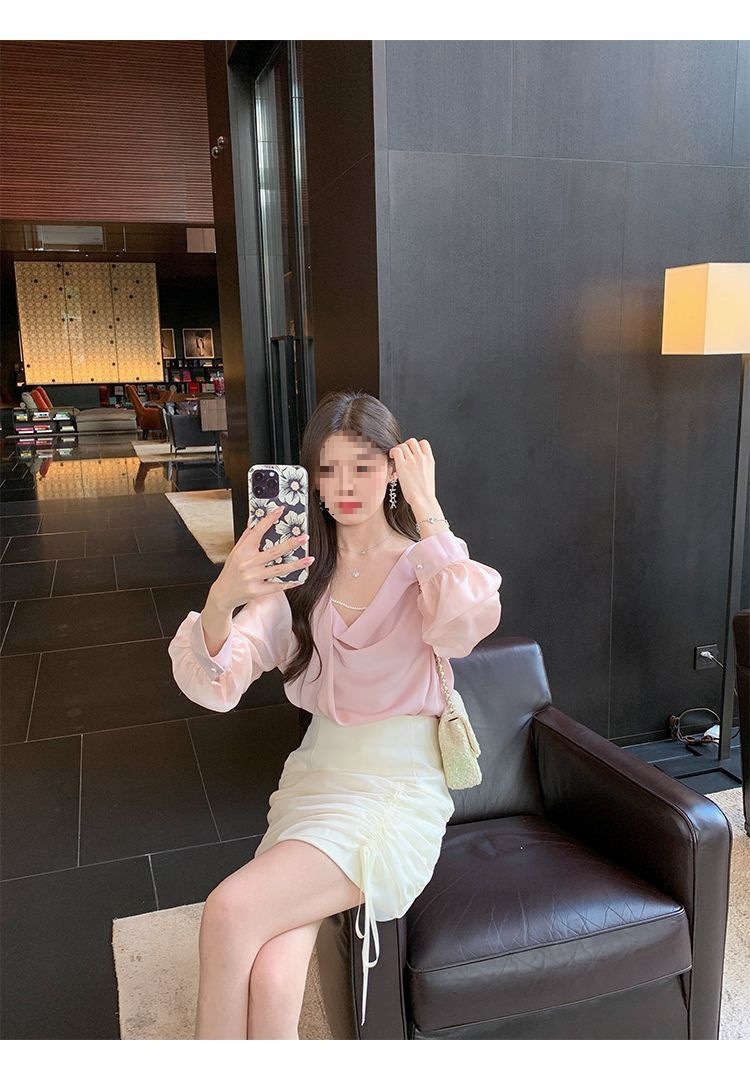 2025 여름 패션 퍼프 슬리브 새틴 핑크 쉬폰 셔츠 여성 디자인 느슨한 긴 소매 셔츠 탑