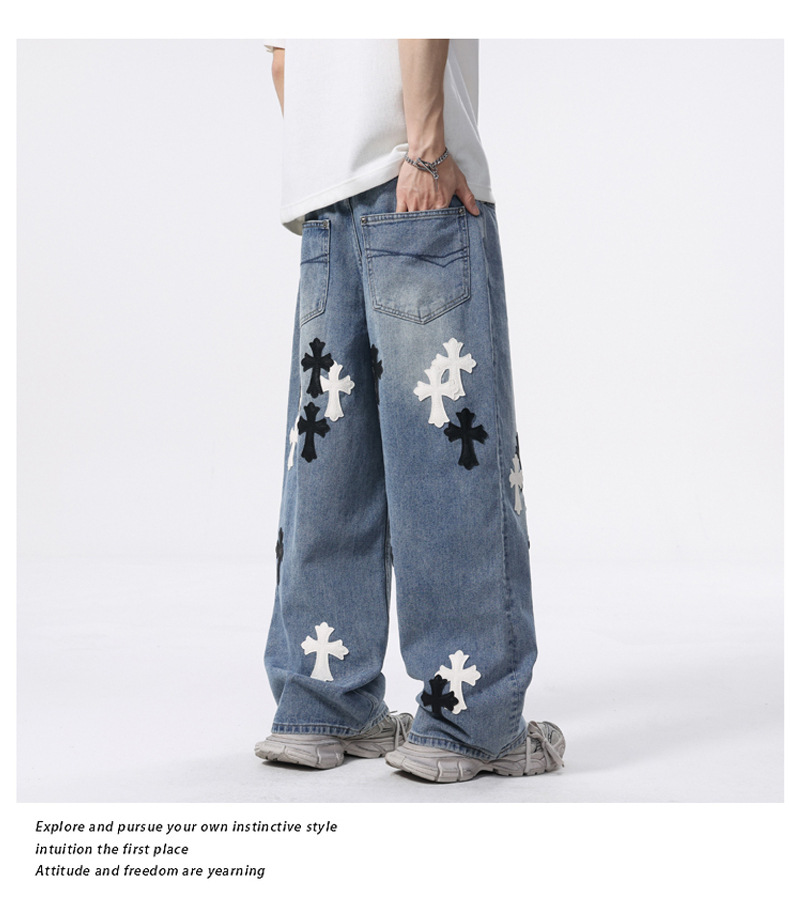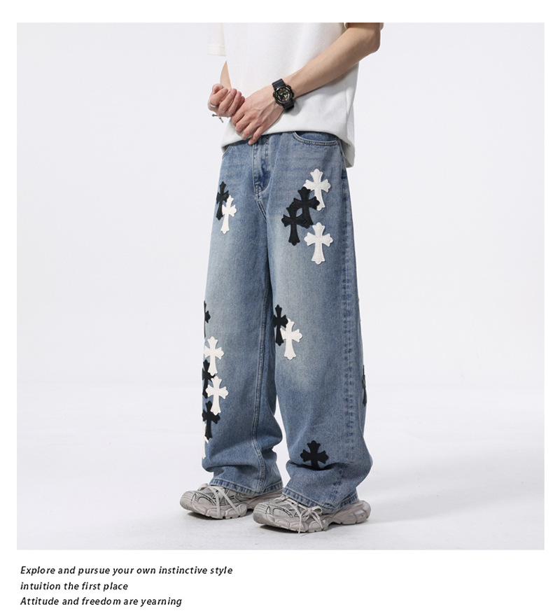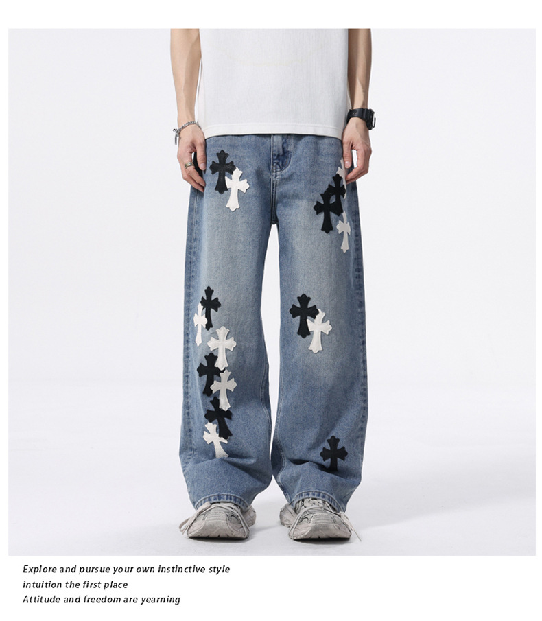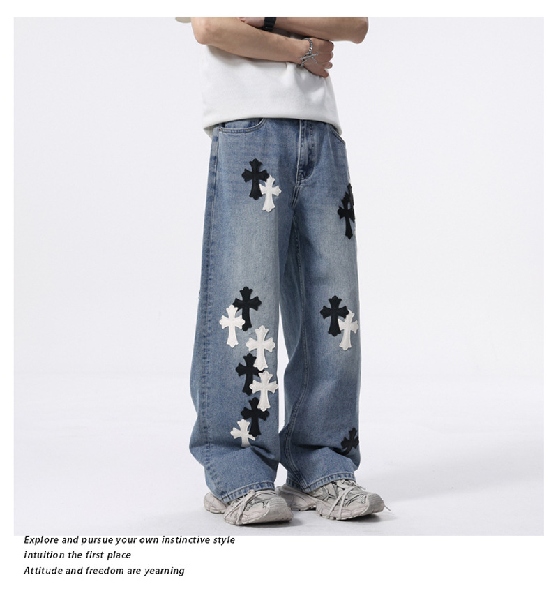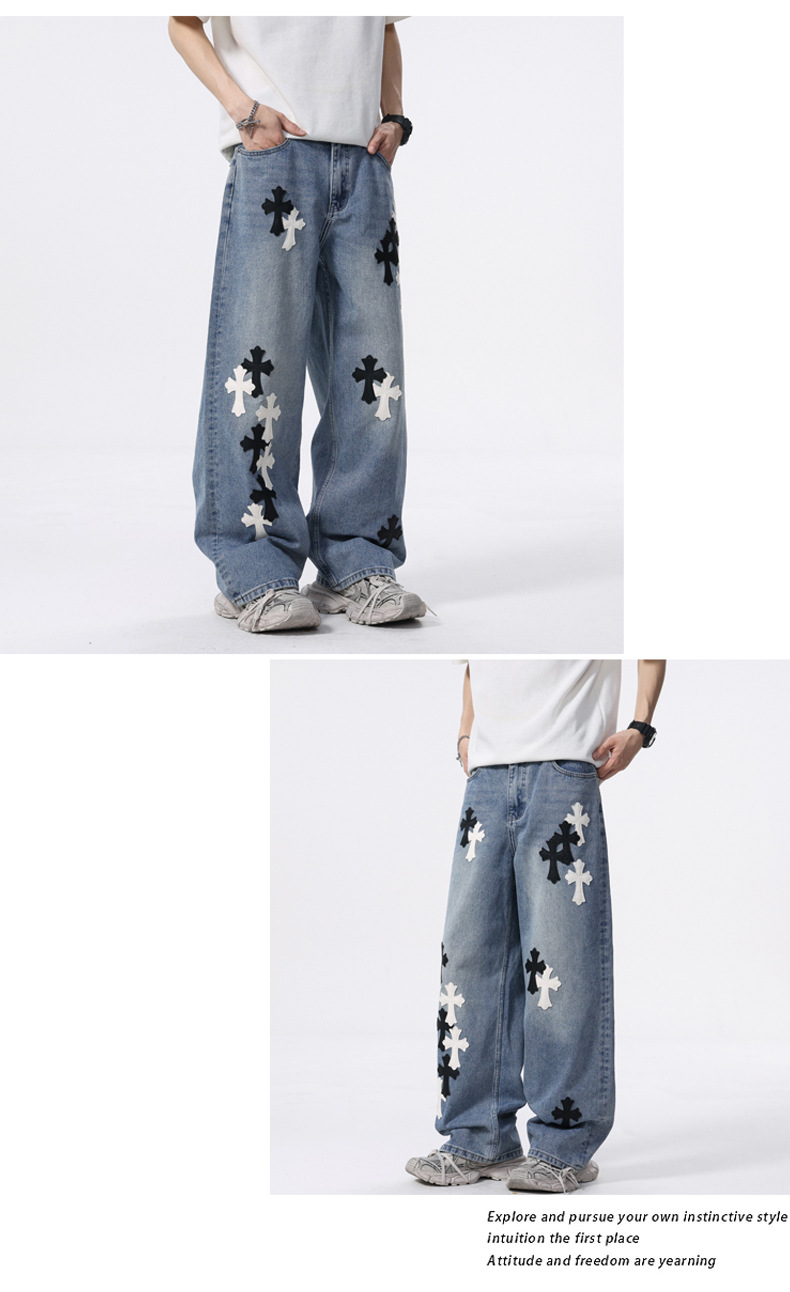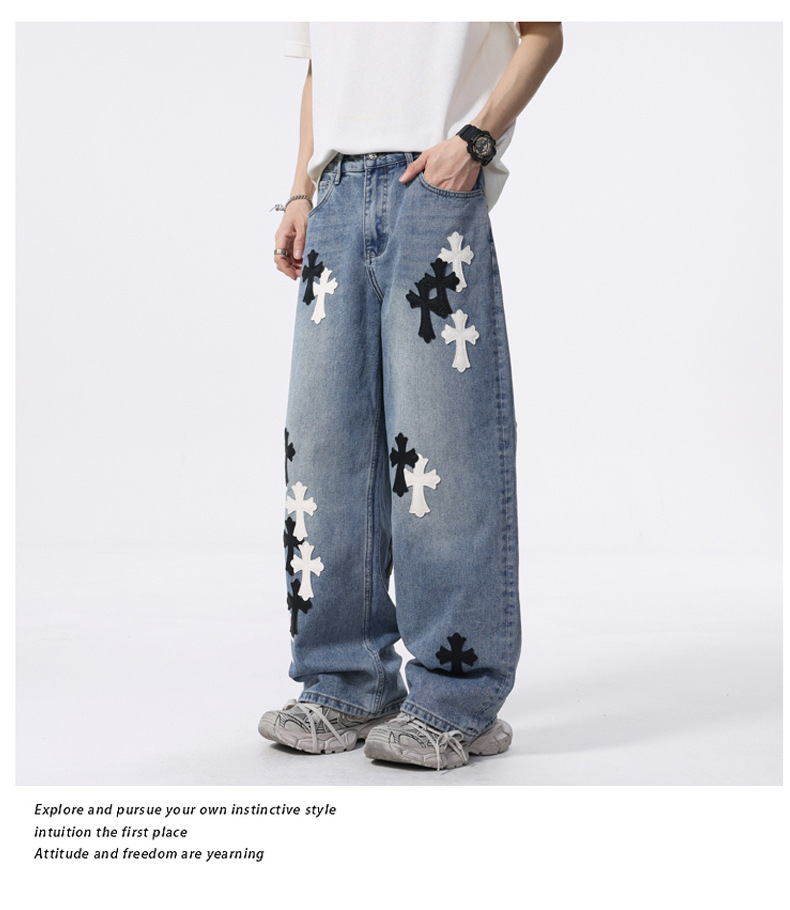 Shangyun 아메리칸 하이 스트리트 가죽 크로스 자수 바닥 길이 와이드 레그 스트레이트 청바지 남성용 루즈 라이트 럭셔리 바지스토어 가기