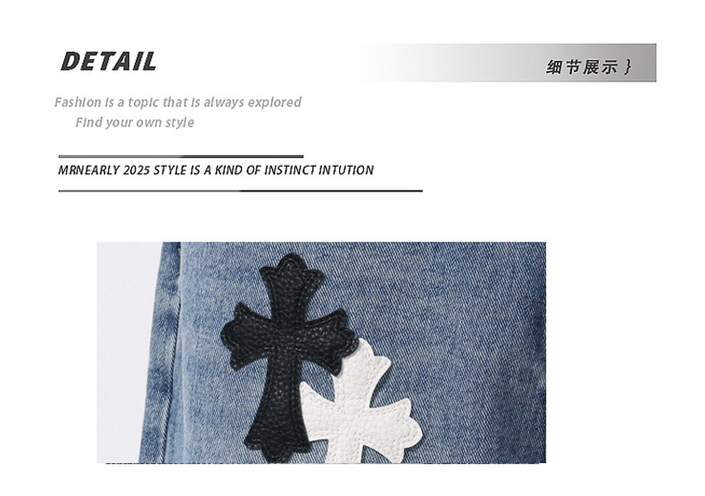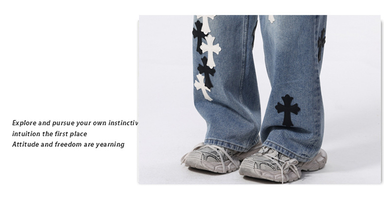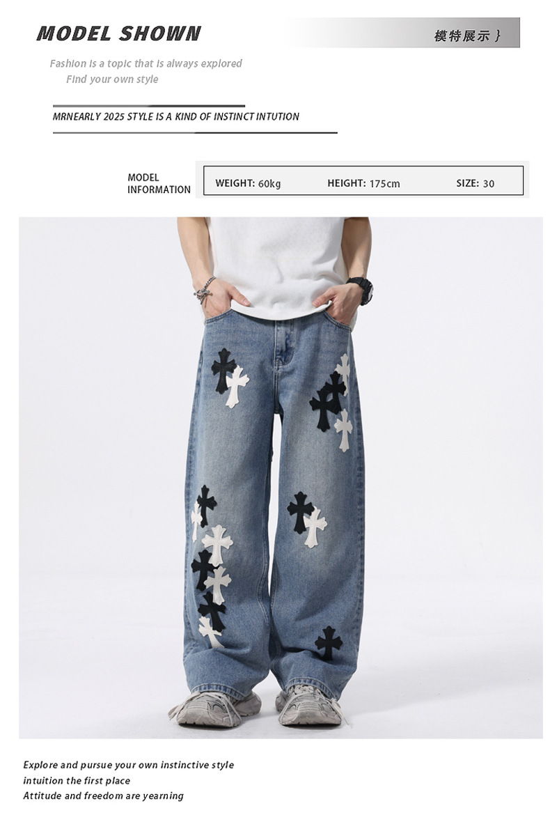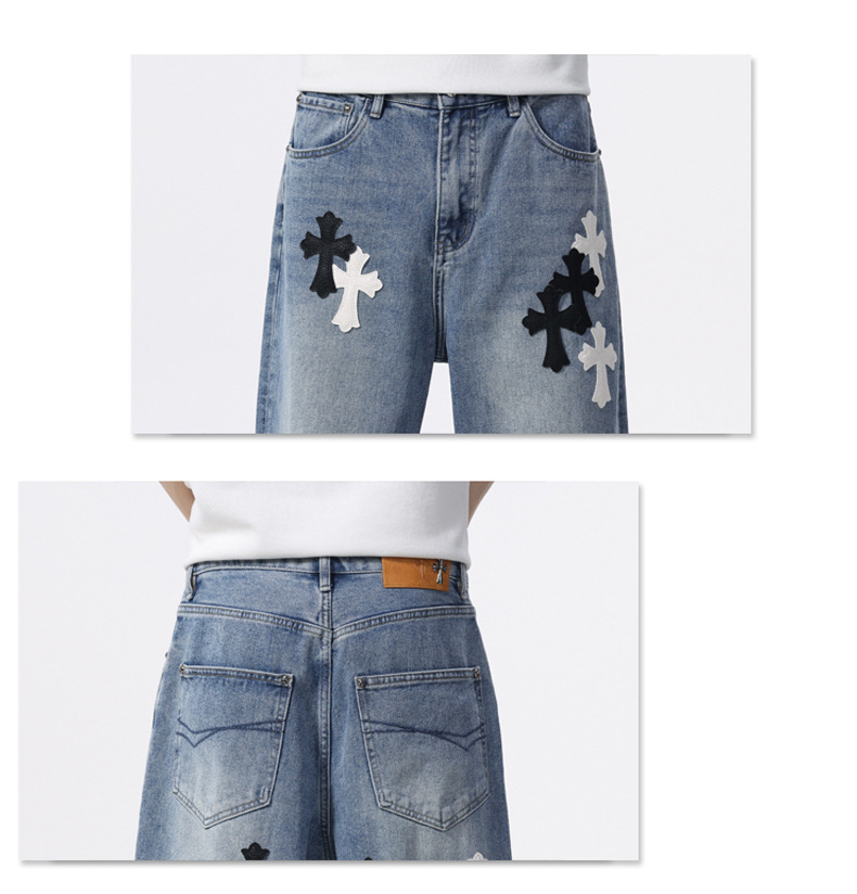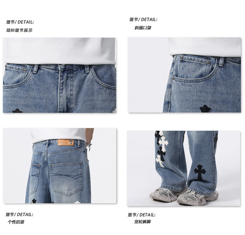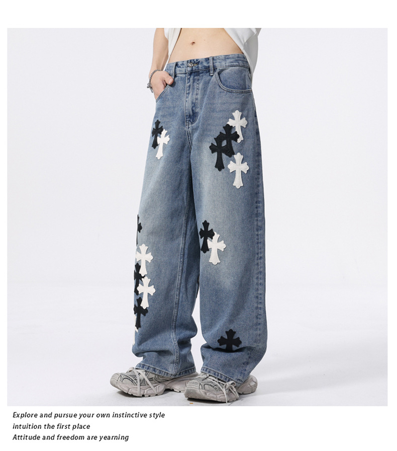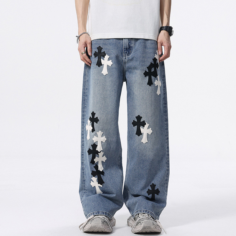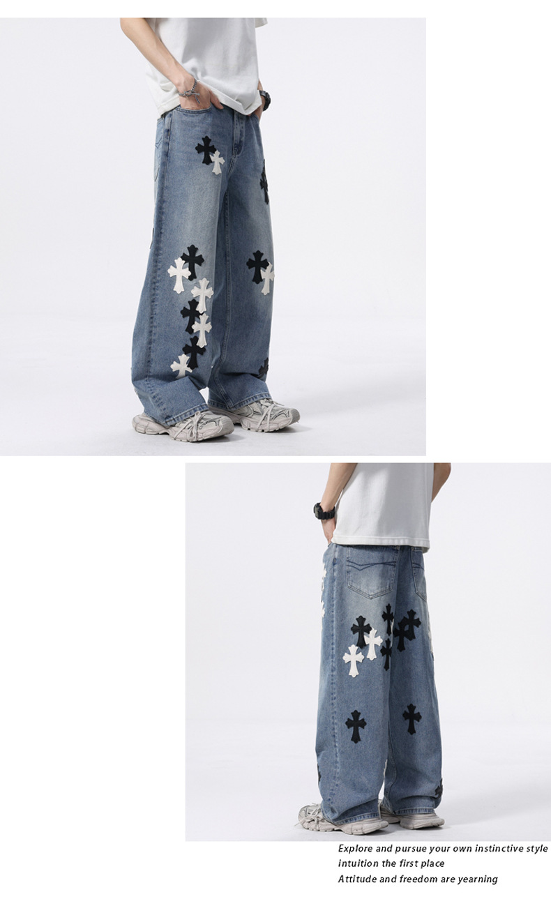 Shangyun 아메리칸 하이 스트리트 가죽 크로스 자수 바닥 길이 와이드 레그 스트레이트 청바지 남성용 루즈 라이트 럭셔리 바지스토어 가기