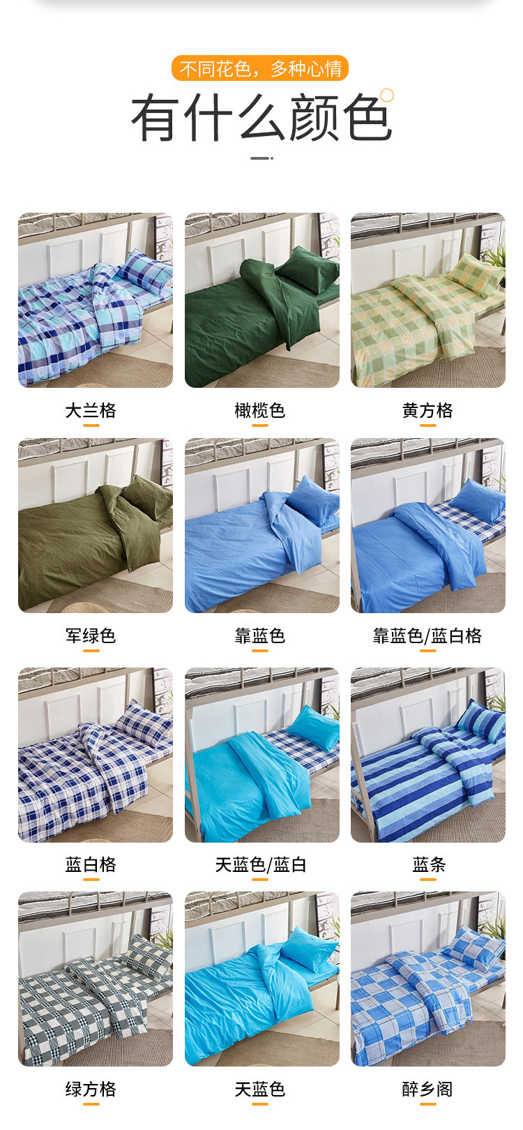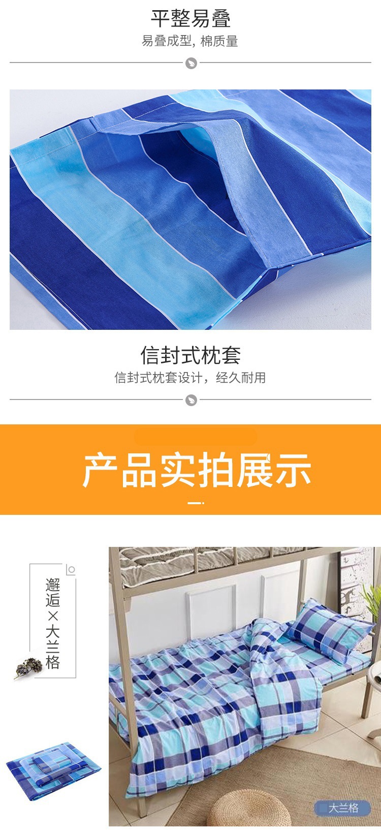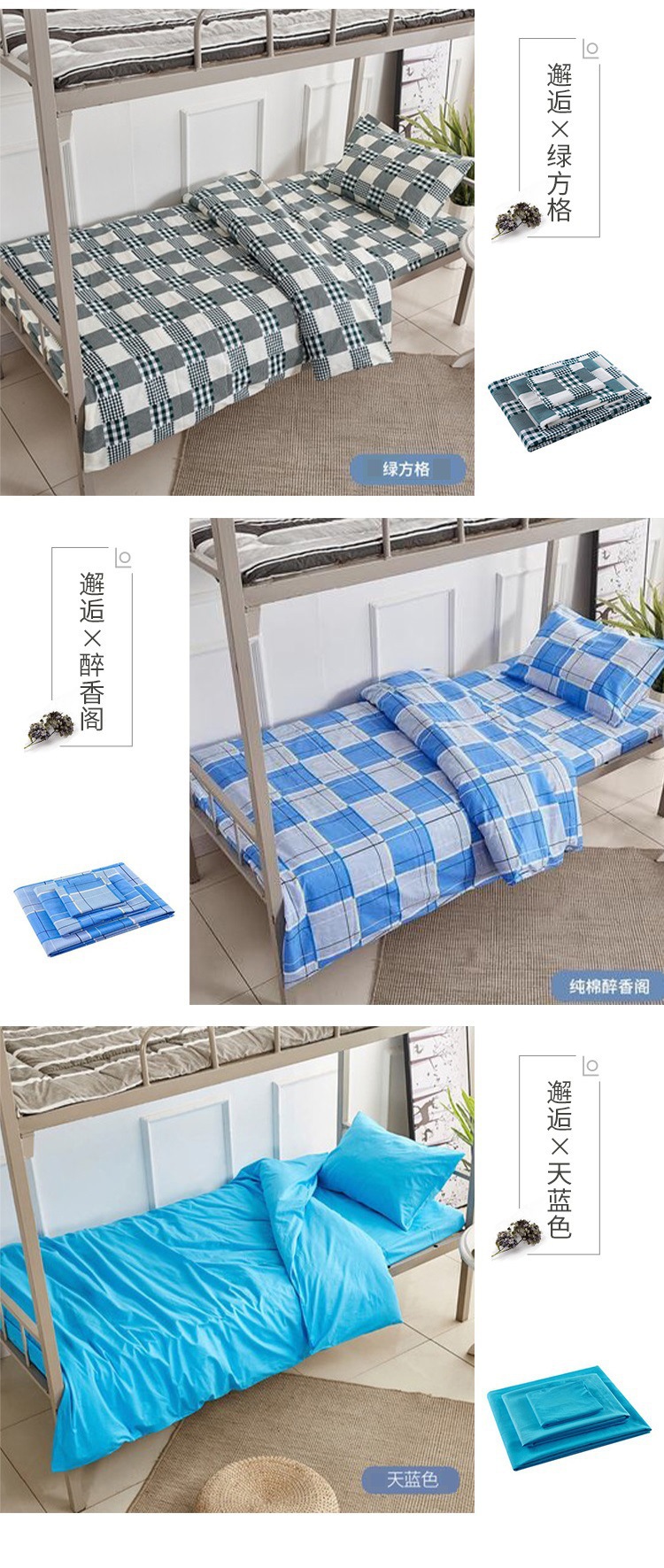 제조업체 도매 학생 기숙사 순면 3종 세트 학교 파란색 격자 무늬 침대 시트 이불 커버 군사 훈련 기숙사 3종 세트스토어 가기