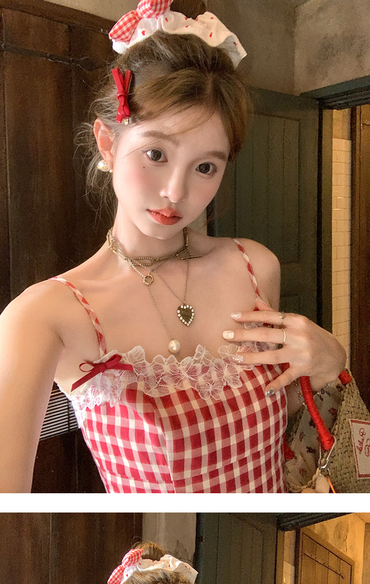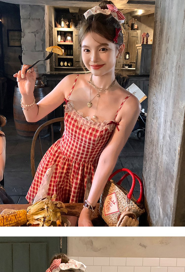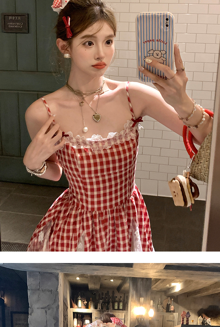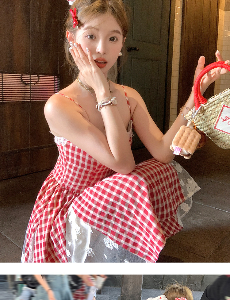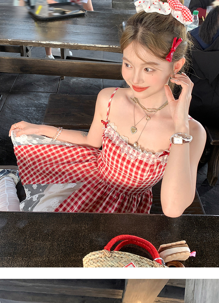 중간 길이의 빨간색 체크무늬 끈 원피스 여성 여름 프렌치 스타일 달콤한 미니 원피스 스트리트 스타일스토어 가기
