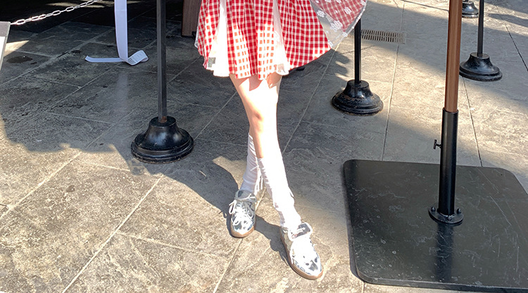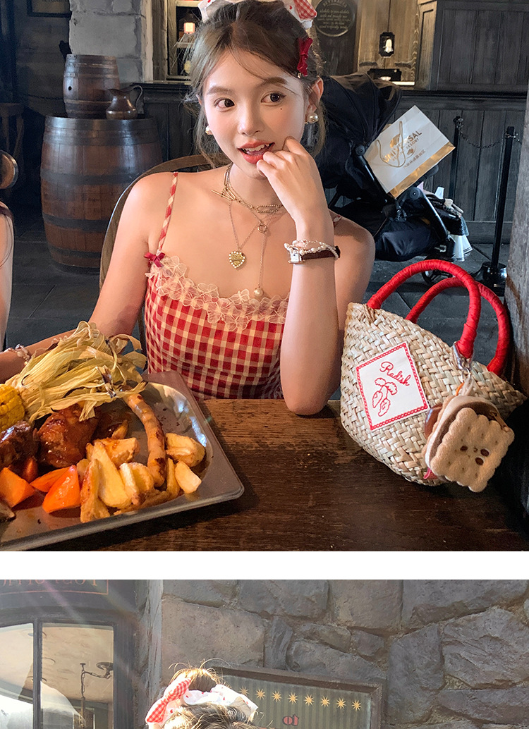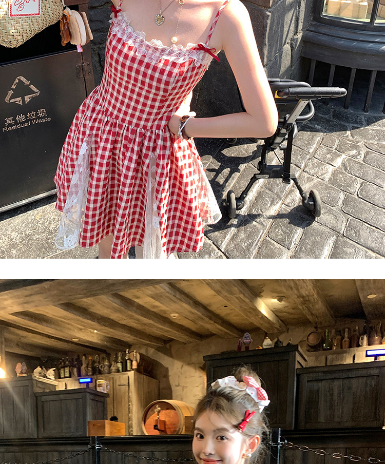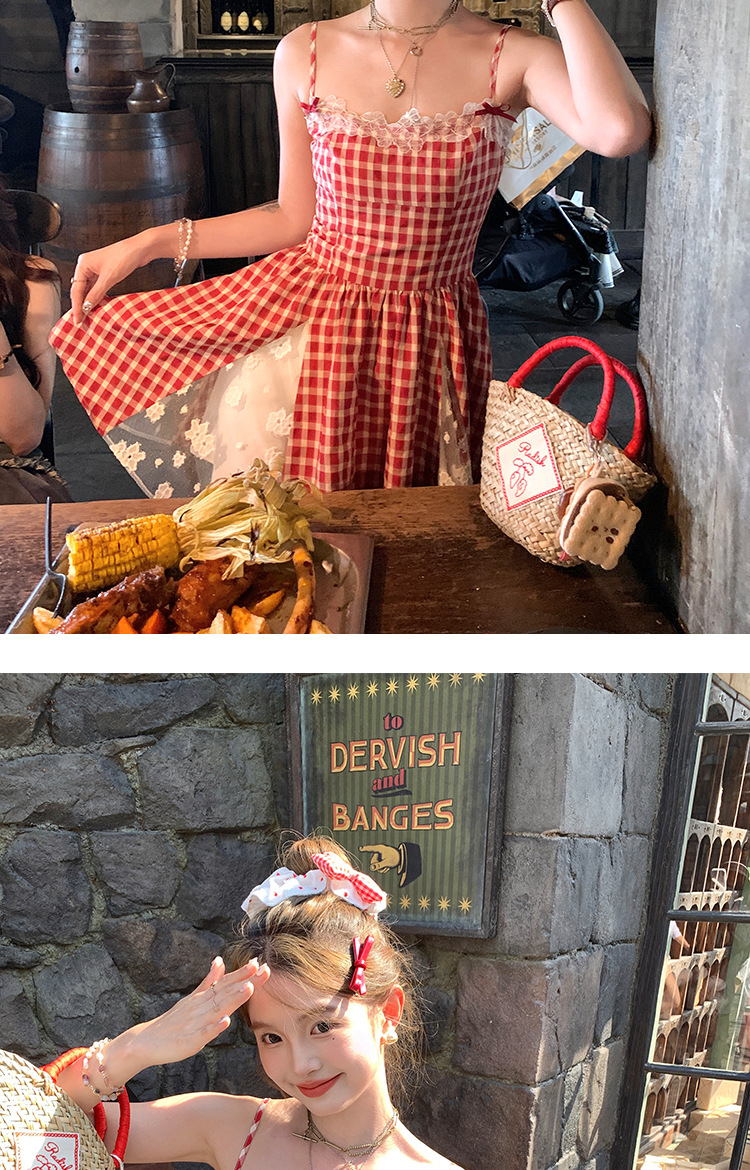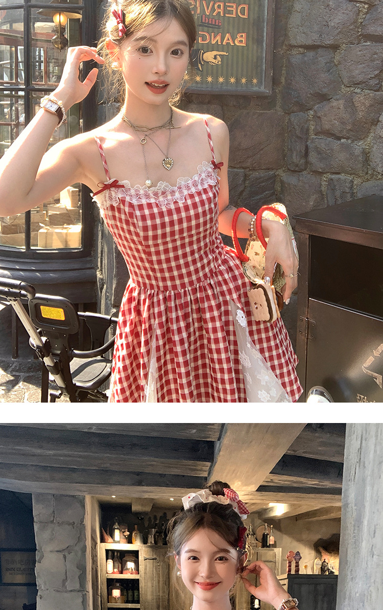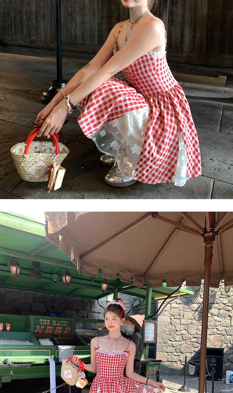 중간 길이의 빨간색 체크무늬 끈 원피스 여성 여름 프렌치 스타일 달콤한 미니 원피스 스트리트 스타일스토어 가기