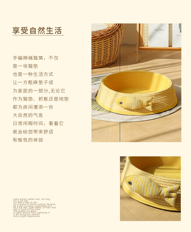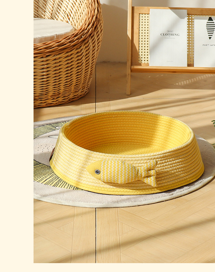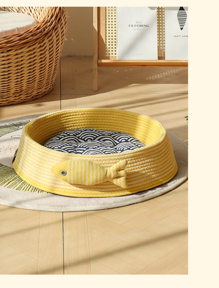 • 접힌 골판지 노란색 + 작은 물고기 + 흰색 면 패드 + 흰색 베개 + 매트
