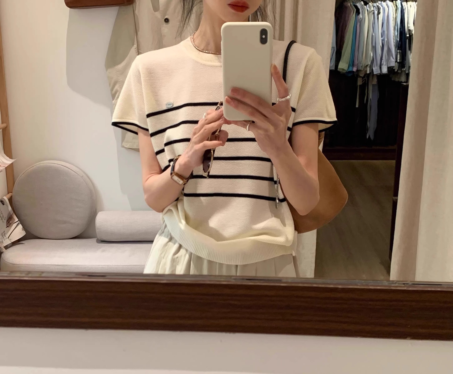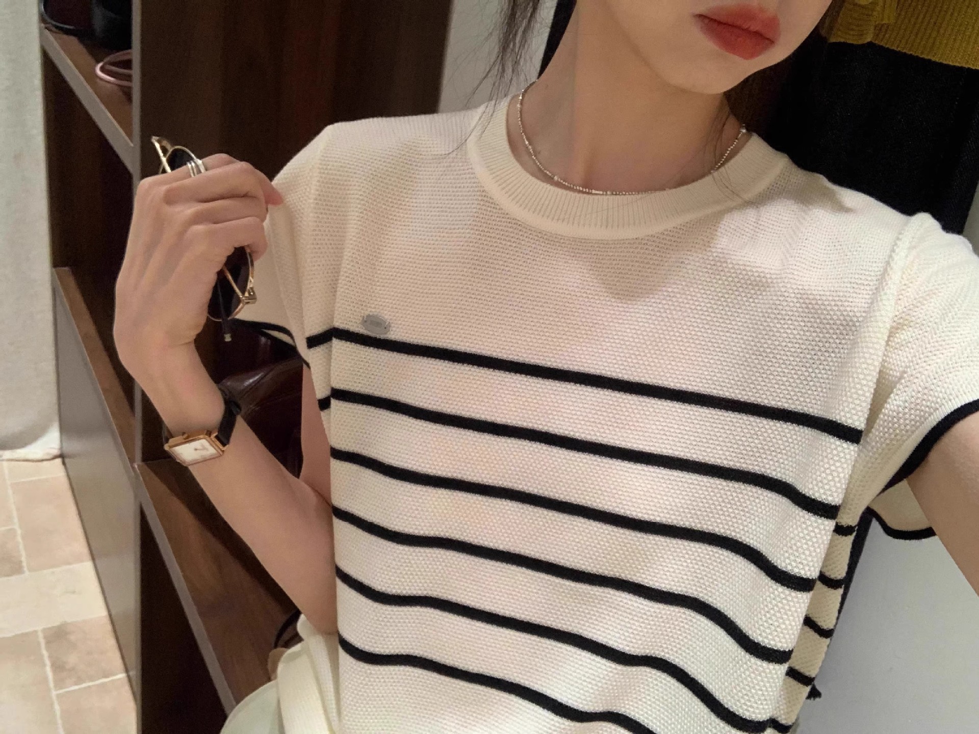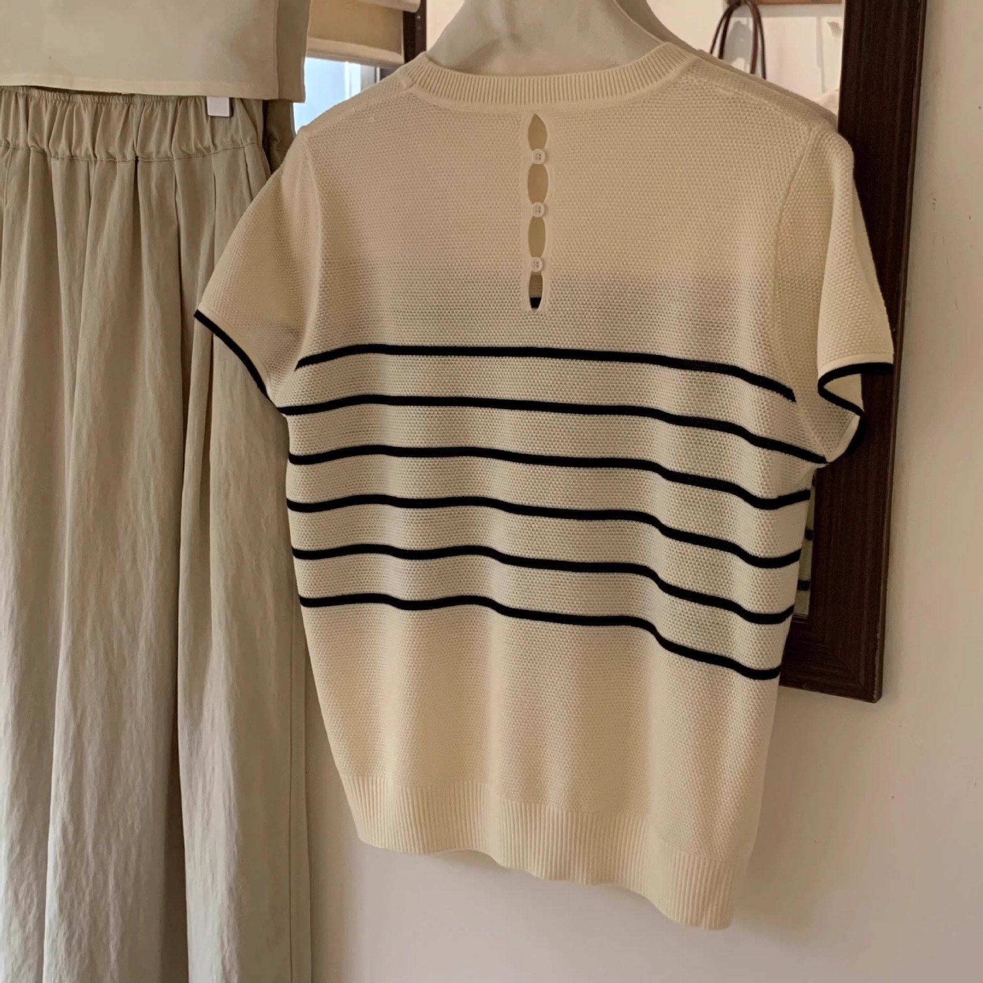后背镂空冰丝正肩短袖T恤女夏季薄款单穿设计感小众针织条纹上衣