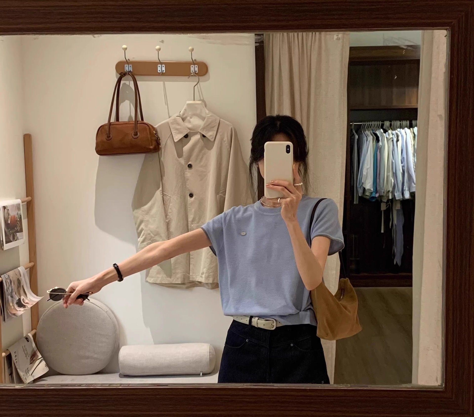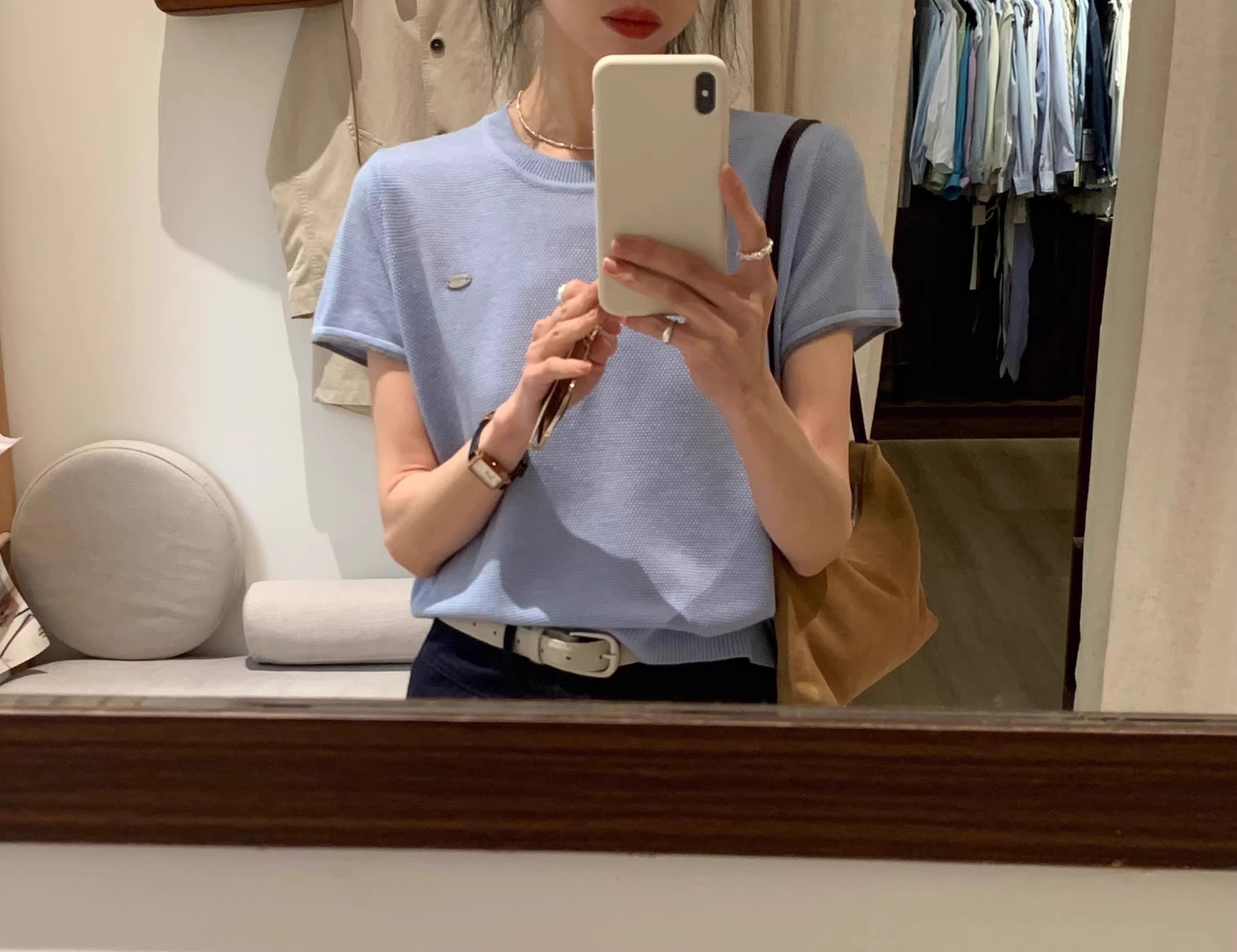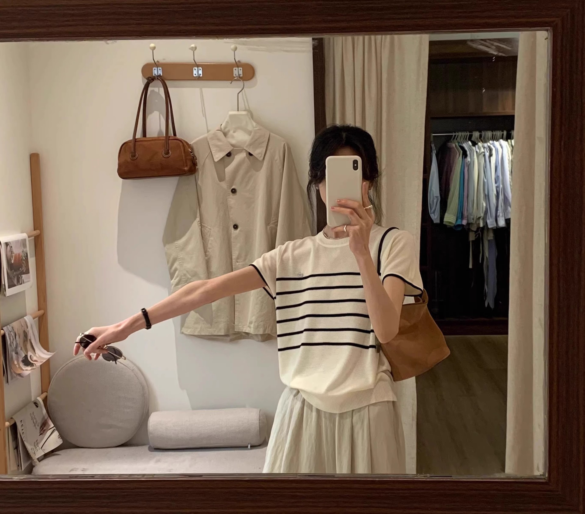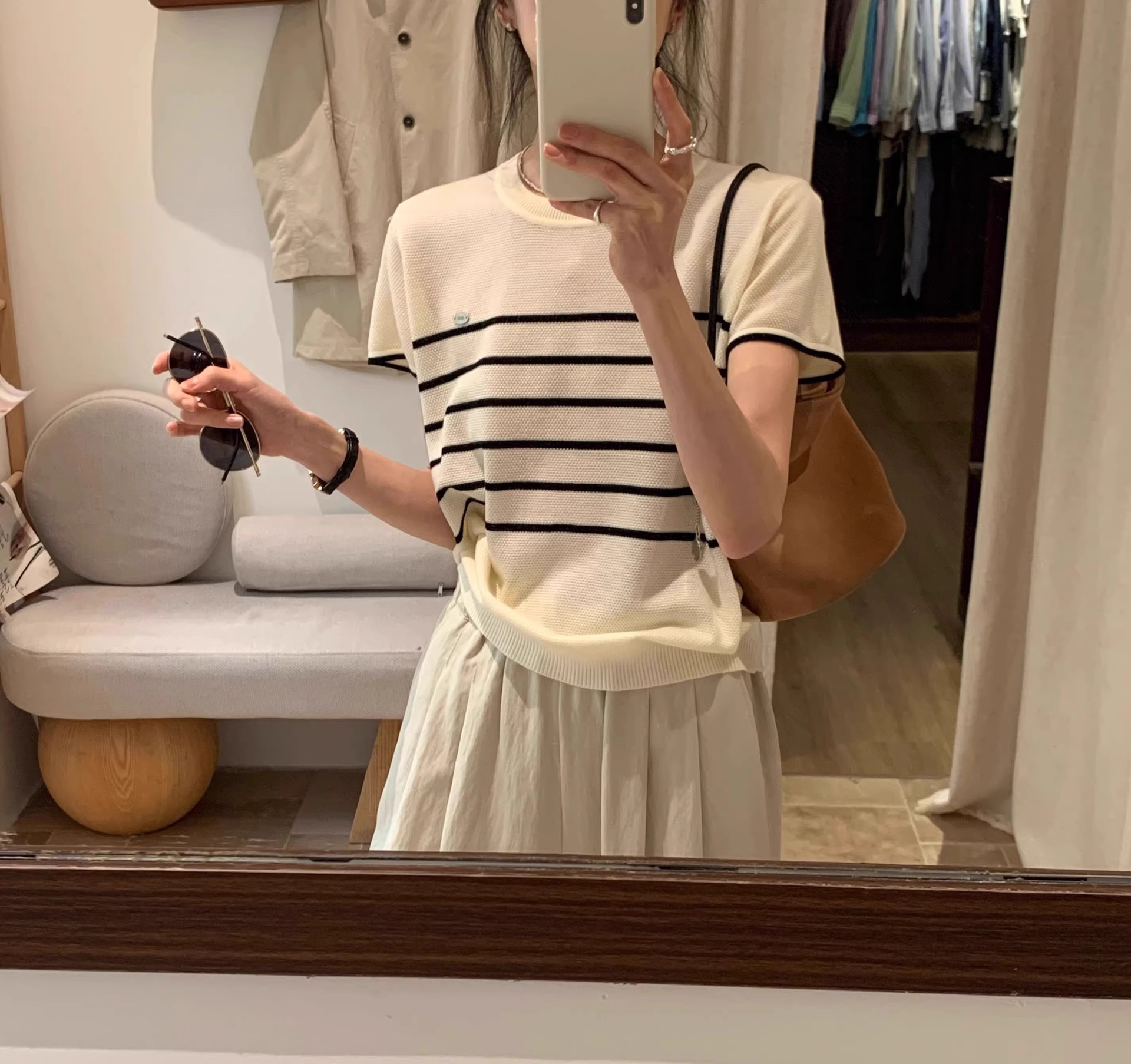 后背镂空冰丝正肩短袖T恤女夏季薄款单穿设计感小众针织条纹上衣