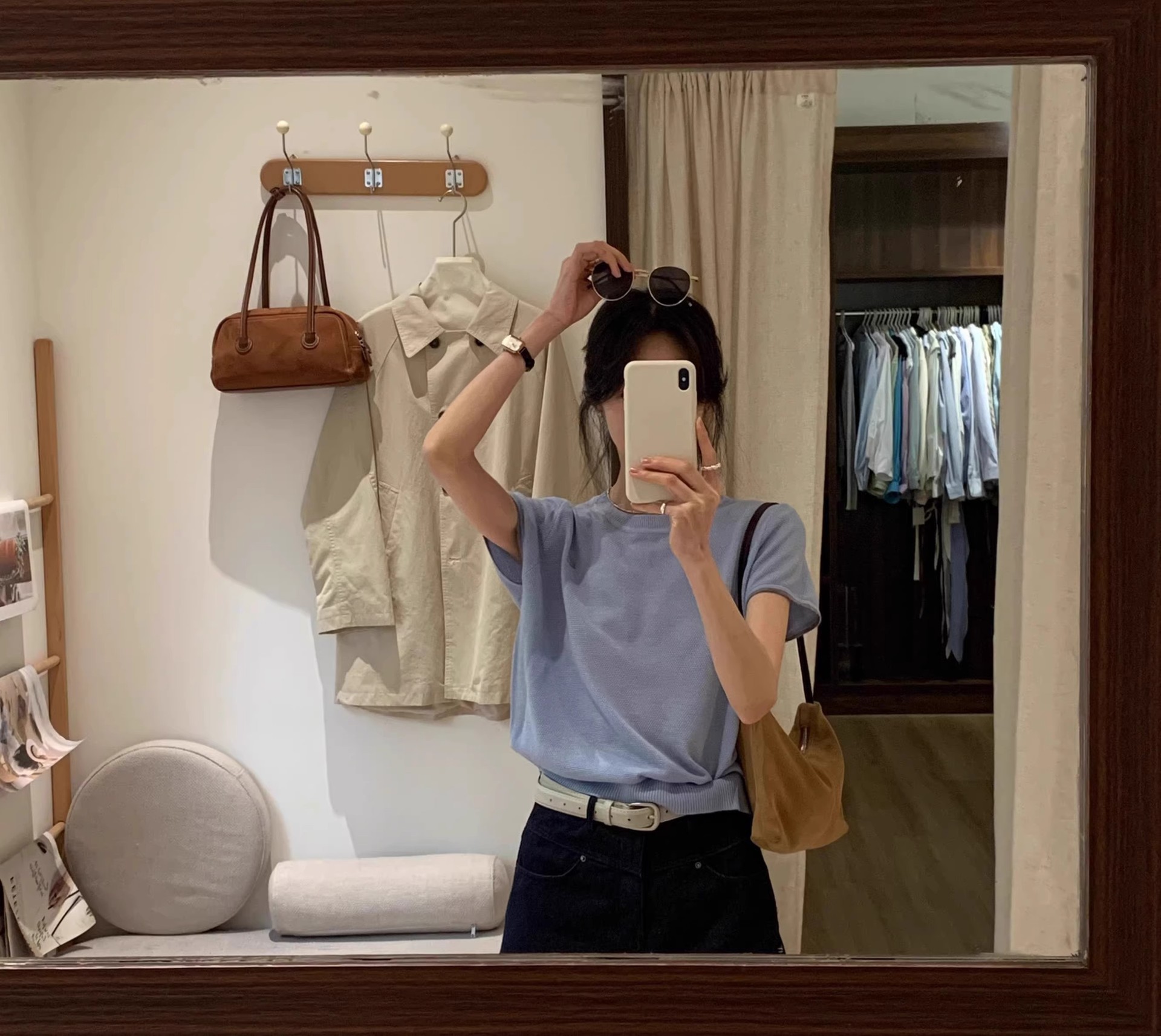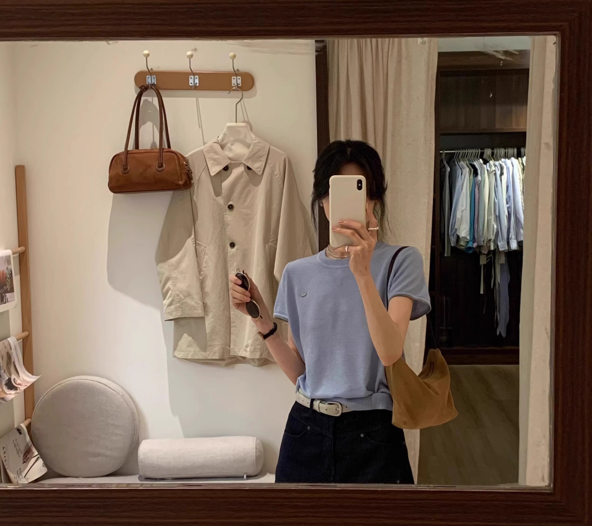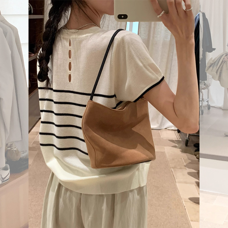 백 할로우 아이스 실크 어깨 반팔 티셔츠 여성용 여름 얇은 싱글웨어 디자인 틈새 니트 스트라이프 탑스토어 가기
