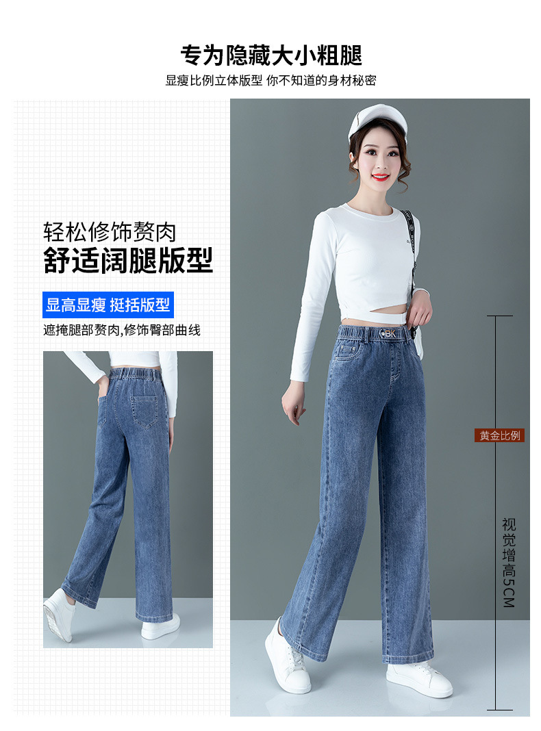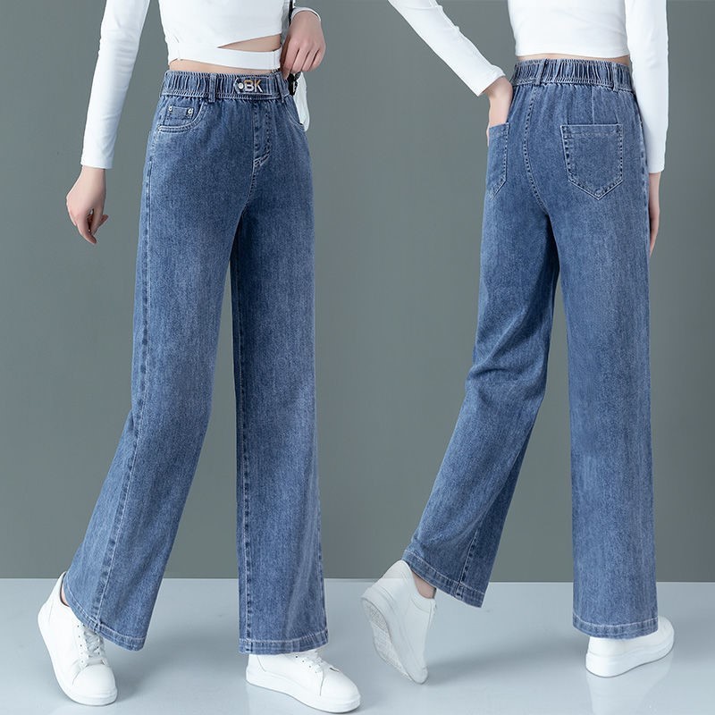 2024년 봄 여성용 신축성 있는 허리 청바지 새로운 루즈 스트레이트 바지 봄, 가을 캐주얼 슬리밍 드레이프 와이드 팬츠스토어 가기