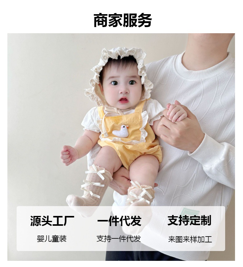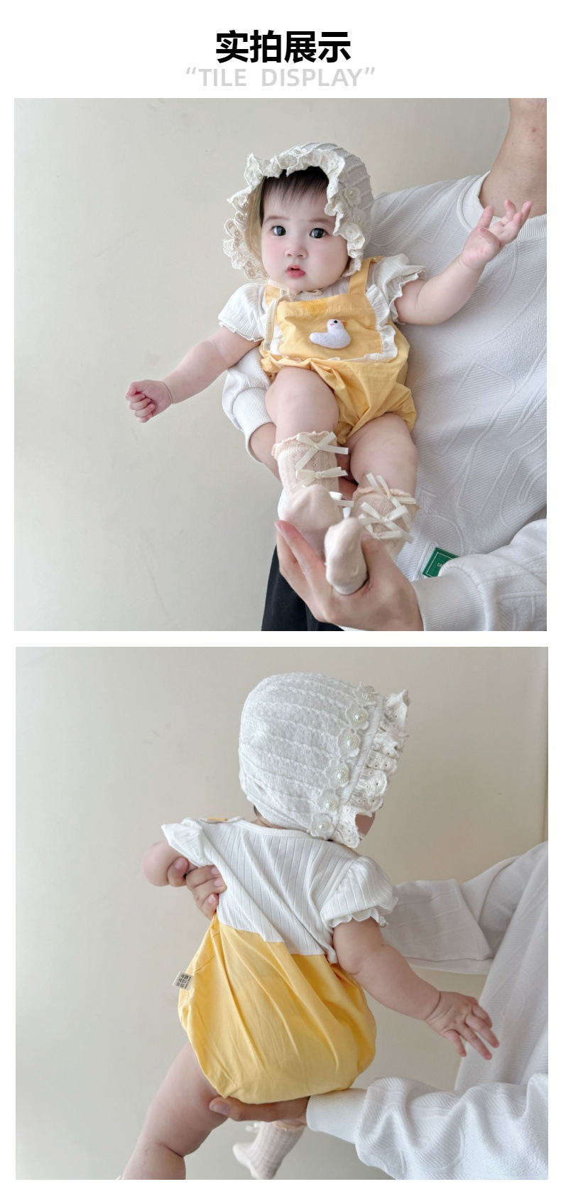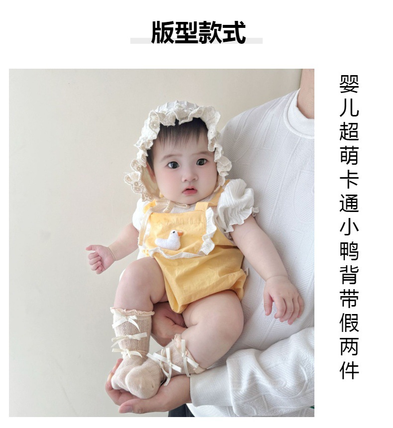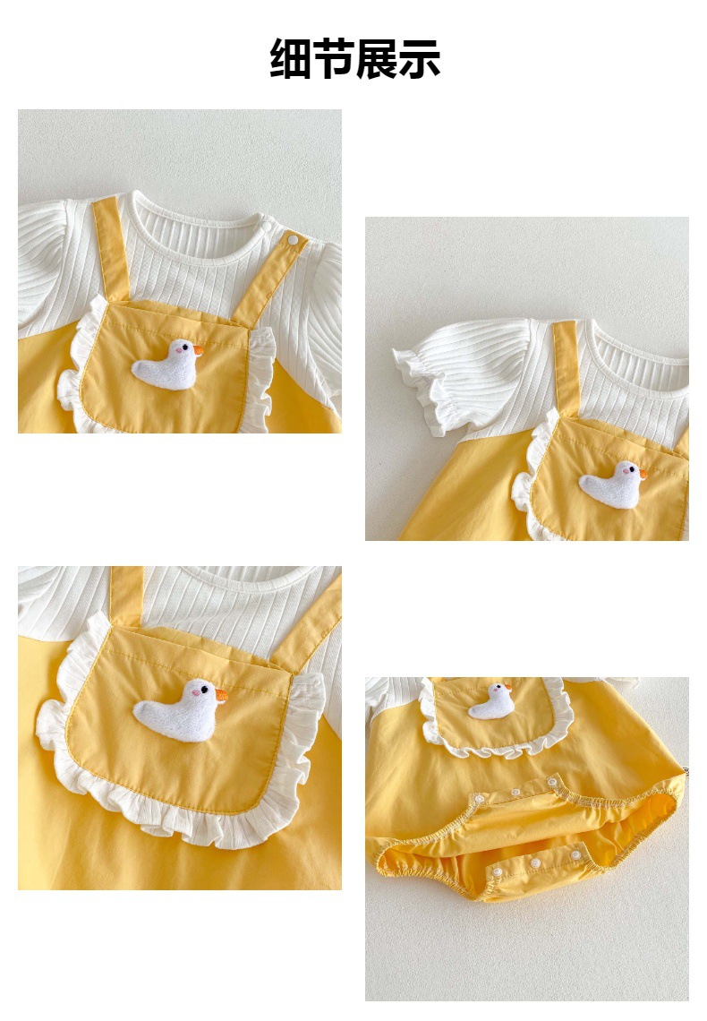 아기의 여름 새로운 가짜 두 조각 가방 토끼 옷 작은 달-오래 된 아기 슈퍼 귀여운 카드 사랑 오리 반팔 한 조각 등반 세트스토어 가기