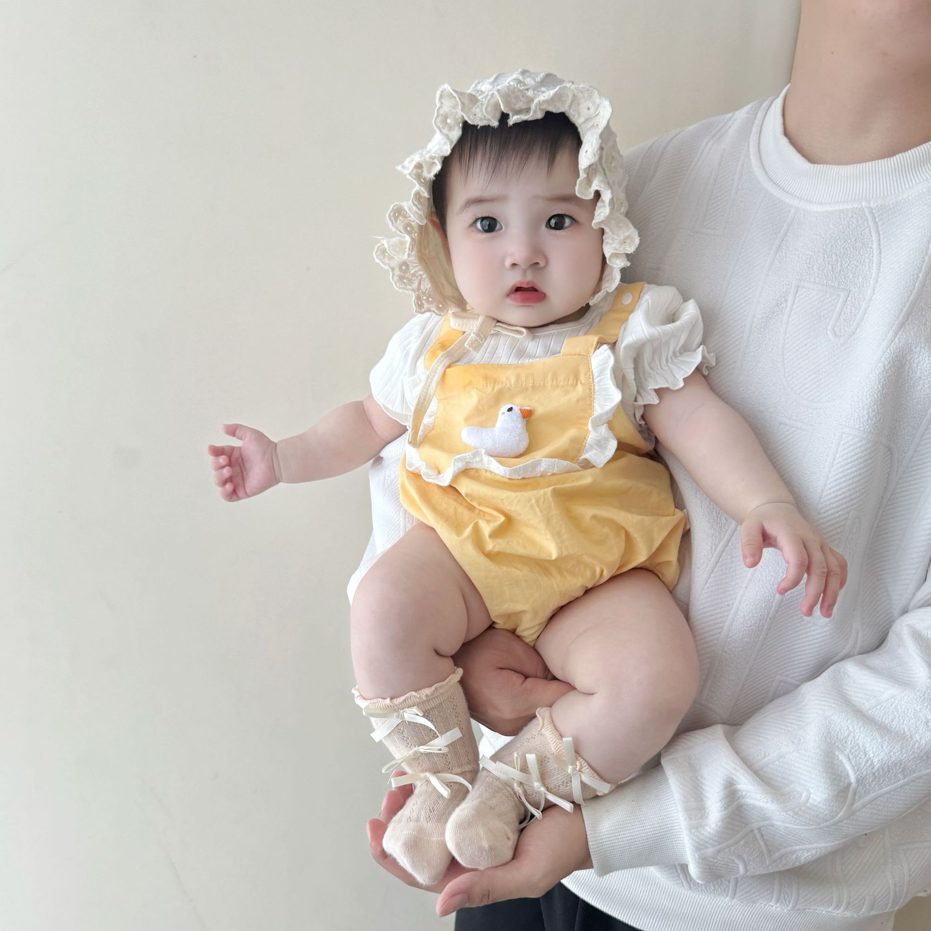 아기의 여름 새로운 가짜 두 조각 가방 토끼 옷 작은 달-오래 된 아기 슈퍼 귀여운 카드 사랑 오리 반팔 한 조각 등반 세트