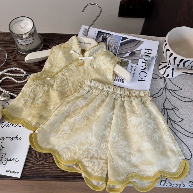 한국 아동복 2025 새로운 여름 소녀 새로운 중국 조끼 최고 디자인 자카드 국가 스타일 반바지 세트