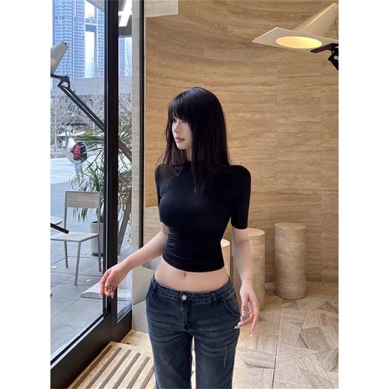 여성 하프 하이 칼라 블랙 숄더 미드 슬리브 티셔츠 여름 뉴 프랑스 하이 엔드 슬림 핏 하프 슬리브 탑스토어 가기