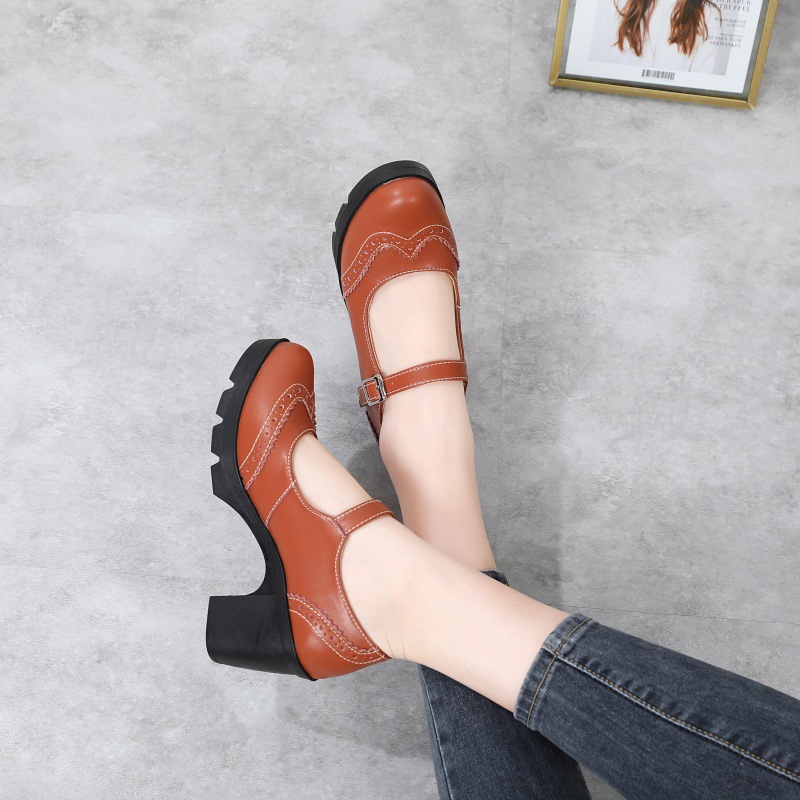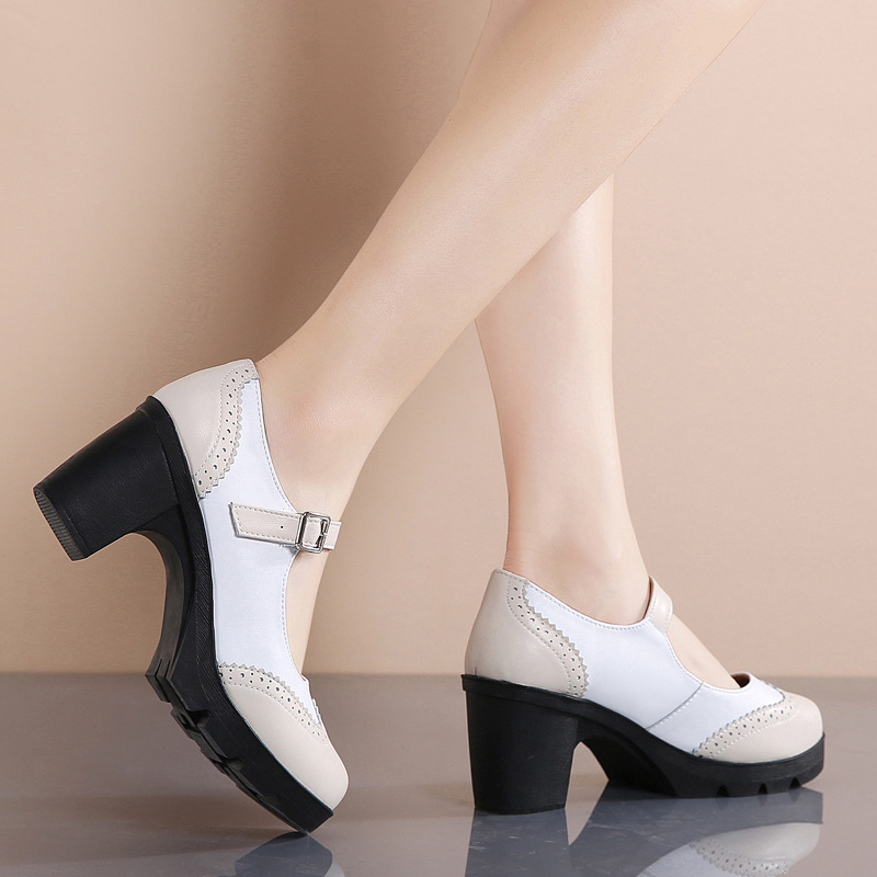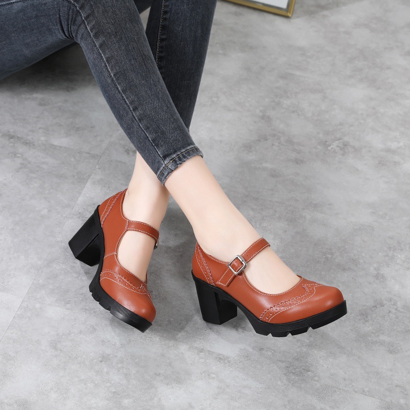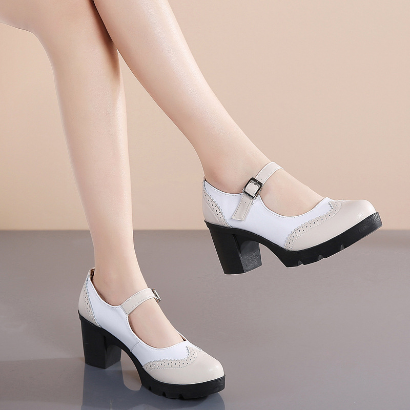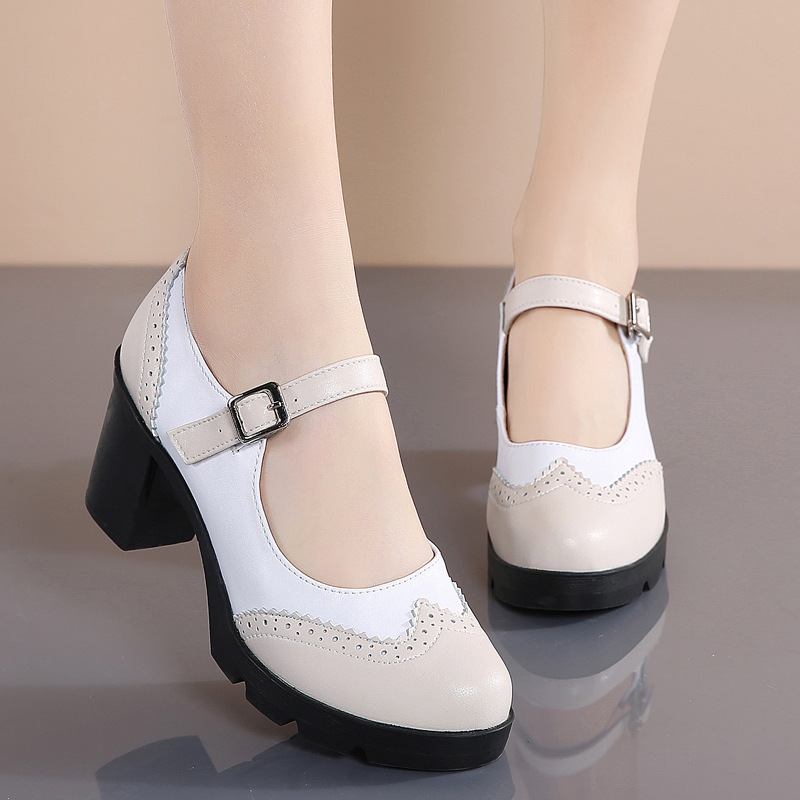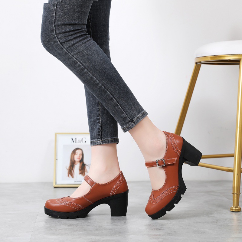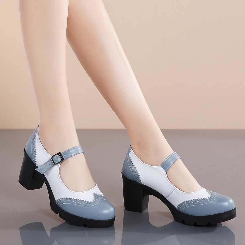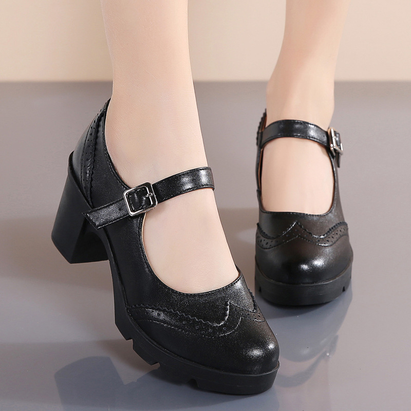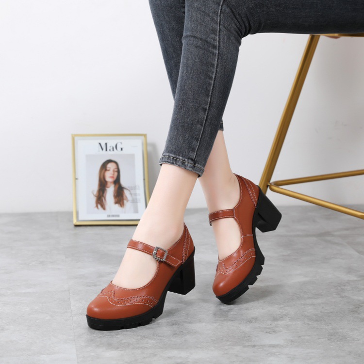 봄 가을 여성용 하이힐, 얕은 굽, 유럽풍 패션, 버클 장식, 편안하고 다용도, 작은 가죽 신발, 중간 굽, 여성용 메리제인 슈즈스토어 가기