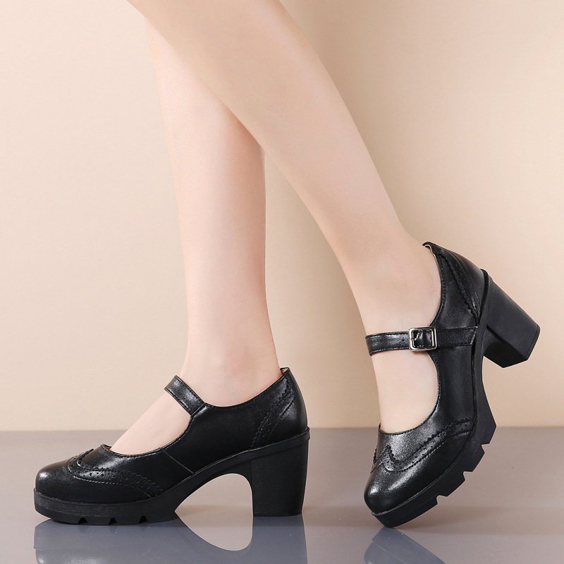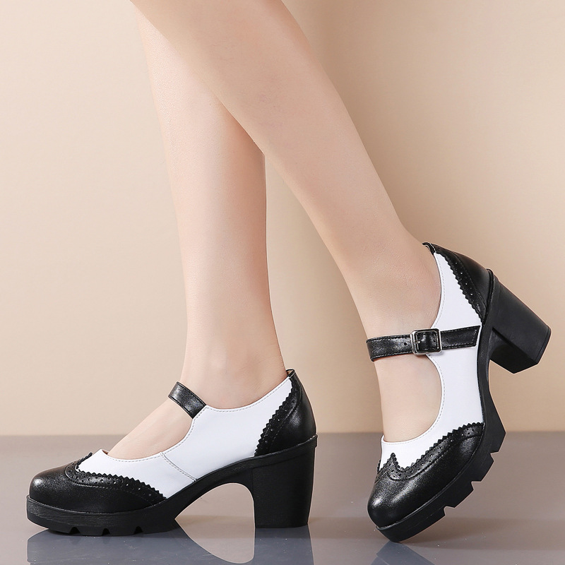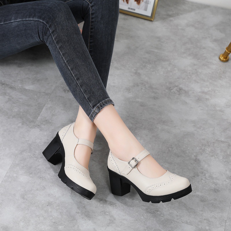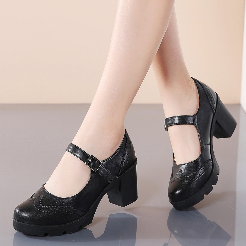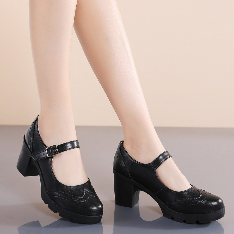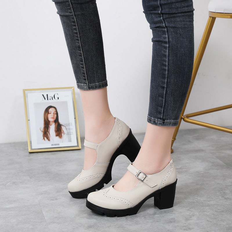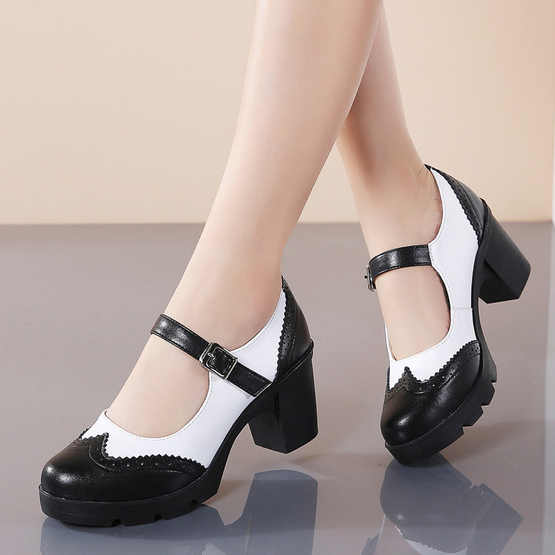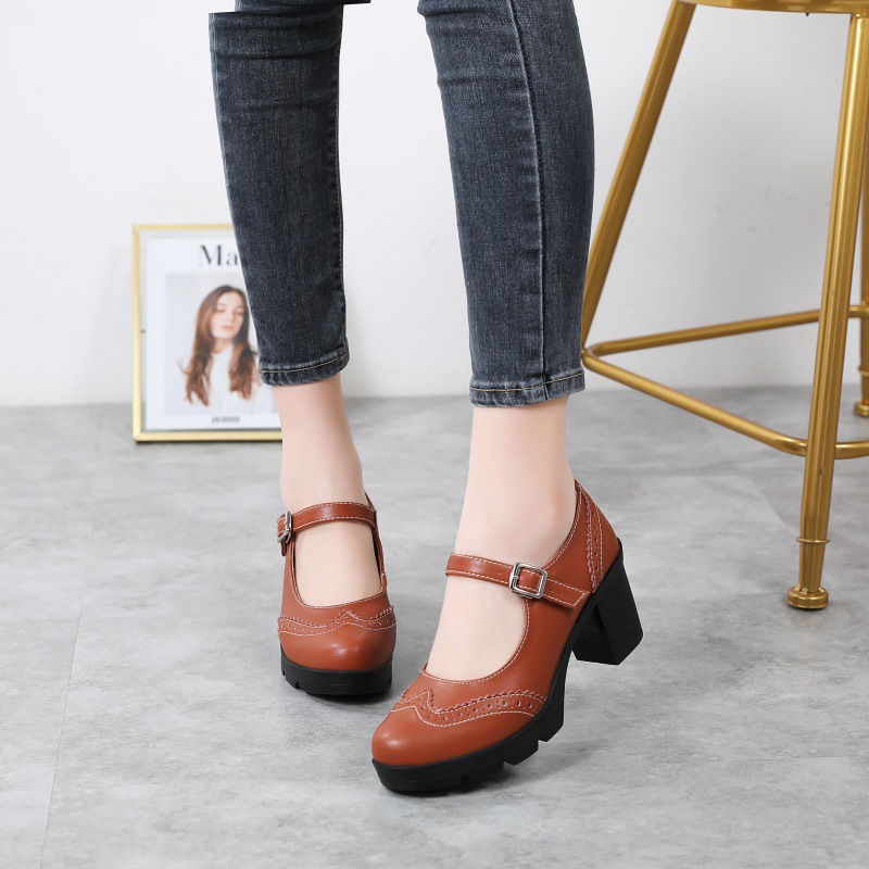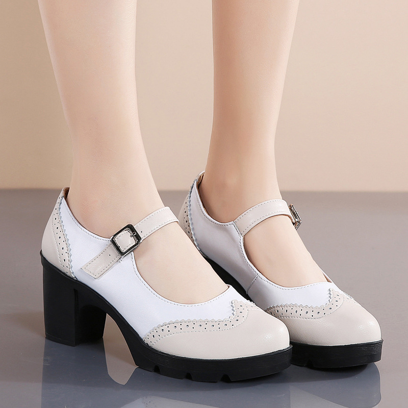 봄 가을 여성용 하이힐, 얕은 굽, 유럽풍 패션, 버클 장식, 편안하고 다용도, 작은 가죽 신발, 중간 굽, 여성용 메리제인 슈즈스토어 가기