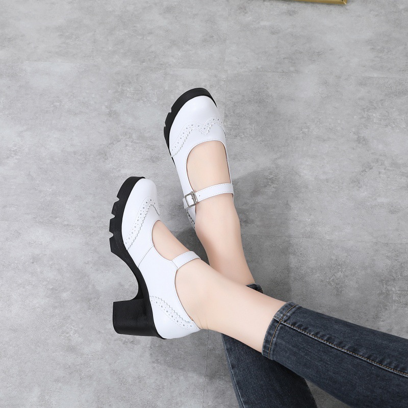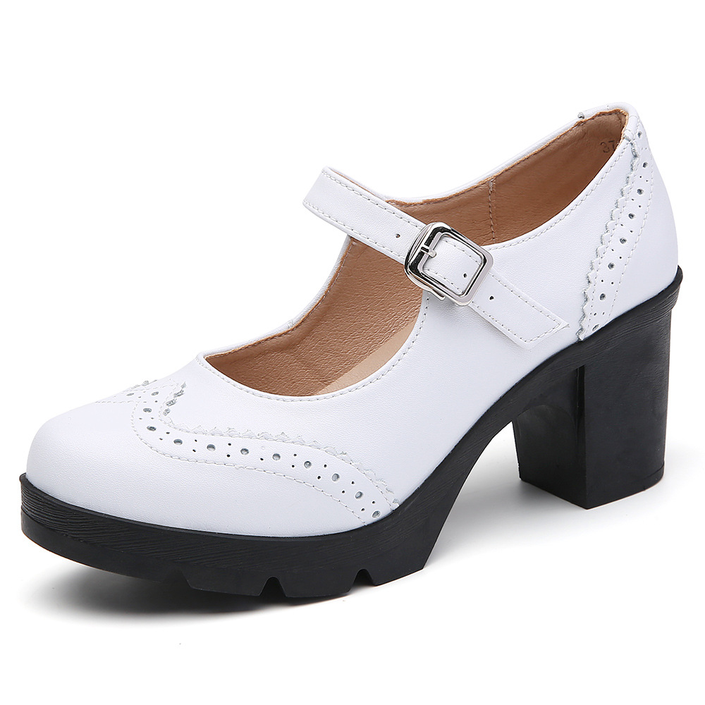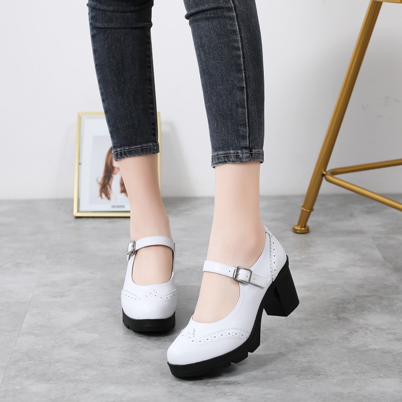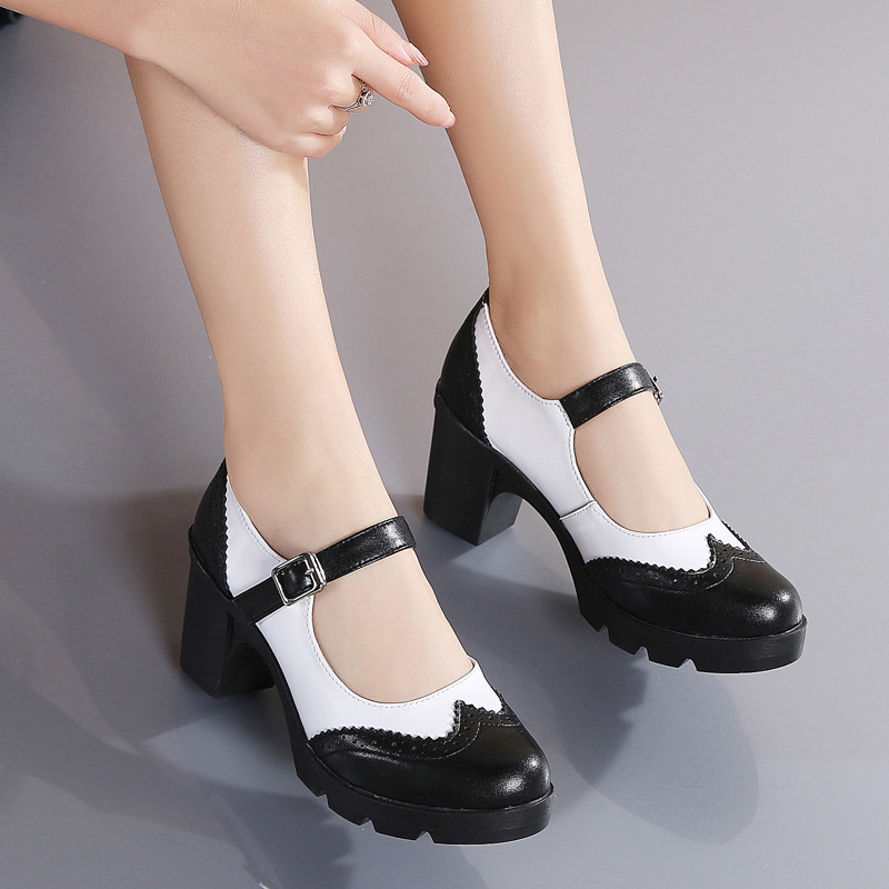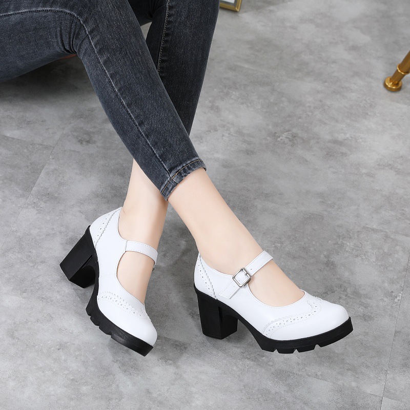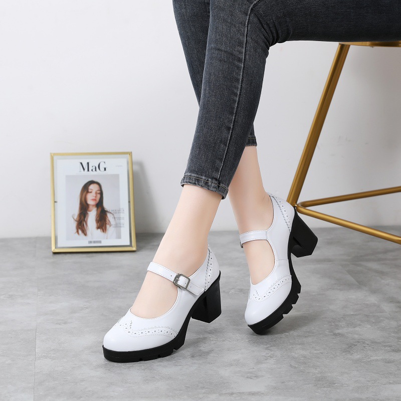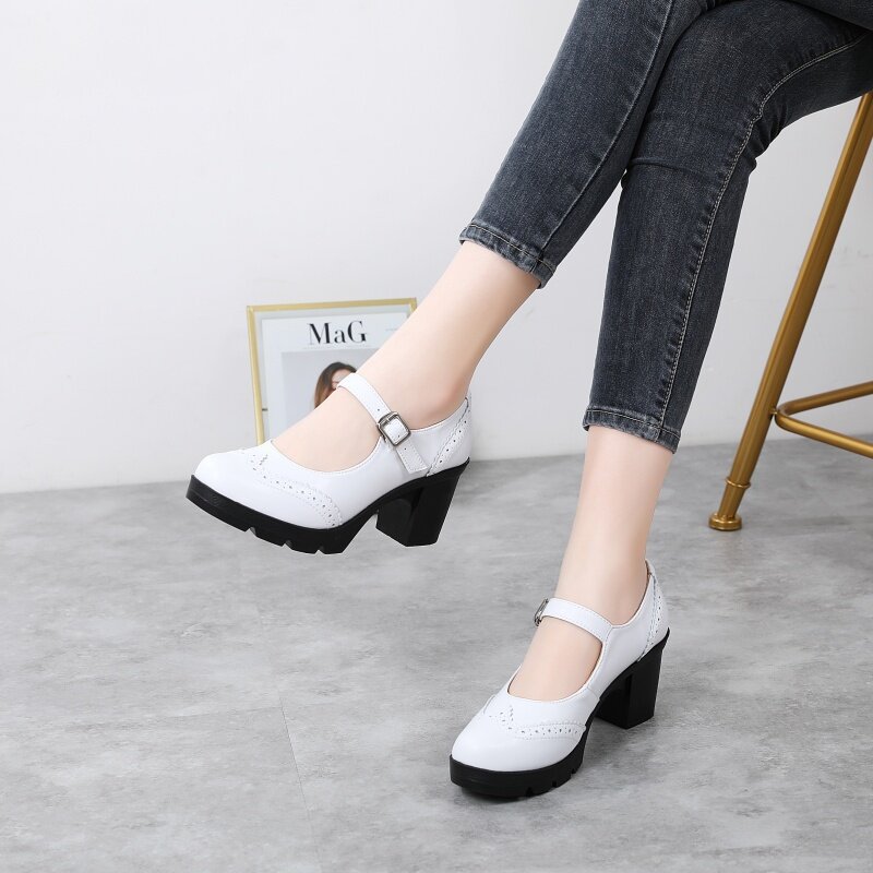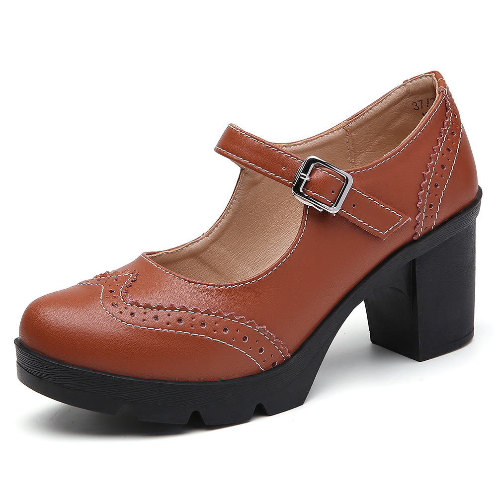 봄 가을 여성용 하이힐, 얕은 굽, 유럽풍 패션, 버클 장식, 편안하고 다용도, 작은 가죽 신발, 중간 굽, 여성용 메리제인 슈즈스토어 가기