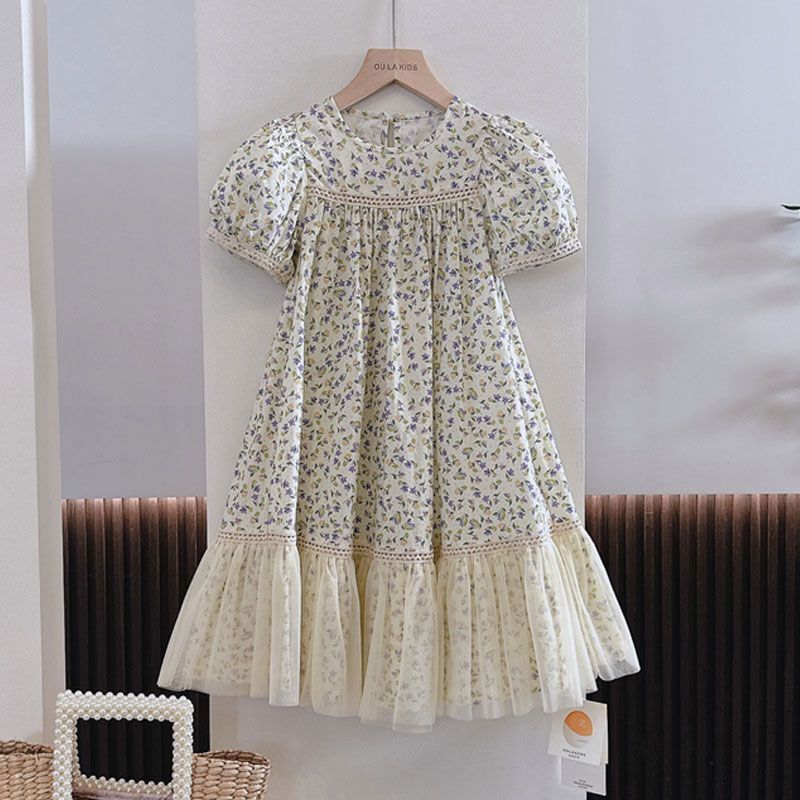소녀의 꽃 원피스 여름 원피스 2025 새로운 한국 스타일 중대형 어린이 거품 소매 레이스 바느질 공주 원피스스토어 가기