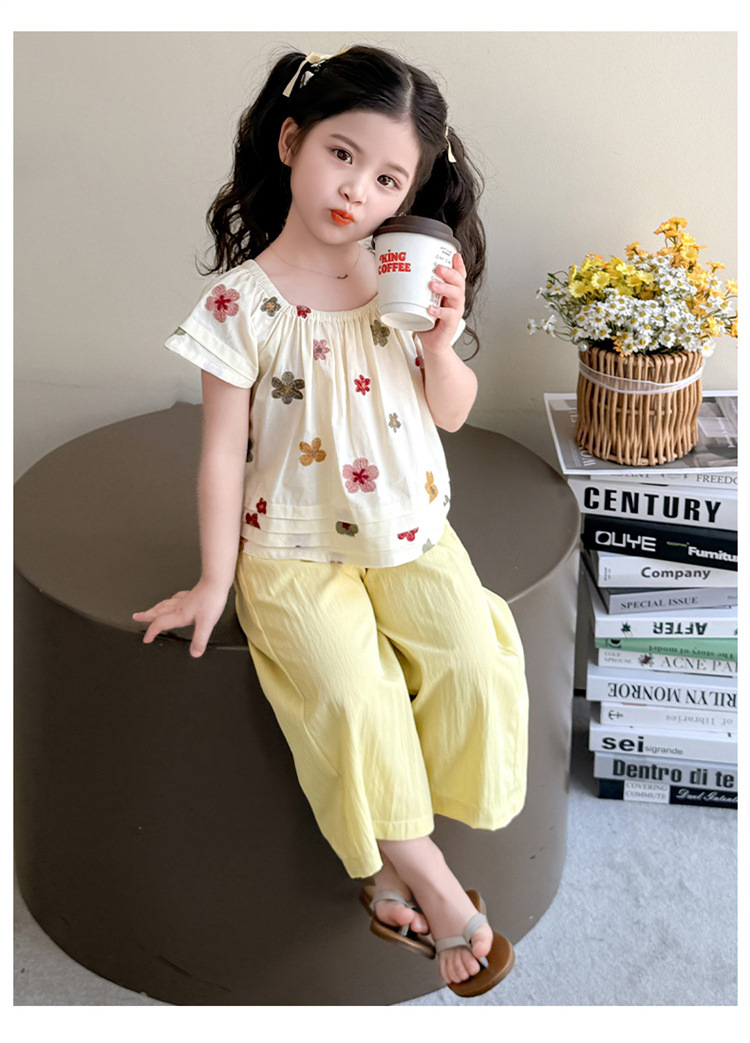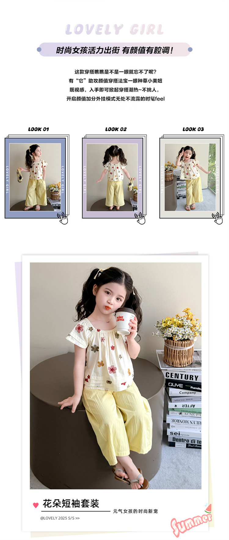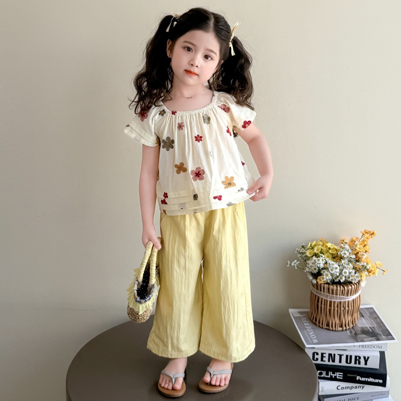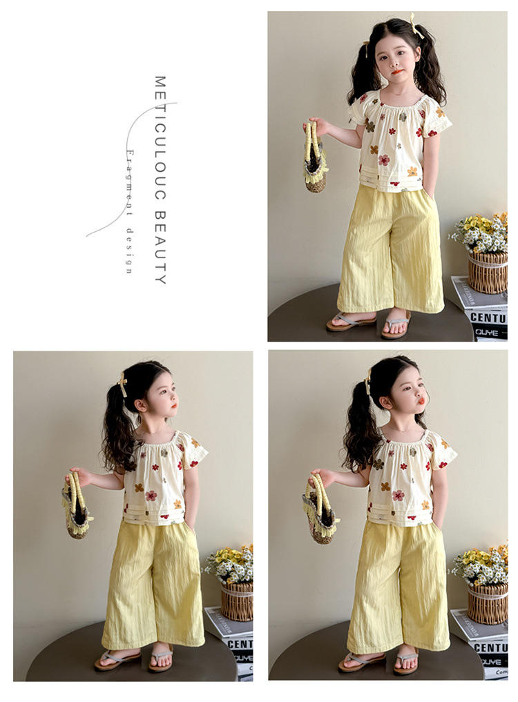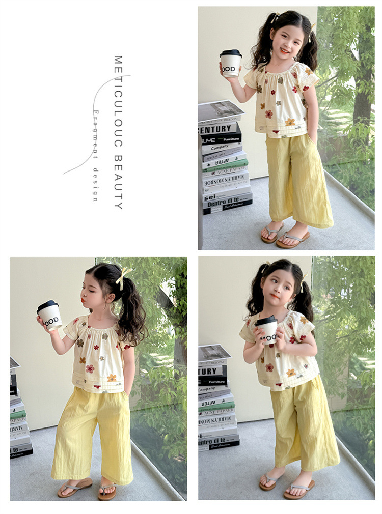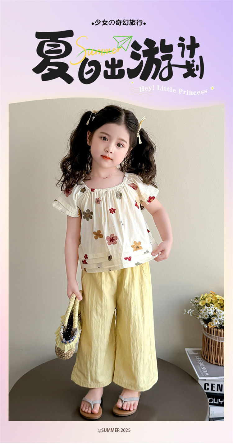 여자 꽃 넓은 다리 바지 세트 2025 여름 이 패션 소녀 세련된 두 조각 세트 어린이 여름 원피스스토어 가기