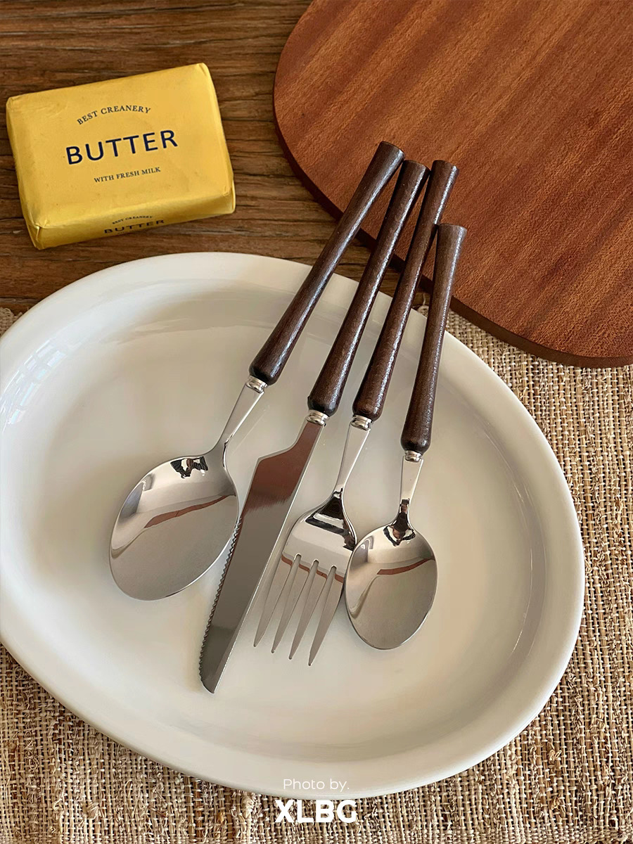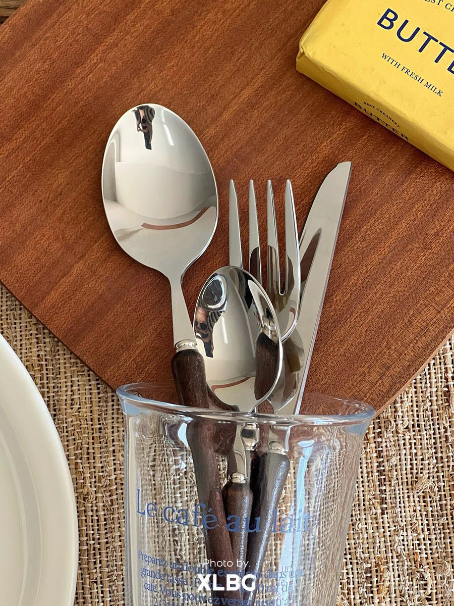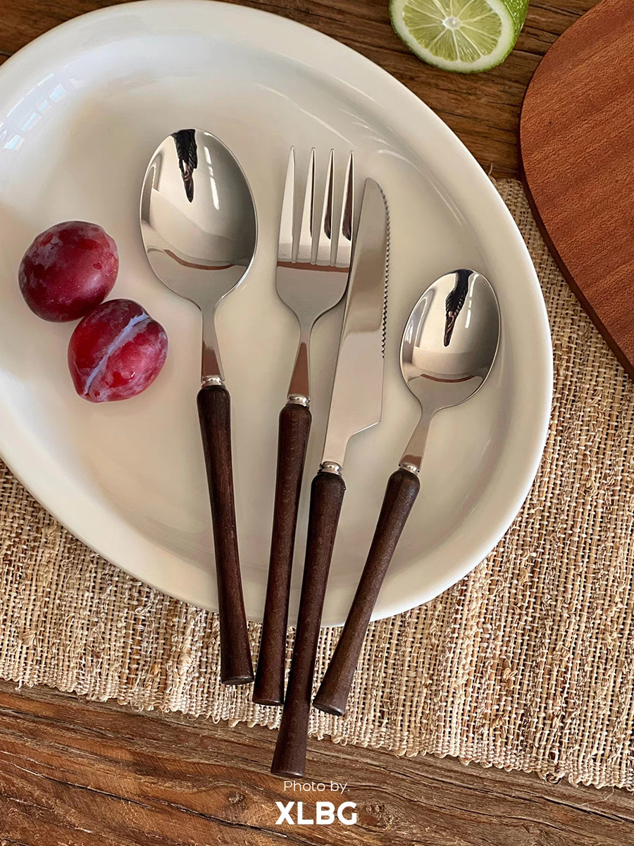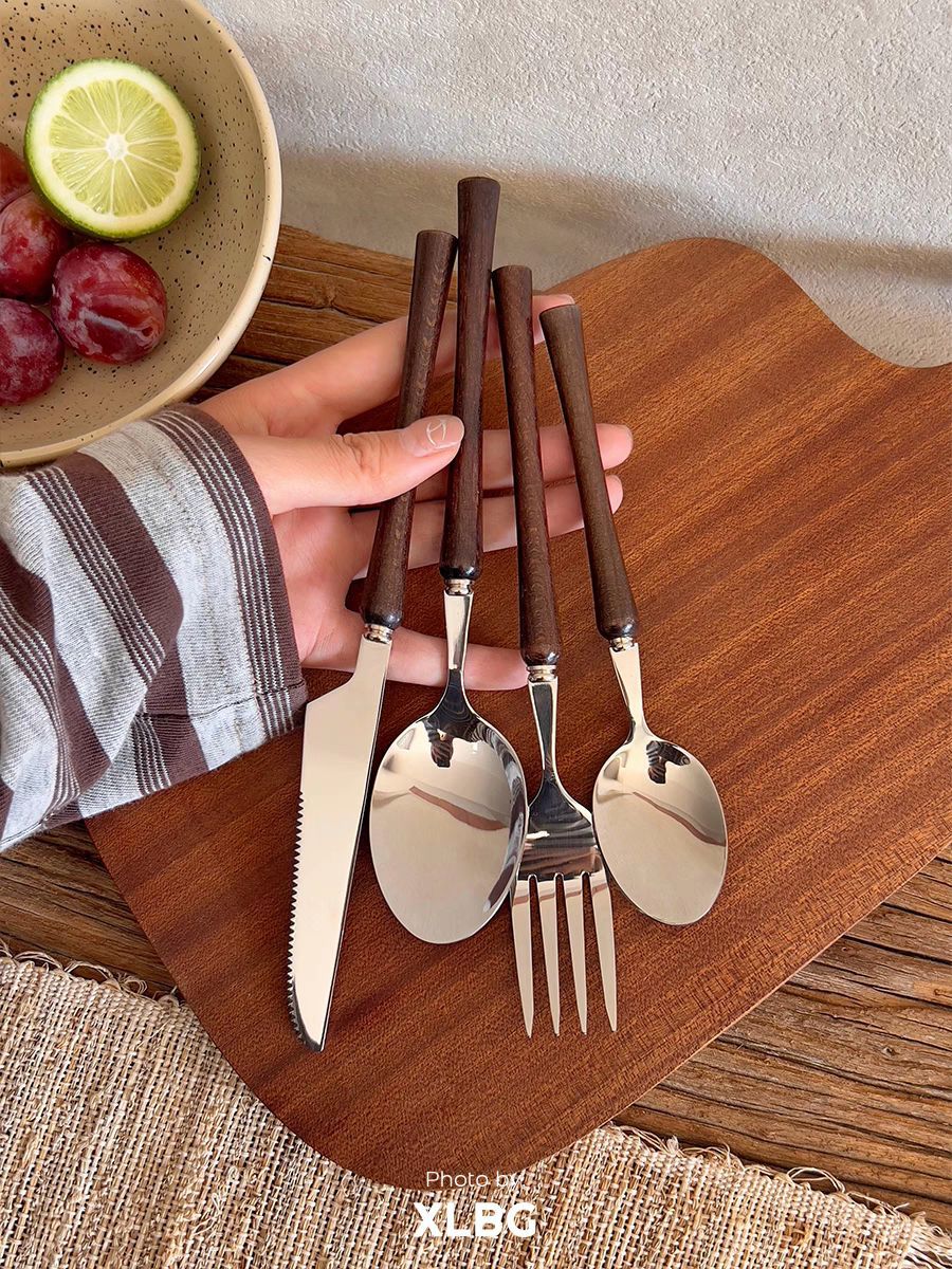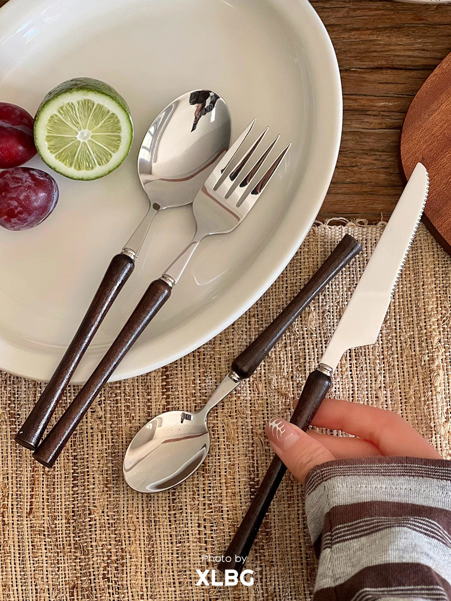 국경 304 스테인레스 스틸 나무 손잡이 작은 허리 나이프와 포크 스푼 빈티지 호두 나무 손잡이 나이프와 포크 호텔 나이프와 포크 스푼 식기