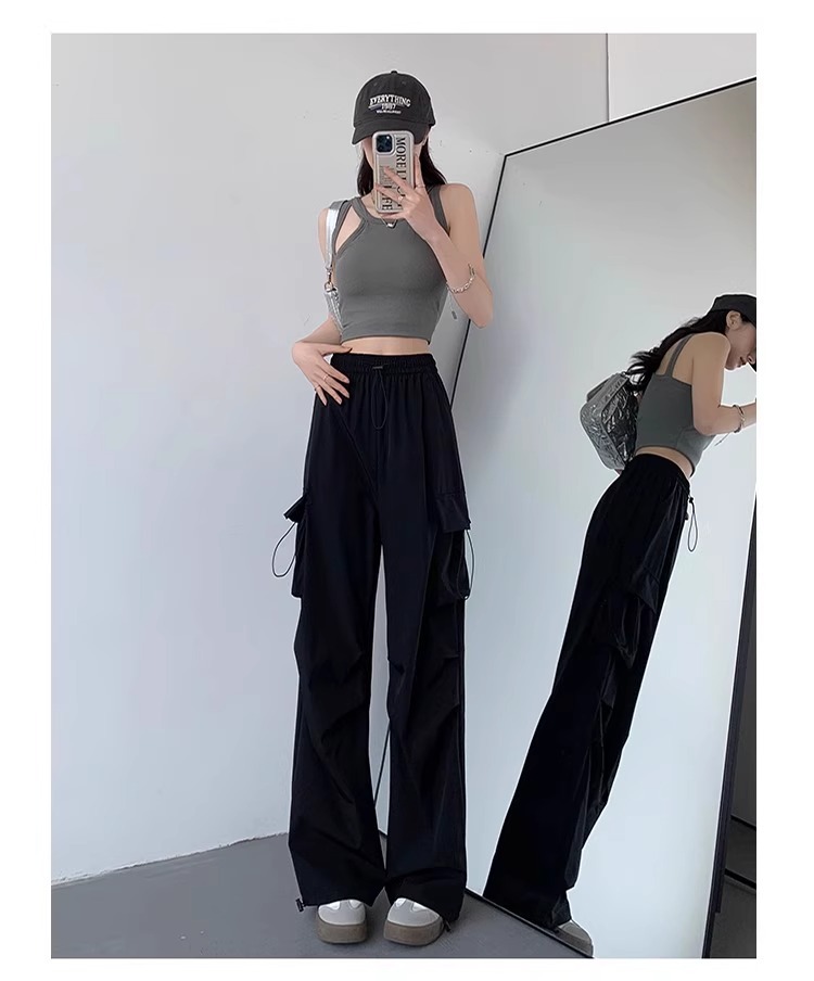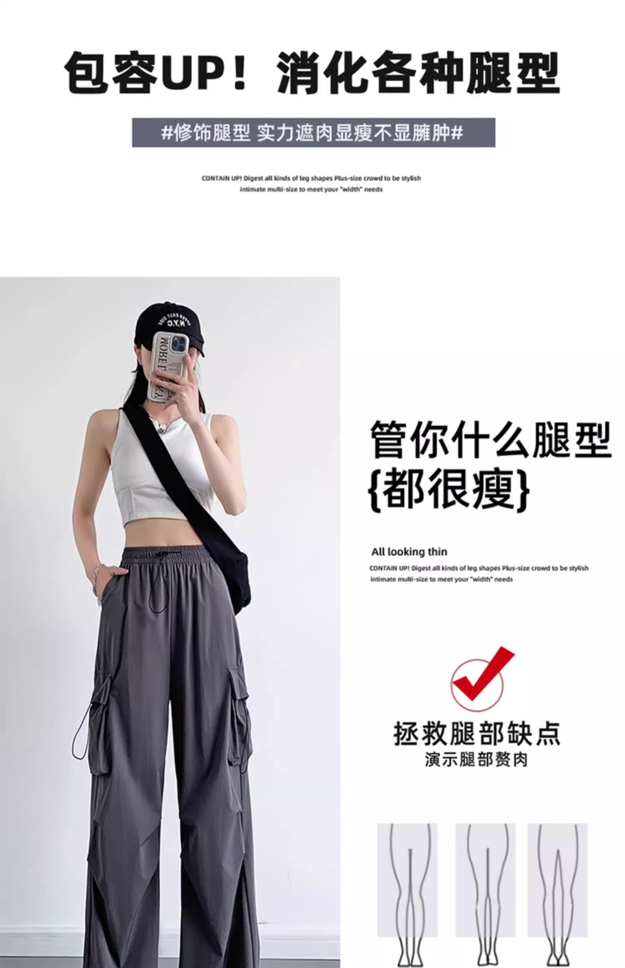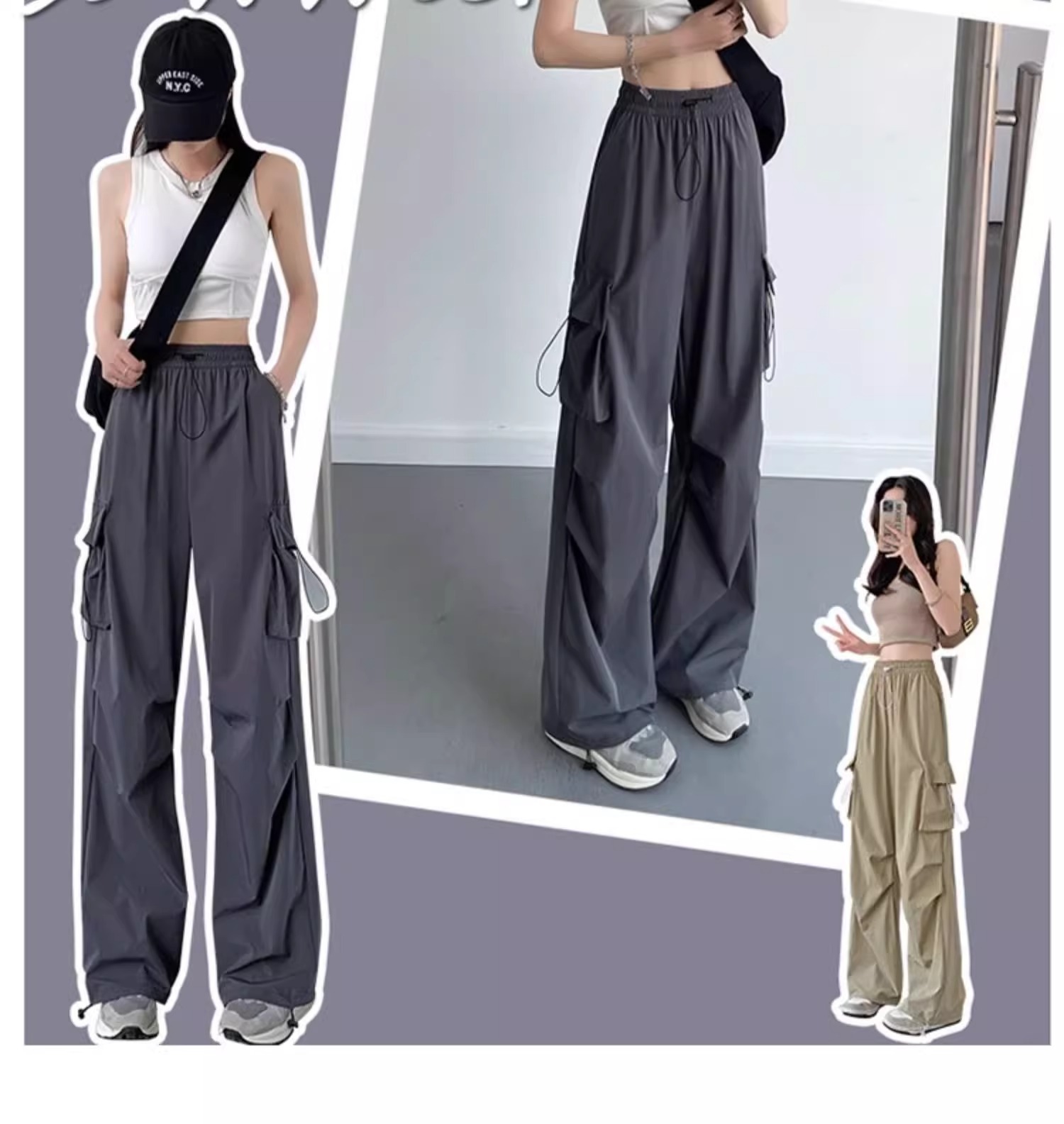 여름 여성용 플러스 사이즈 작업복 스트레이트 팬츠, 루즈하고 얇은 하이웨이스트, 다용도 드로스트링 등산 스포츠 및 레저 와이드 팬츠스토어 가기