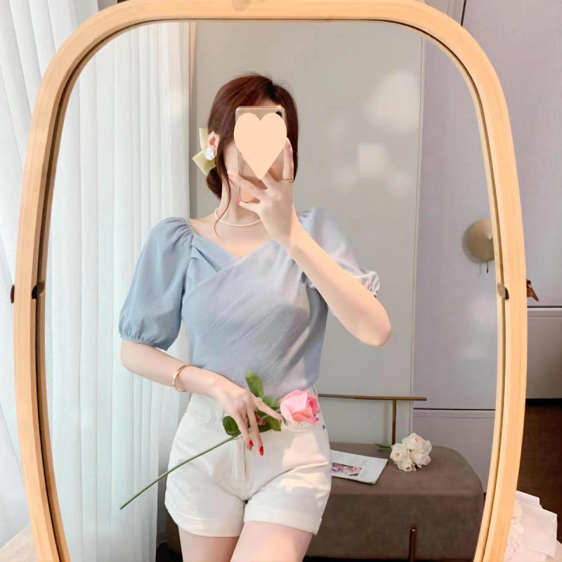 시폰 셔츠 칼라 반팔 여성 2025 여름 새로운 디자인 틈새 셔츠 퍼프 슬리브 패션 탑스토어 가기