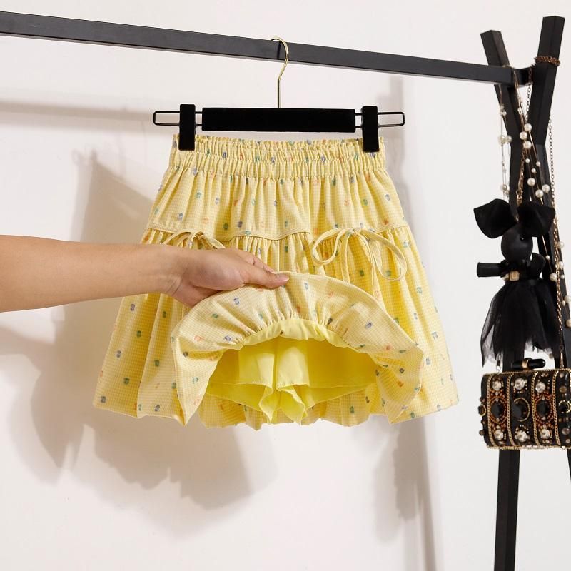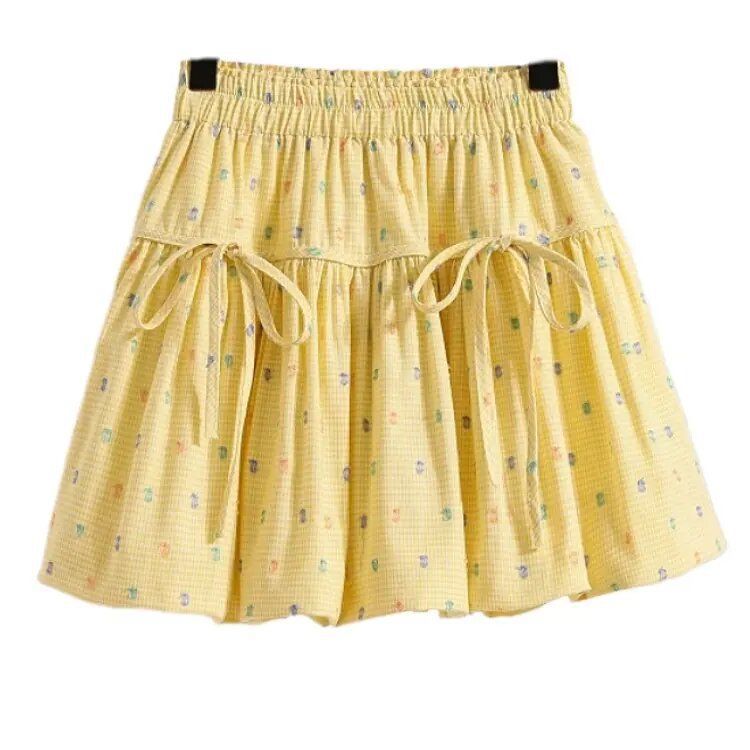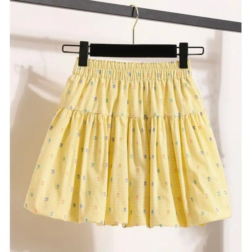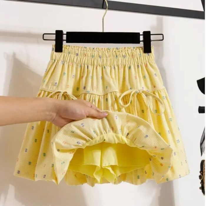2025 여자 노란색 꽃 무늬 하이 웨이스트 지방 슬리밍 프릴 a 라인 플리츠 스커트 여름 캐주얼 공주 스커트 유행