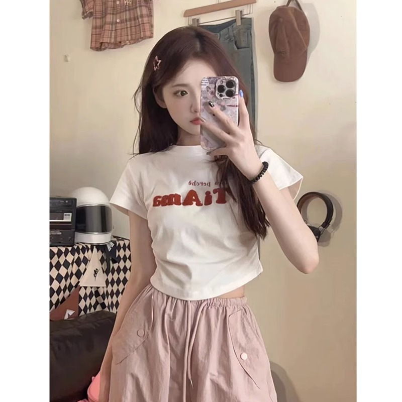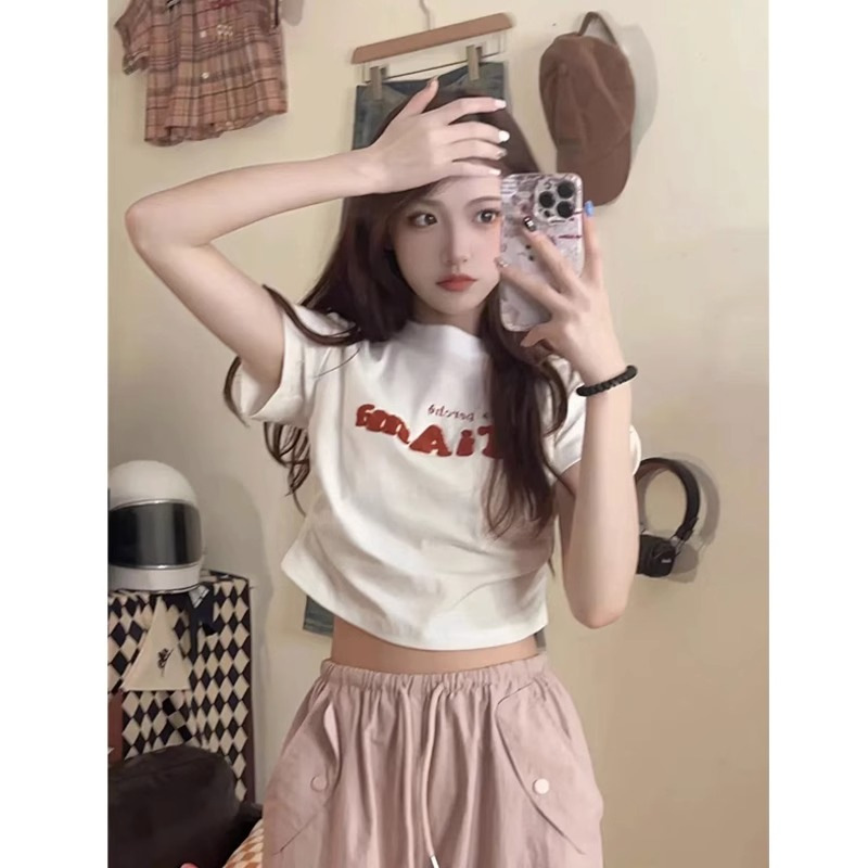 여아 순면 짧은 오른쪽 어깨 티셔츠 문자 입체 플록 자수 디자인 새로운 주름 흰색 탑스토어 가기