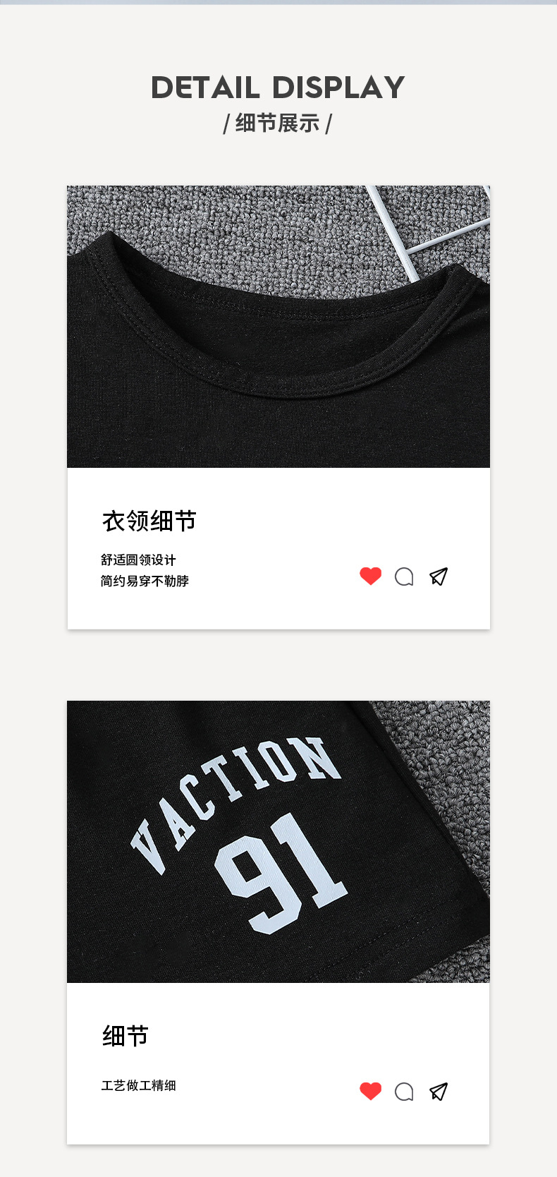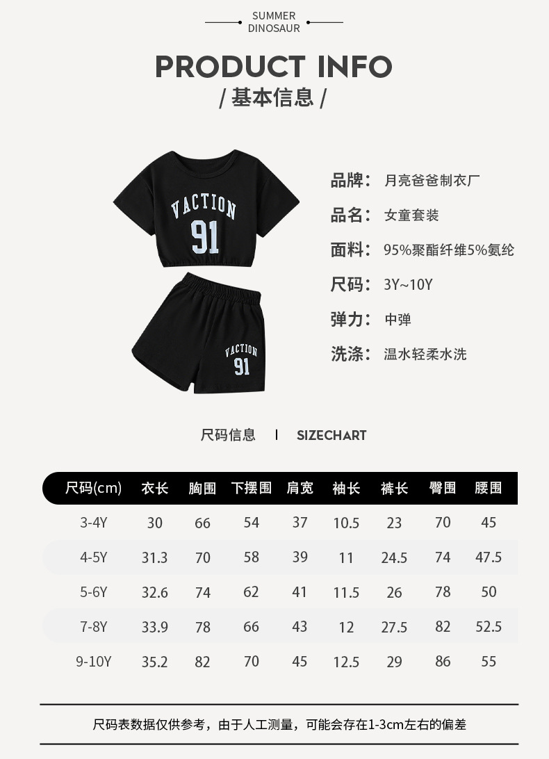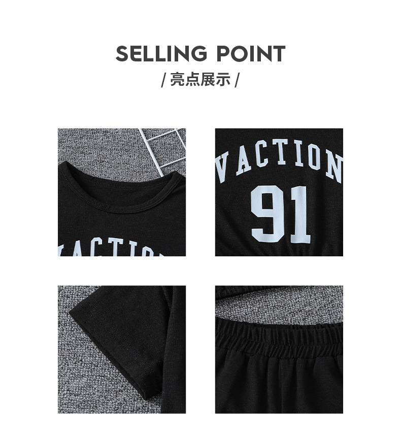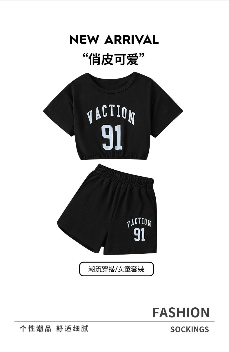 국경 간 소녀 스포츠 정장 검은 글자 인쇄 반팔 탑과 반바지 어린이 여름 투피스 세트
