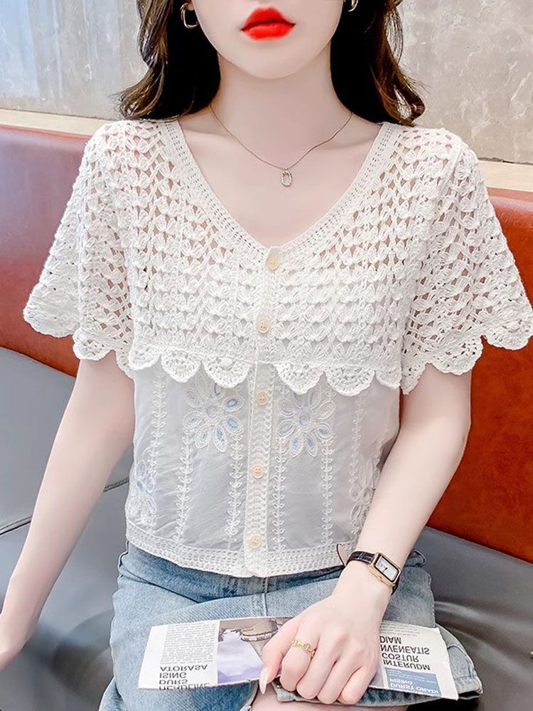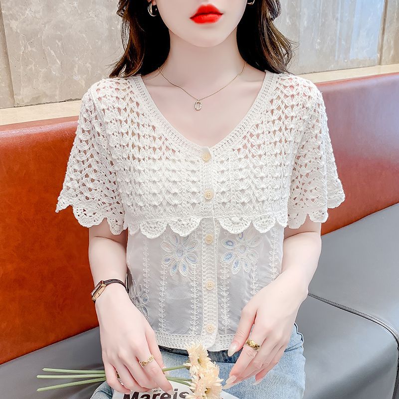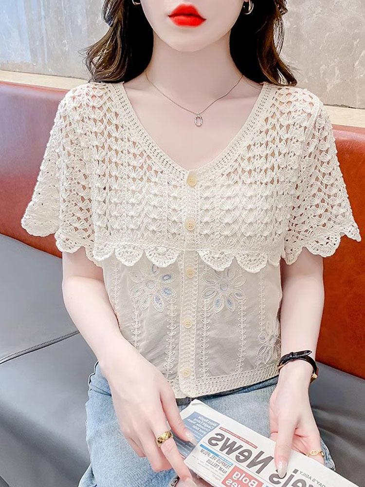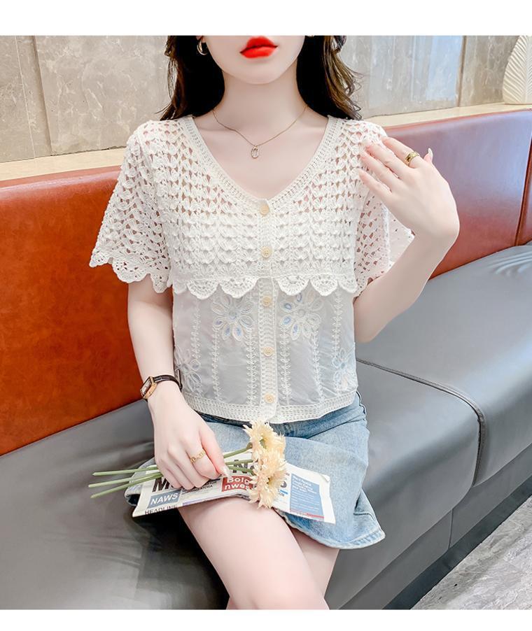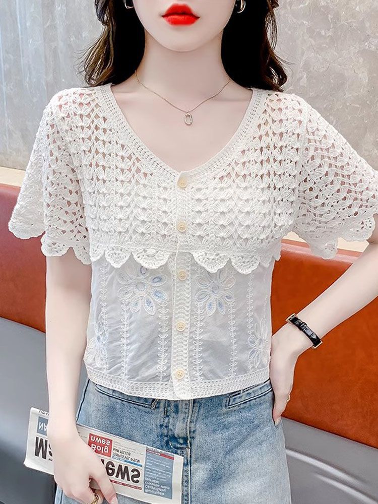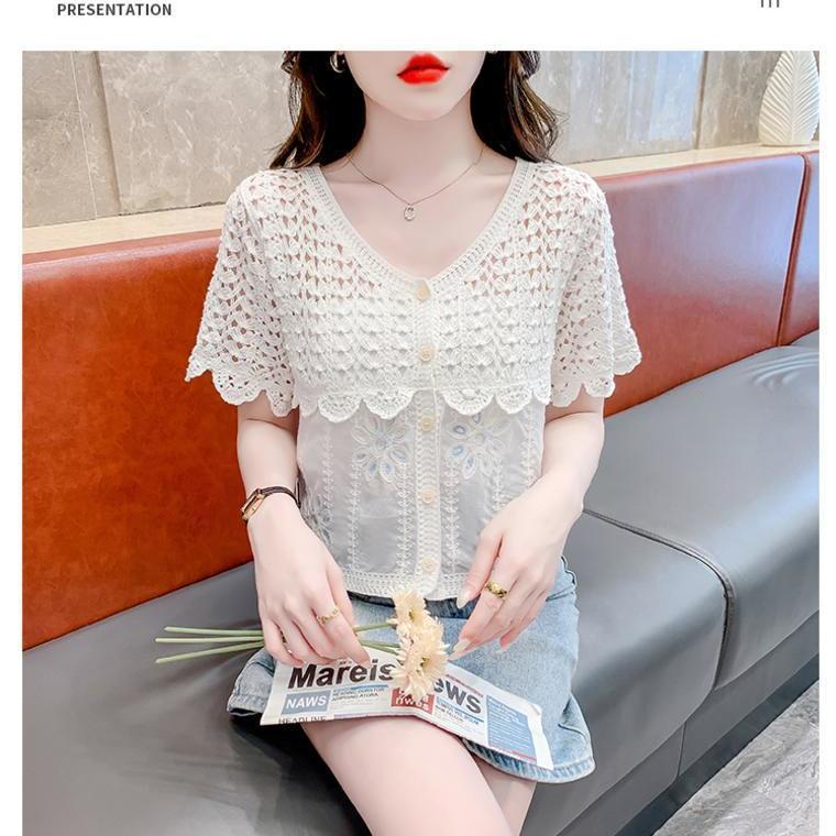 2025 프렌치 할로우 아크릴 자수 브이넥 스웨터 캐주얼하고 다재다능한 여성 여름 스타일 작은 향기로운 얼음 실크 셔츠 트렌디스토어 가기